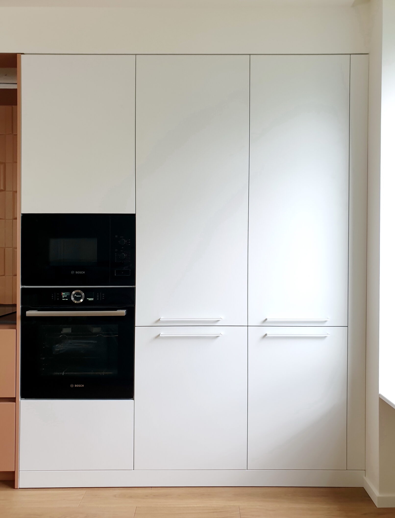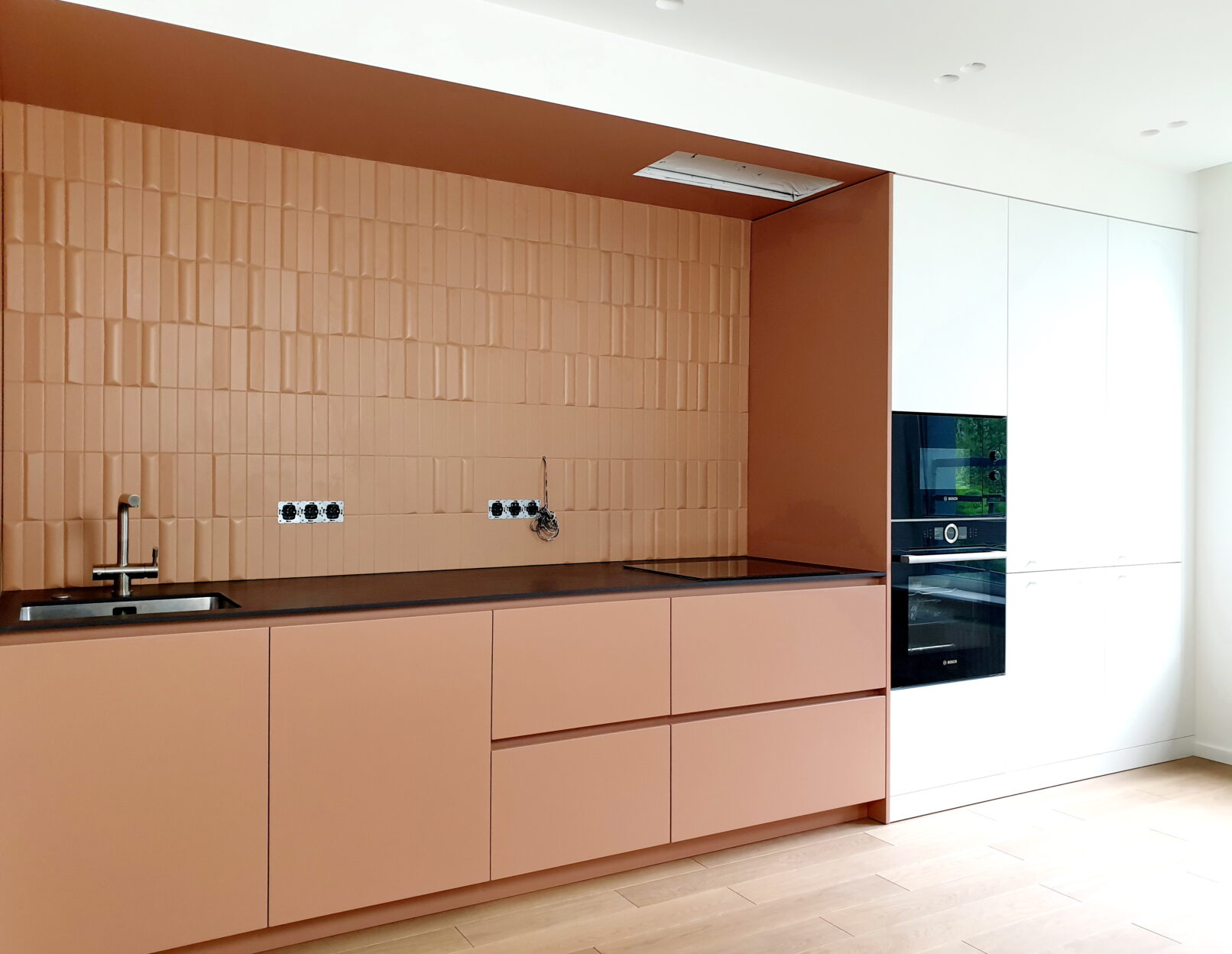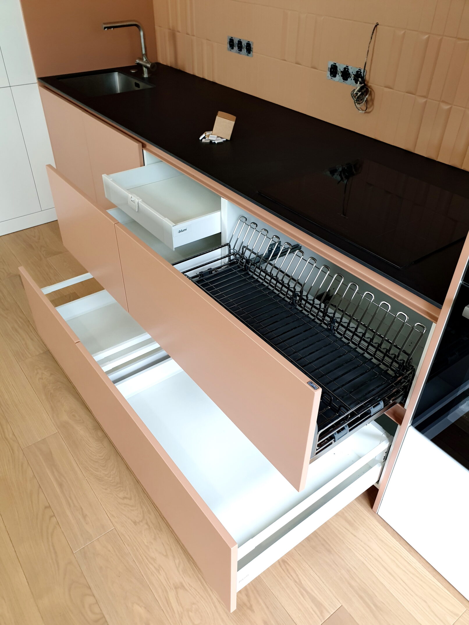 Ця бежева кухня поєднує у собі спокій м’яких кольорів та сучасну ергономіку. Матові фасади з фарбованого МДФ виконані в теплих бежево-персикових тонах, які по-різному розкриваються під денним і штучним освітленням.