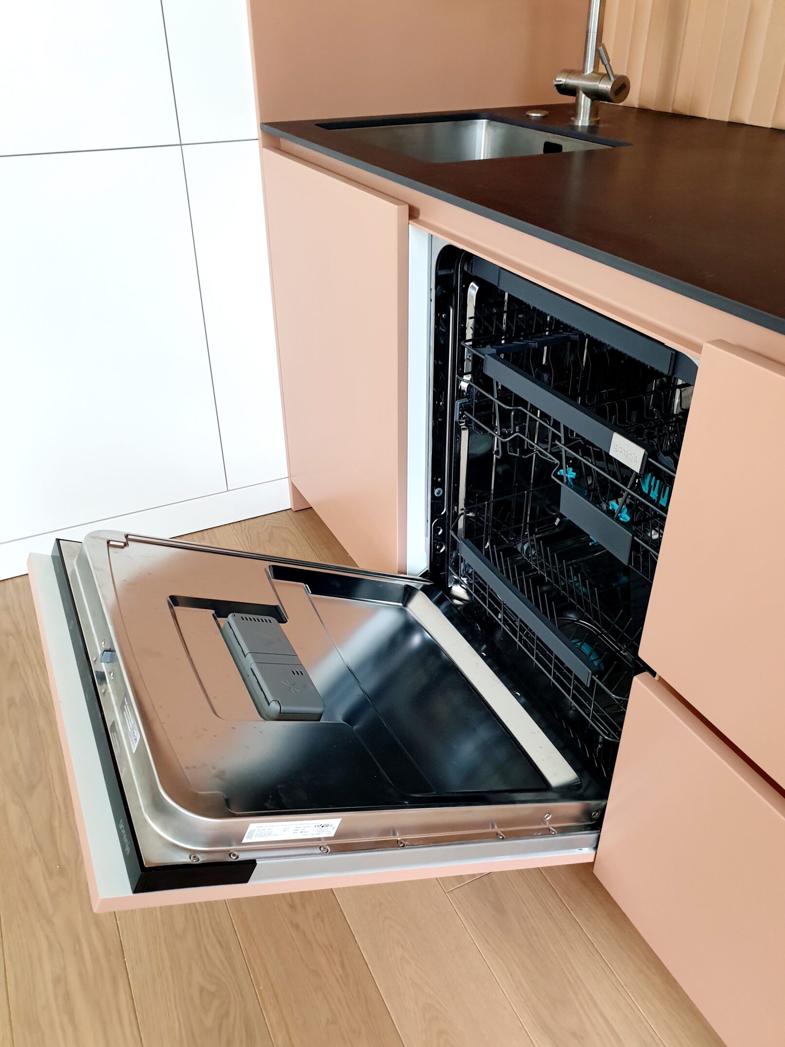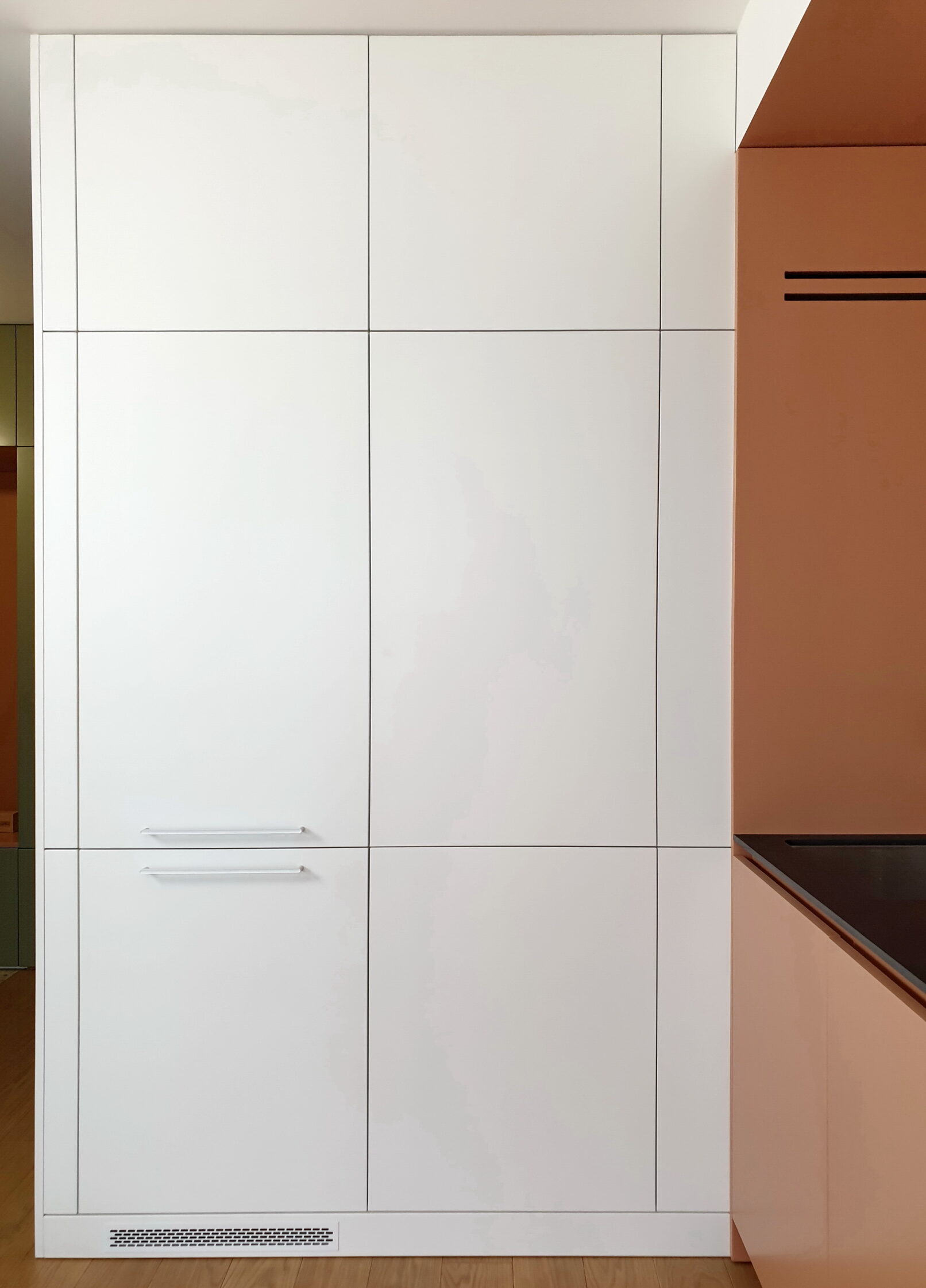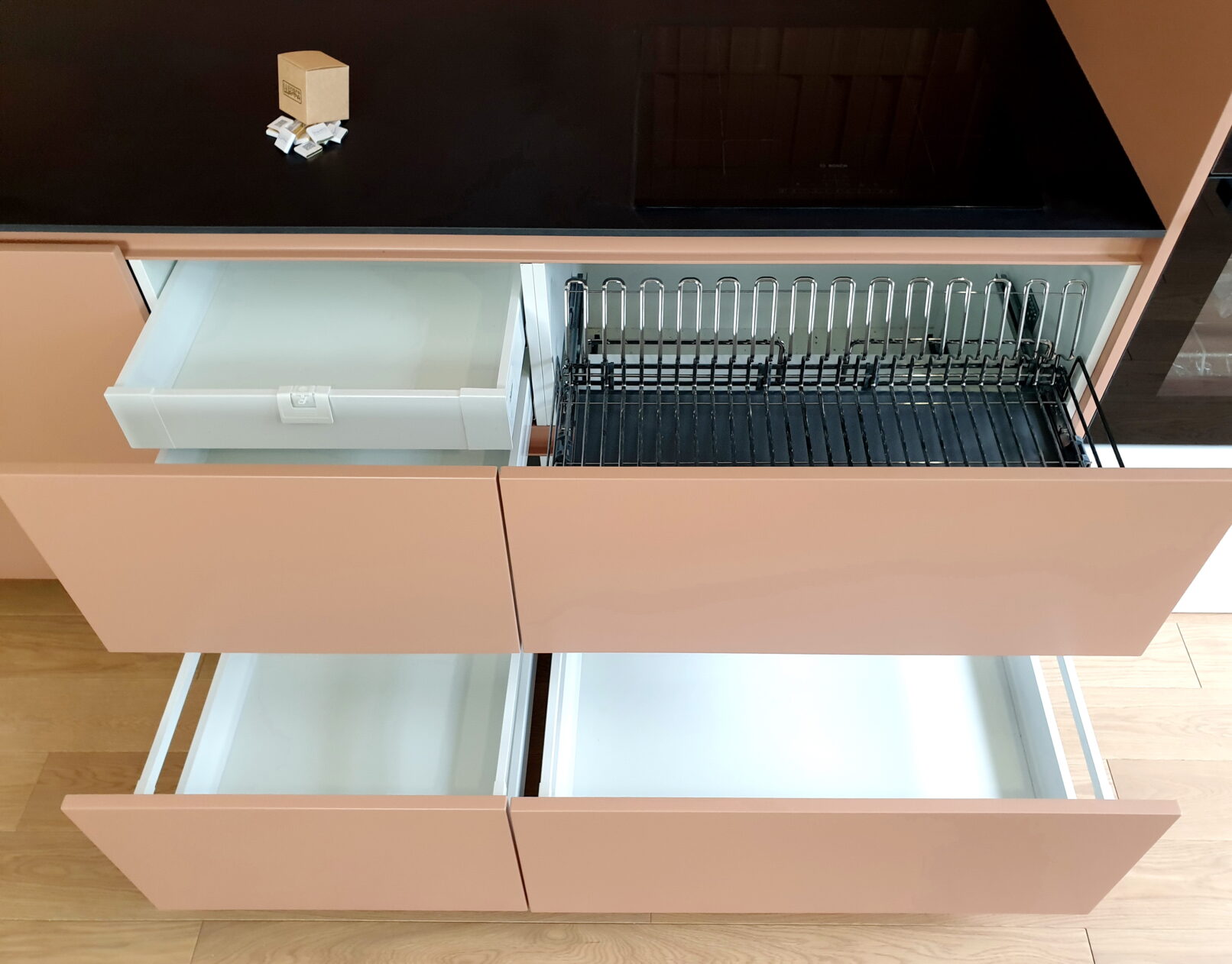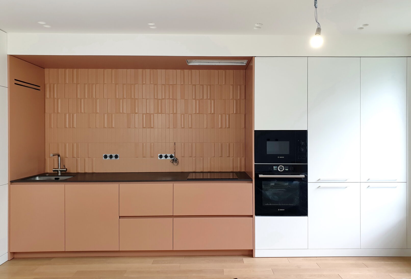 Ця бежева кухня поєднує у собі спокій м’яких кольорів та сучасну ергономіку. Матові фасади з фарбованого МДФ виконані в теплих бежево-персикових тонах, які по-різному розкриваються під денним і штучним освітленням.