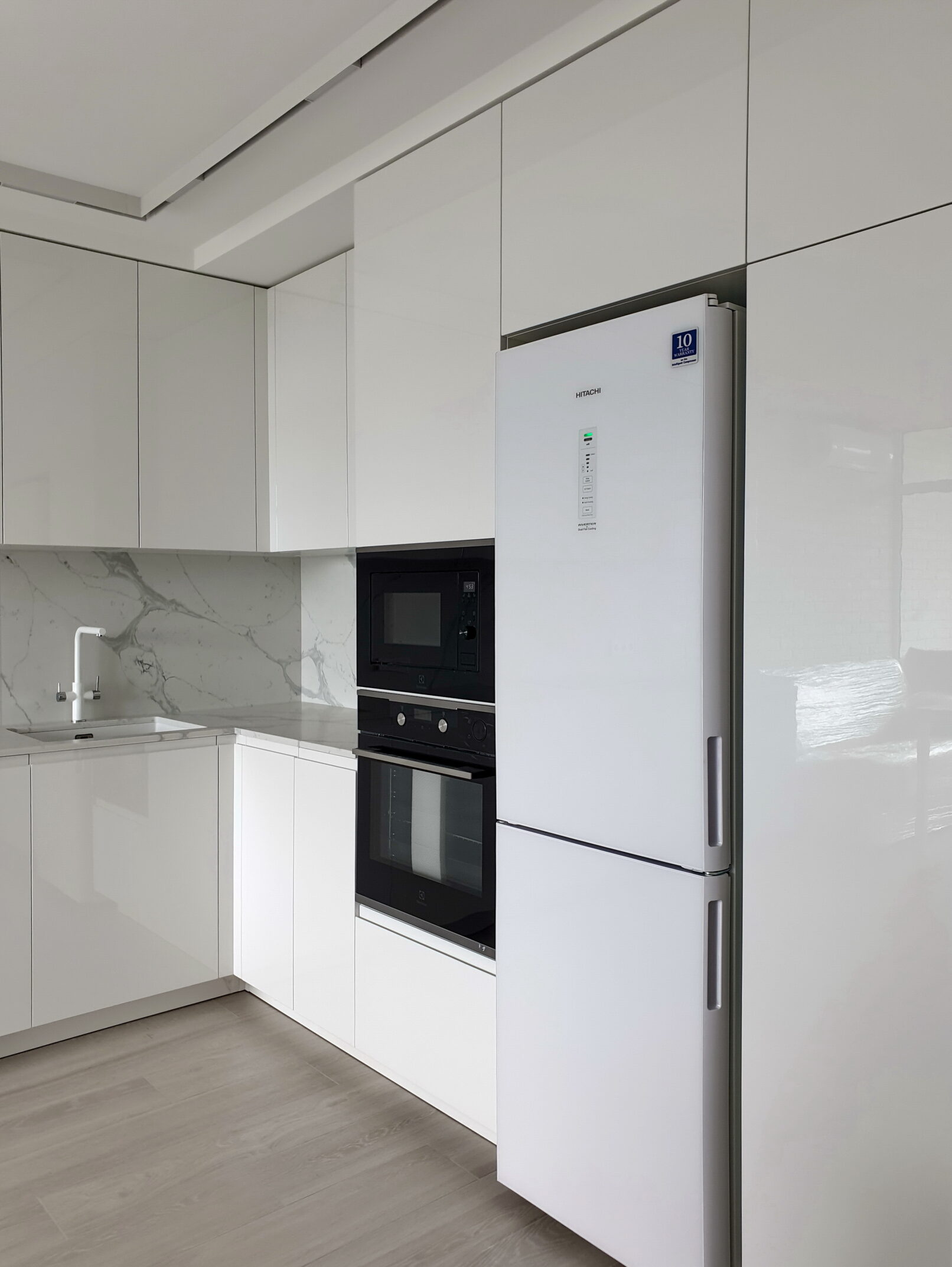 Ця біла глянцева кухня була зроблена під запит клієнта, який хотів максимум функціоналу без візуального шуму. І ми це реалізували.