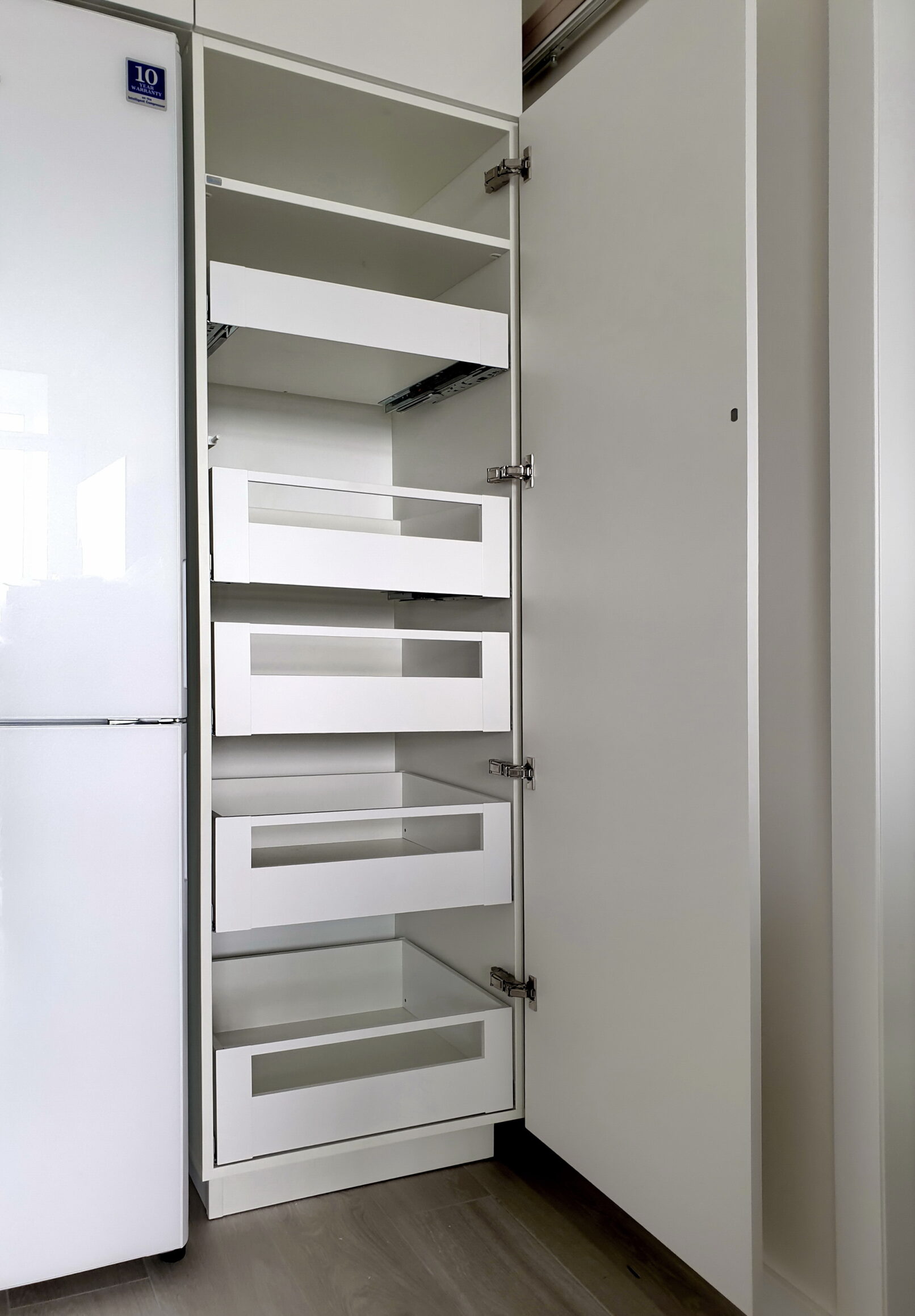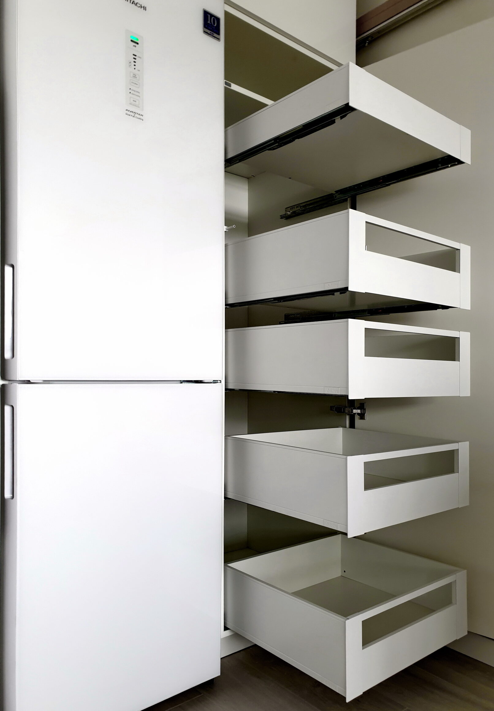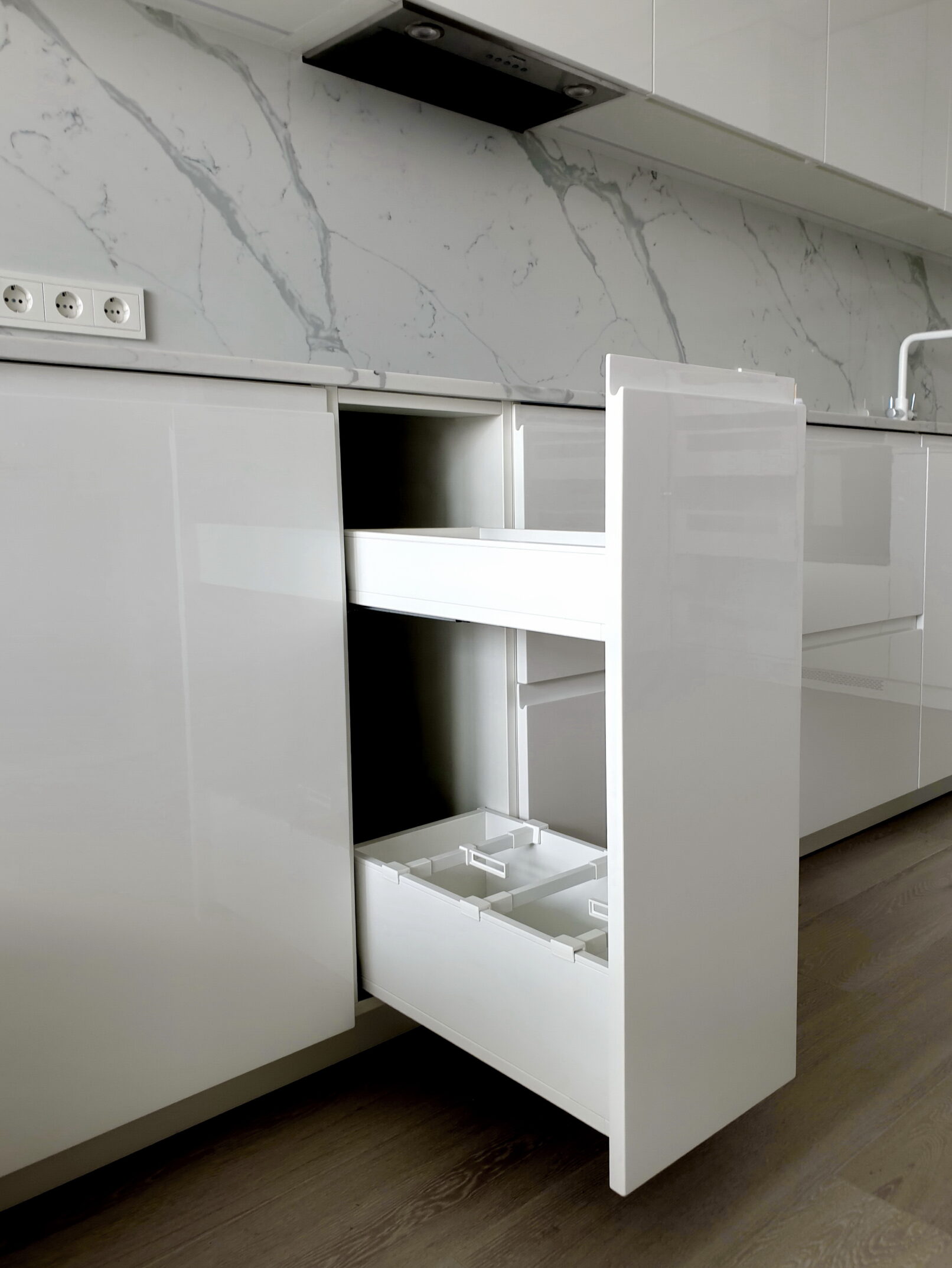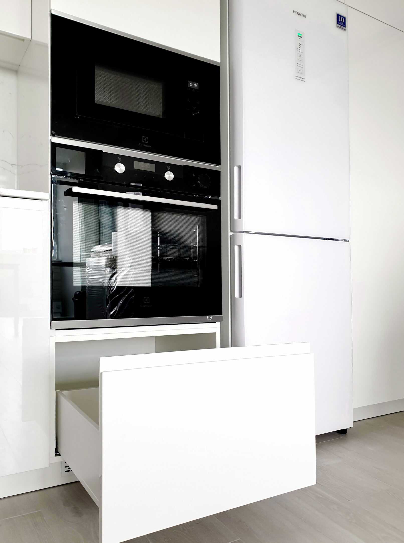 Біла глянцева кухня під ключ без зайвих зусиль. Ідеально рівні фасади, що рефлексують світло, візуально розширюють простір і створюють відчуття чистоти навіть у похмурий день. Але справа не лише у вигляді. У кожному ящику стоїть надійна фурнітура, а в нижній базі організовано розділені шухляди Legrabox для зручного зберігання. Пенал з внутрішніми шухлядами дозволяє зручно ховати усе, що має бути під рукою, але не на виду.