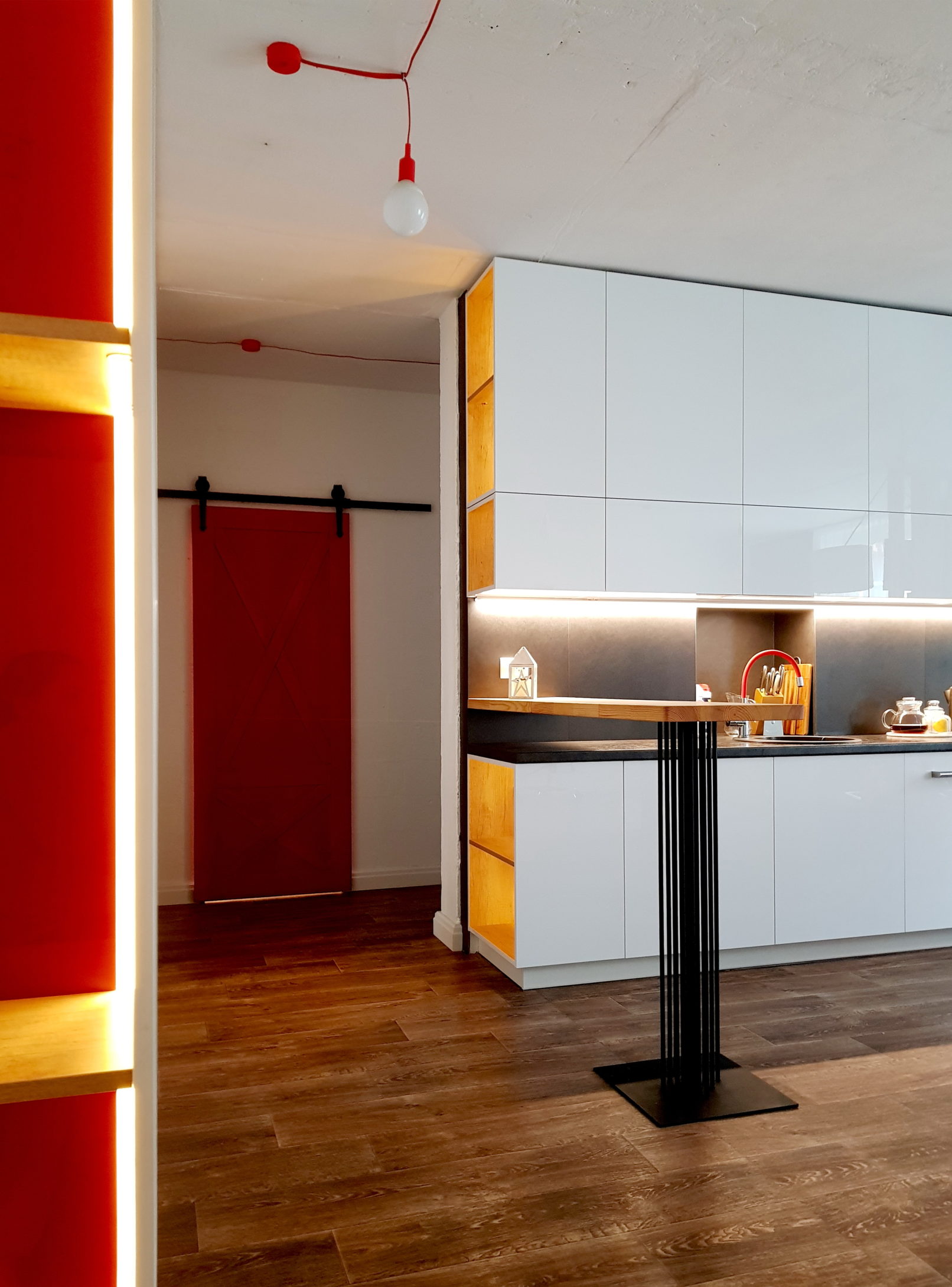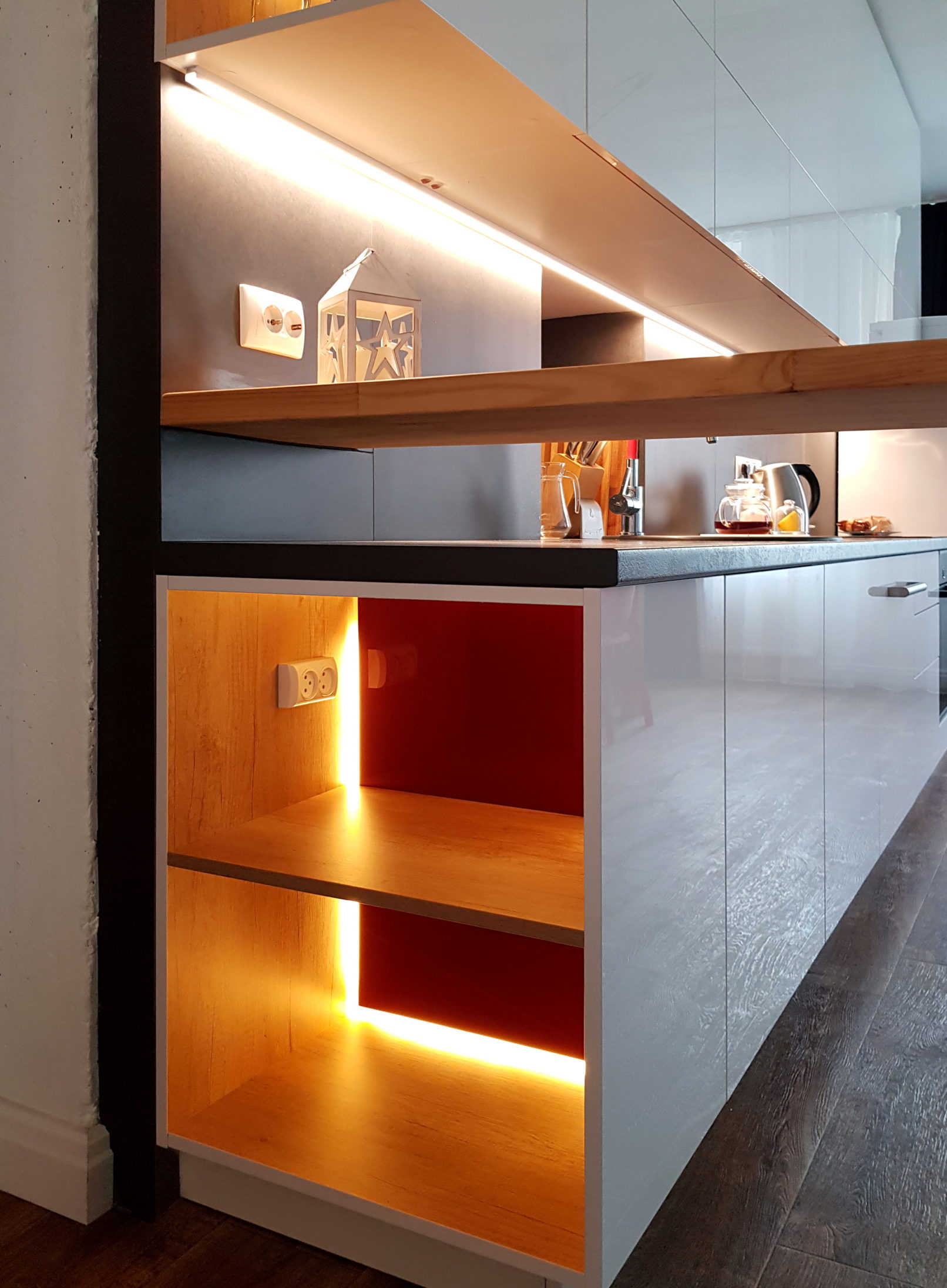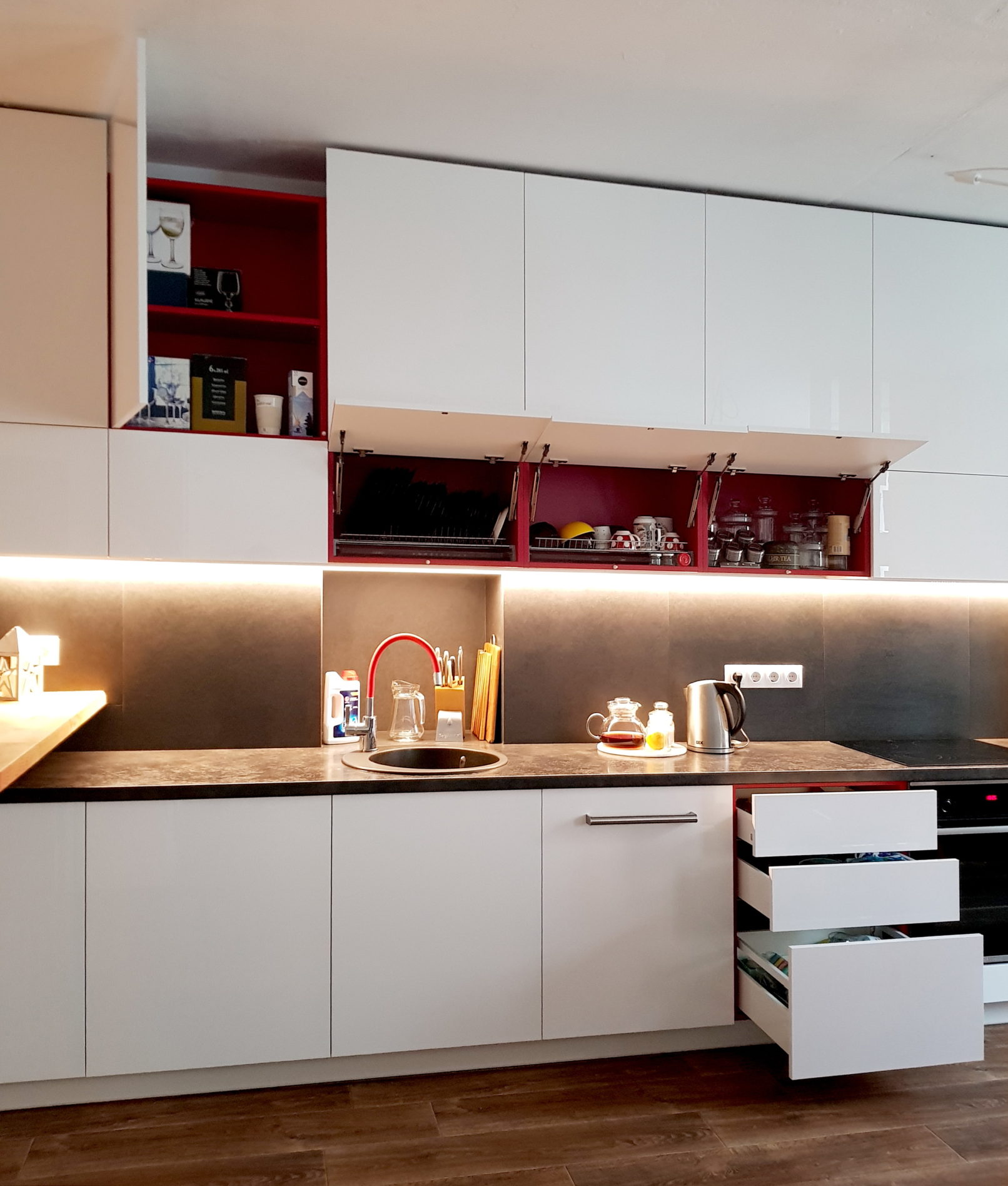 Зовні біла, всередині – червона і гаряча. Ця кухня точно не про сірі будні. Вона, як ідеальна жінка: вдень – практична й зручна, а ввечері – інтригуюча, з вогником. Поки гості бачать стриманий мінімалізм, господарі знають головну таємницю – червоне серце цієї кухні приховане за глянцевими фасадами. LED-підсвітка, продумані ніші, витончені механізми відкривання та зручне зберігання – усе для того, щоб ви насолоджувались кожною хвилиною тут.