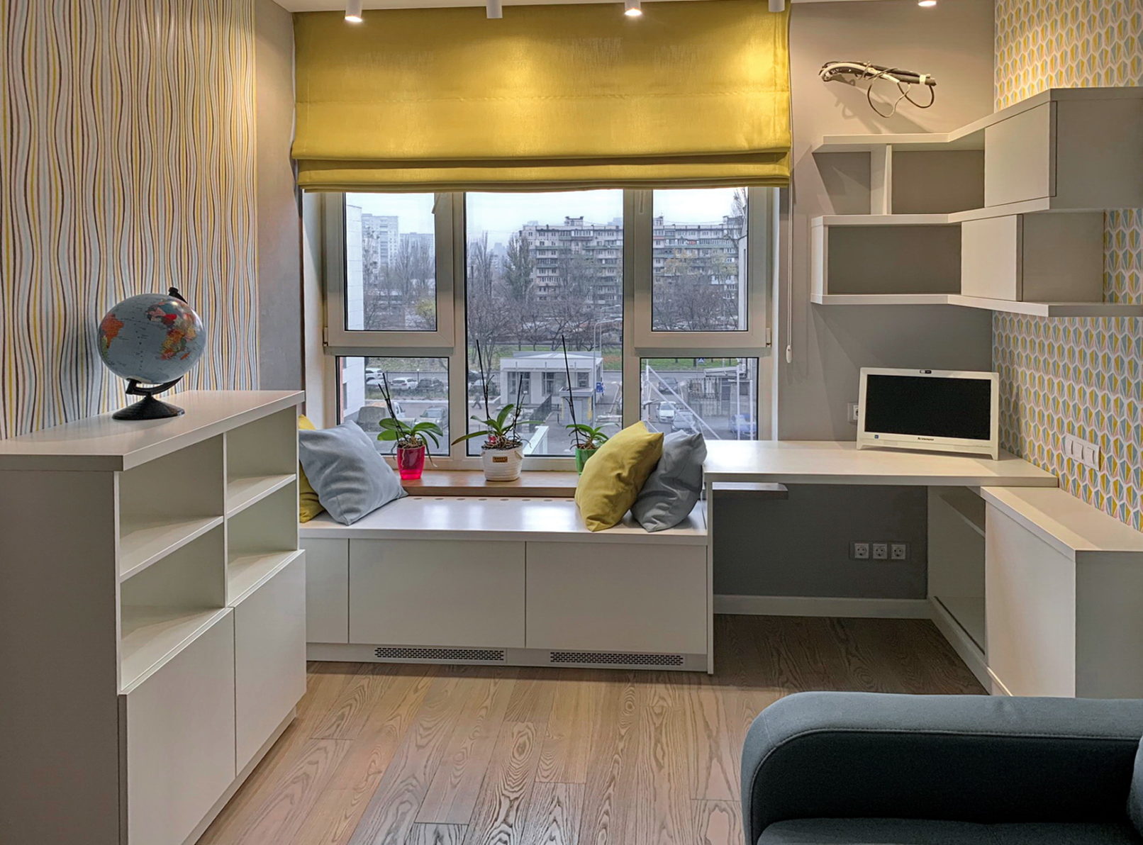 Головний акцент – підвіконна зона з ящиками та подушками, що служить як сховище, лавка й місце для читання. Робоча зона облаштована ергономічним столом, відкритими й закритими полицями, щоб усе було під рукою. Завдяки білому кольору меблів кімната виглядає просторішою, а яскраві акценти на стінах додають життя й характеру.