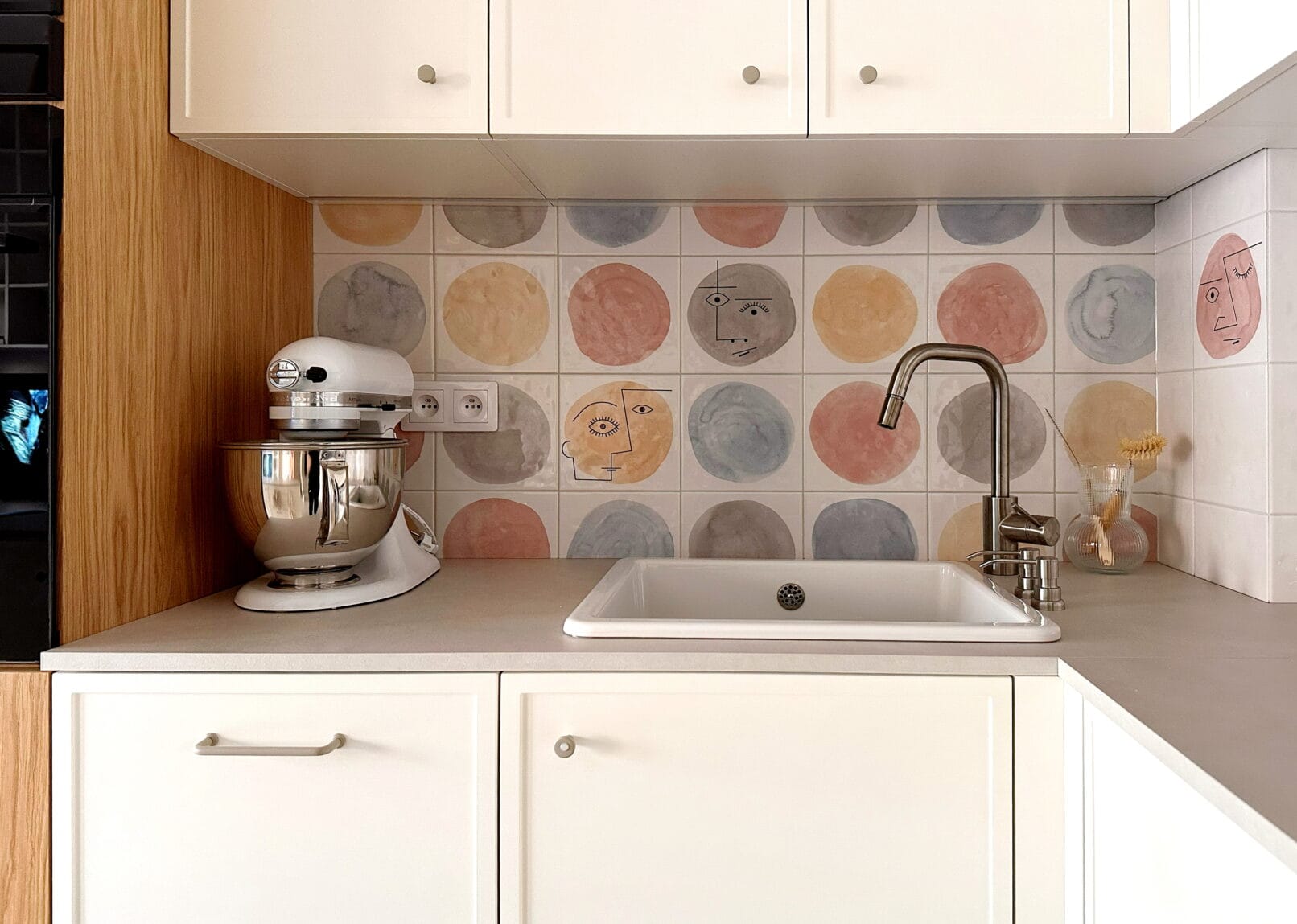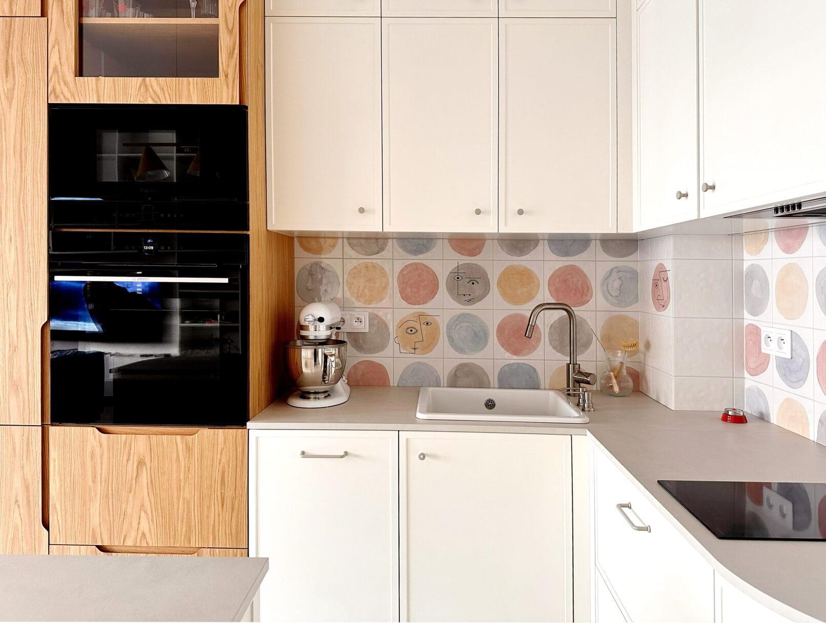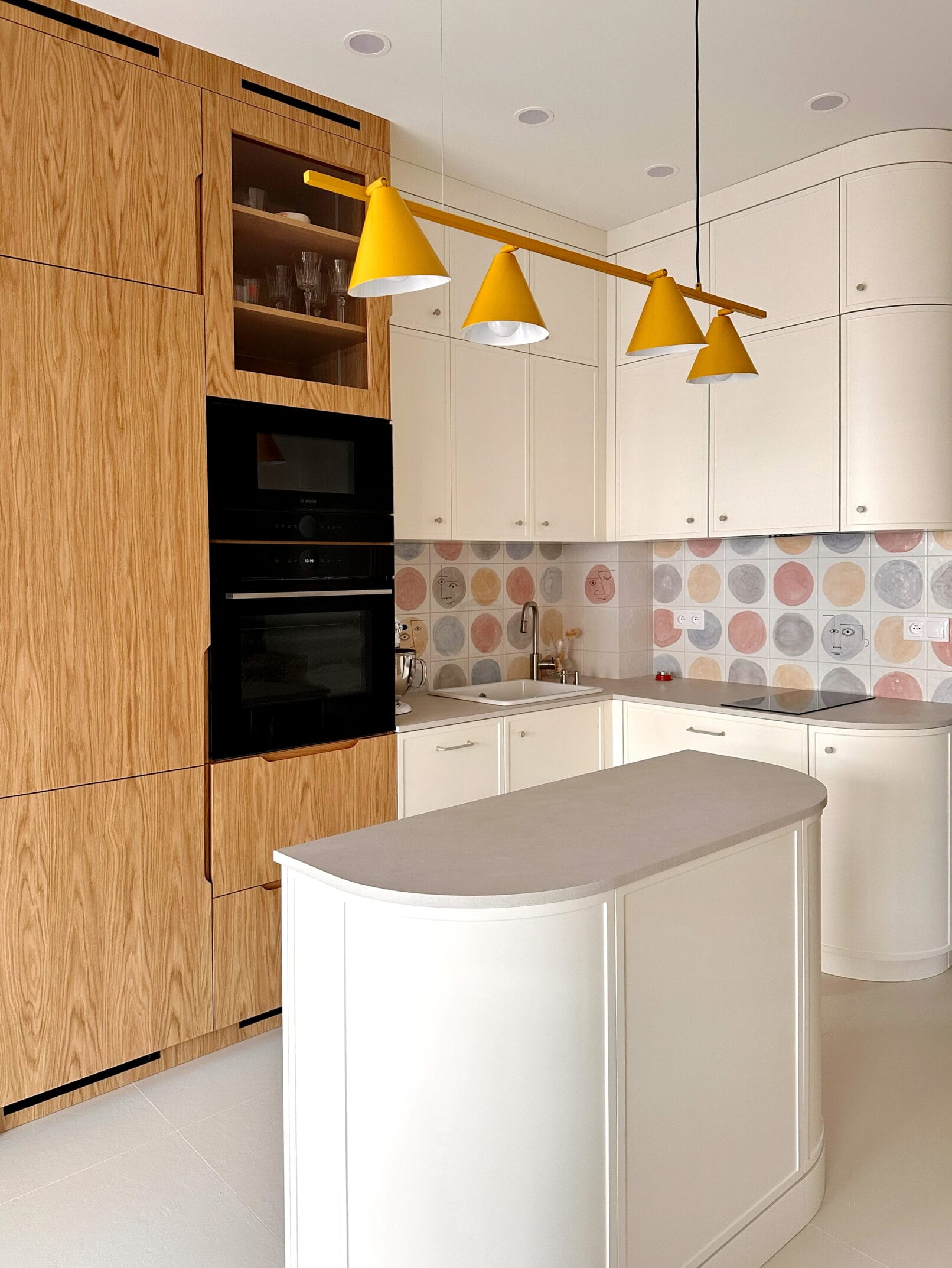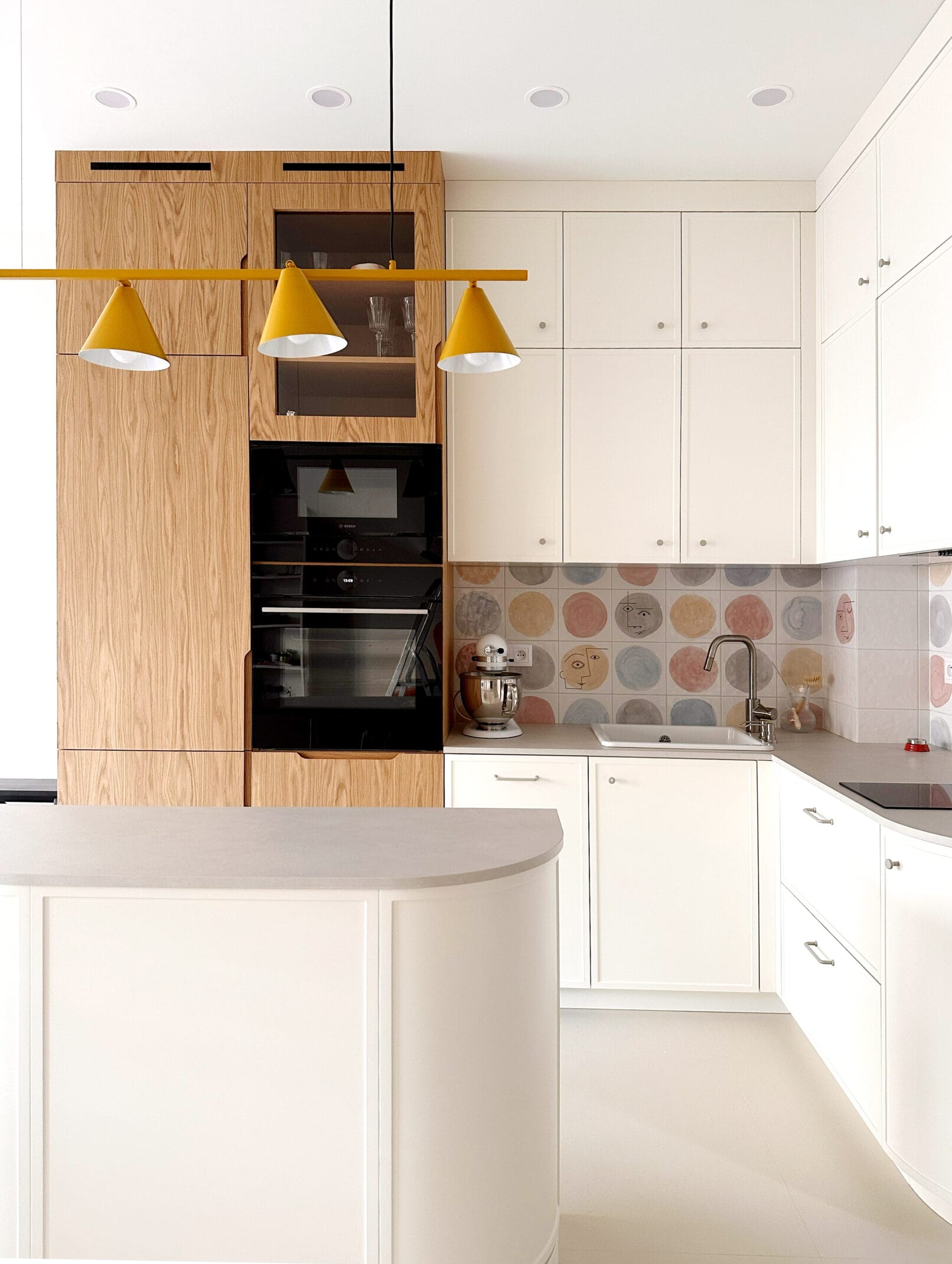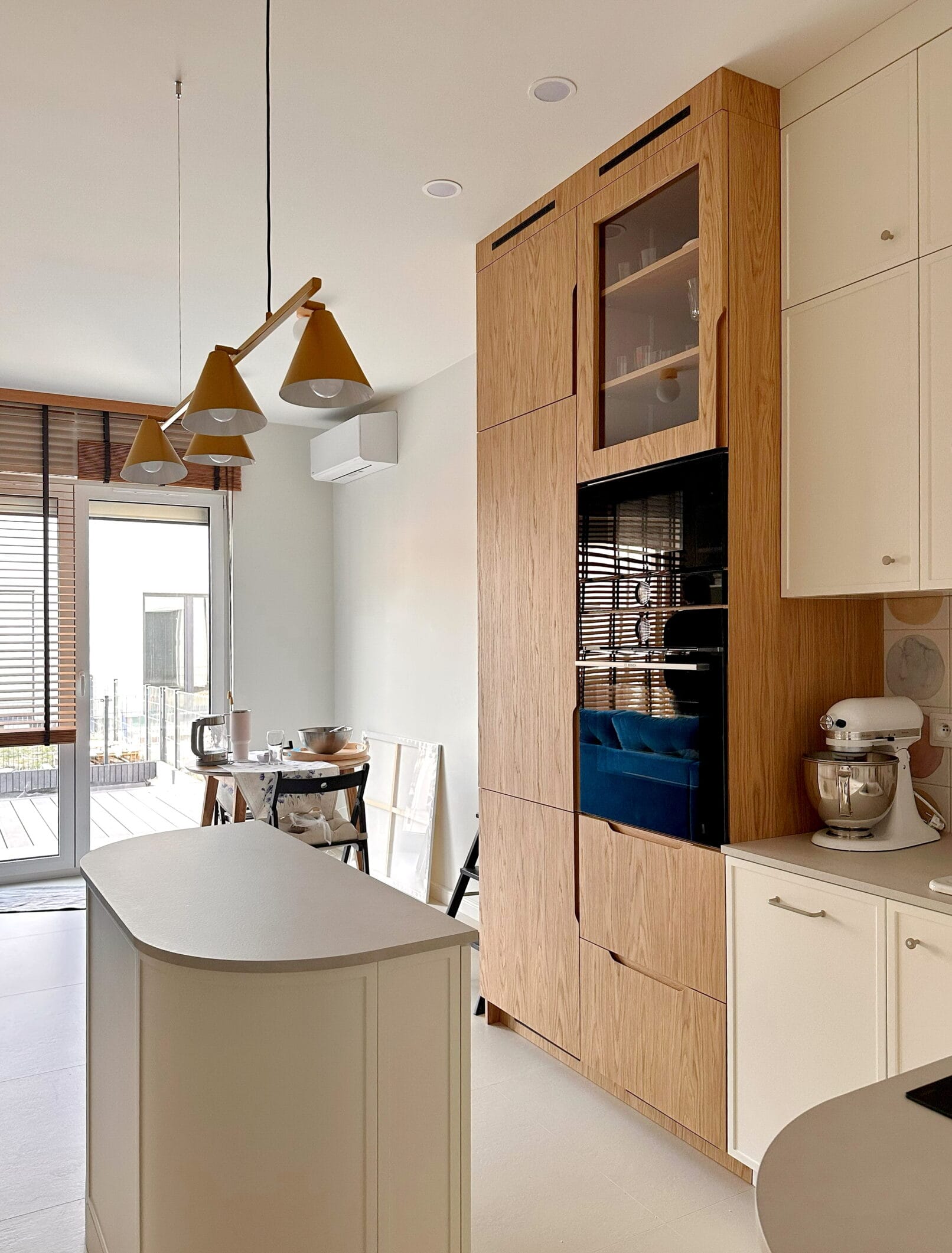 Ця кухня поєднує в собі сучасний стиль, натуральні матеріали та продумані деталі. Ми використали комбінацію фарбованих фасадів і дерев’яного шпону, щоб створити затишну атмосферу, яка залишається актуальною незалежно від трендів. Світлі відтінки візуально розширюють простір, а тепле дерево додає гармонії.