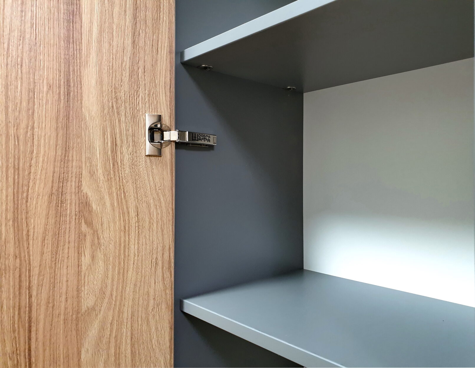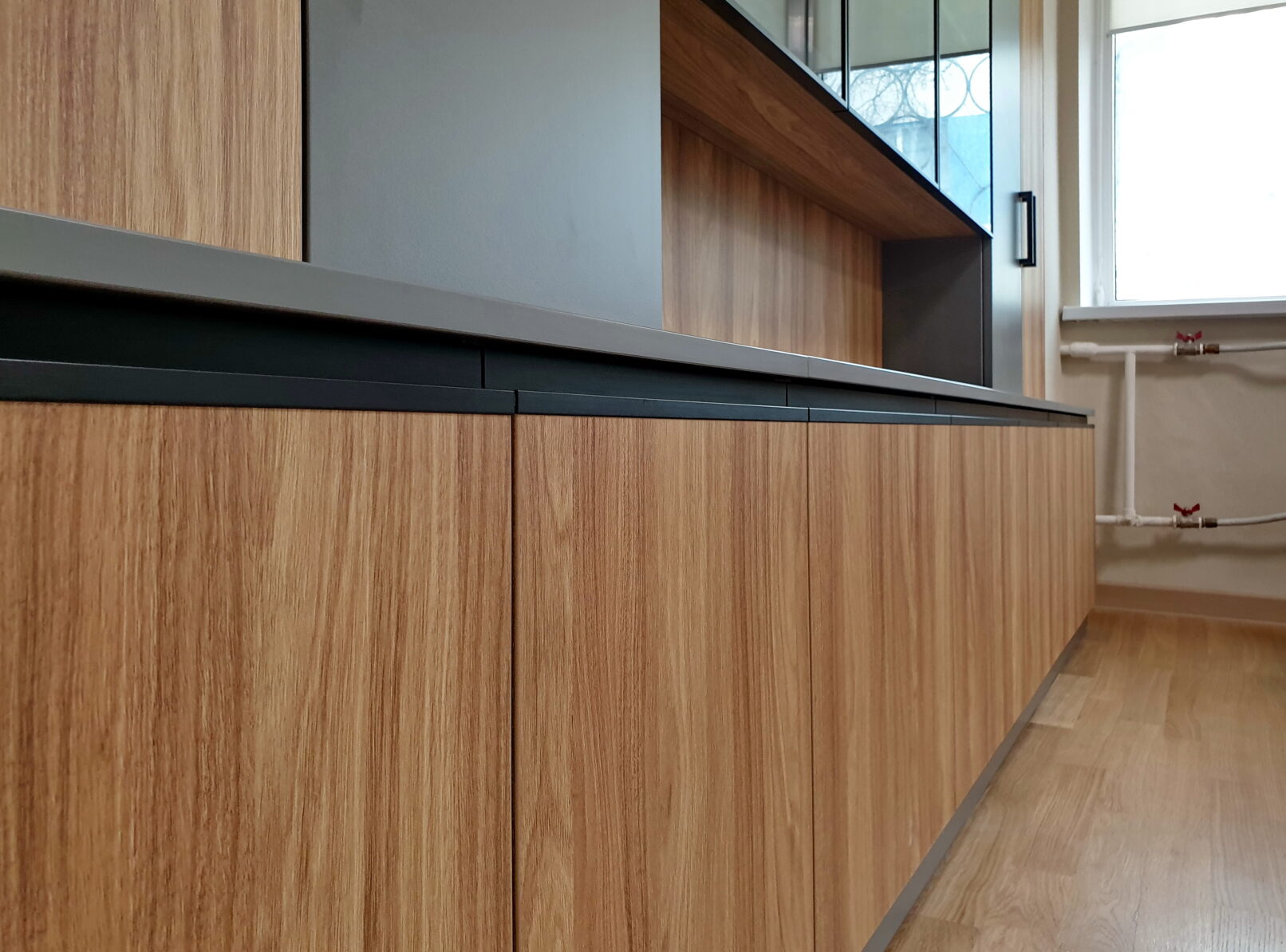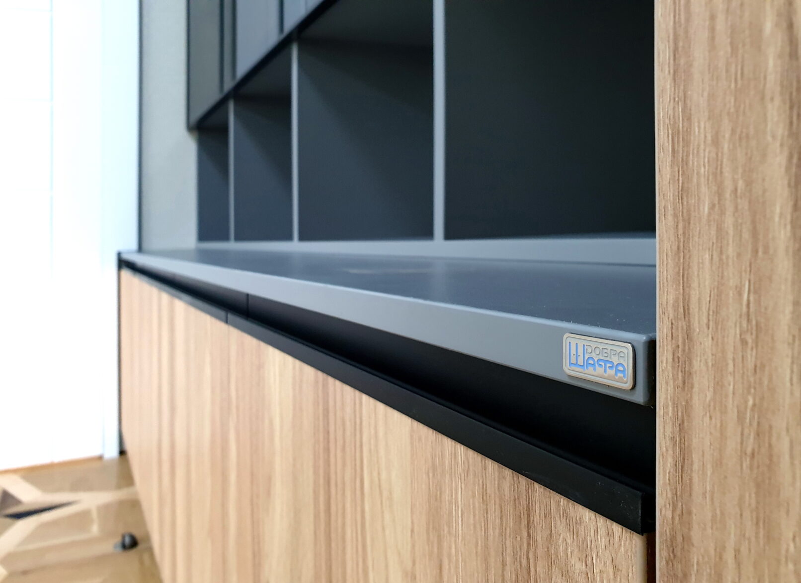 Поєднання теплих деревних декорів з графітовими вставками створює відчуття впевненості й смаку. Металеві елементи підкреслюють статус, скляні фасади з алюмінієвими рамками додають легкості, а велика кількість відкритих і закритих відділень дозволяє організувати простір без хаосу.