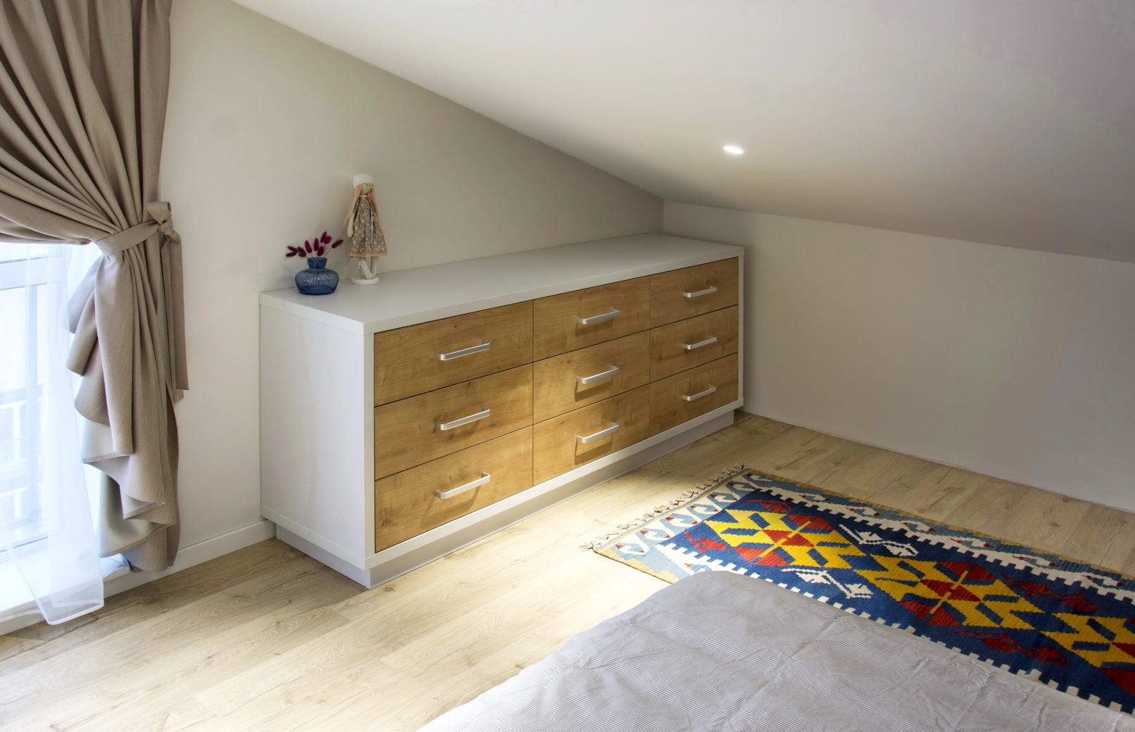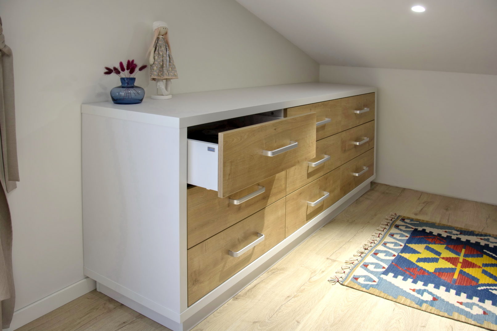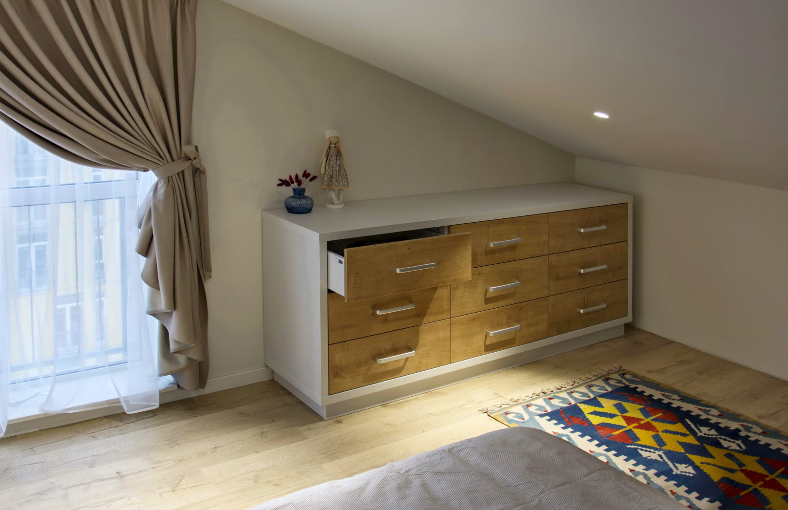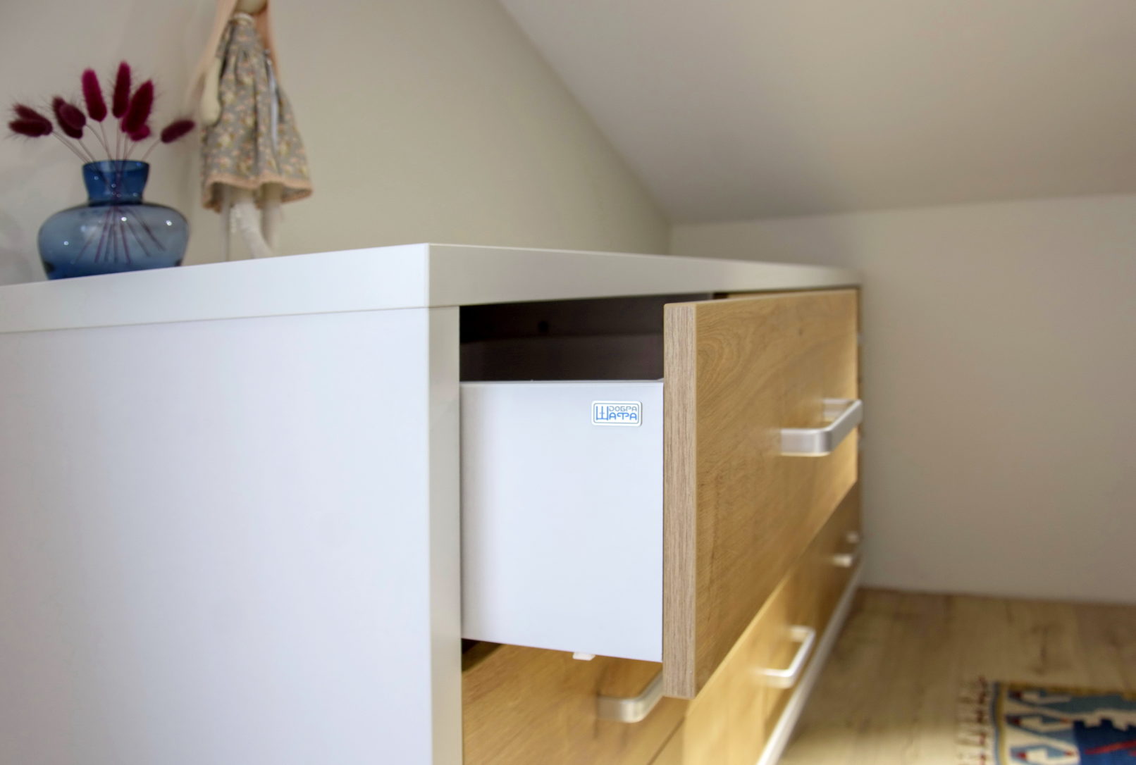Комод в спальню від меблевої майстерні Добра Шафа ідеально вписався під мансардний нахил. Жодного сантиметра втрачено – усе продумано до міліметра. 10 глибоких шухляд, що легко висуваються, тримають порядок навіть там, де в інших – хаос.