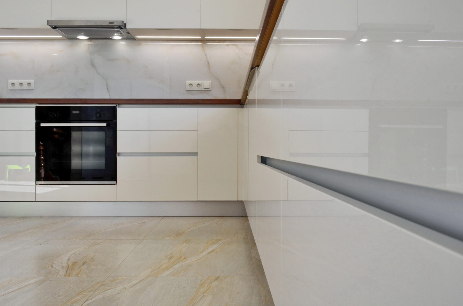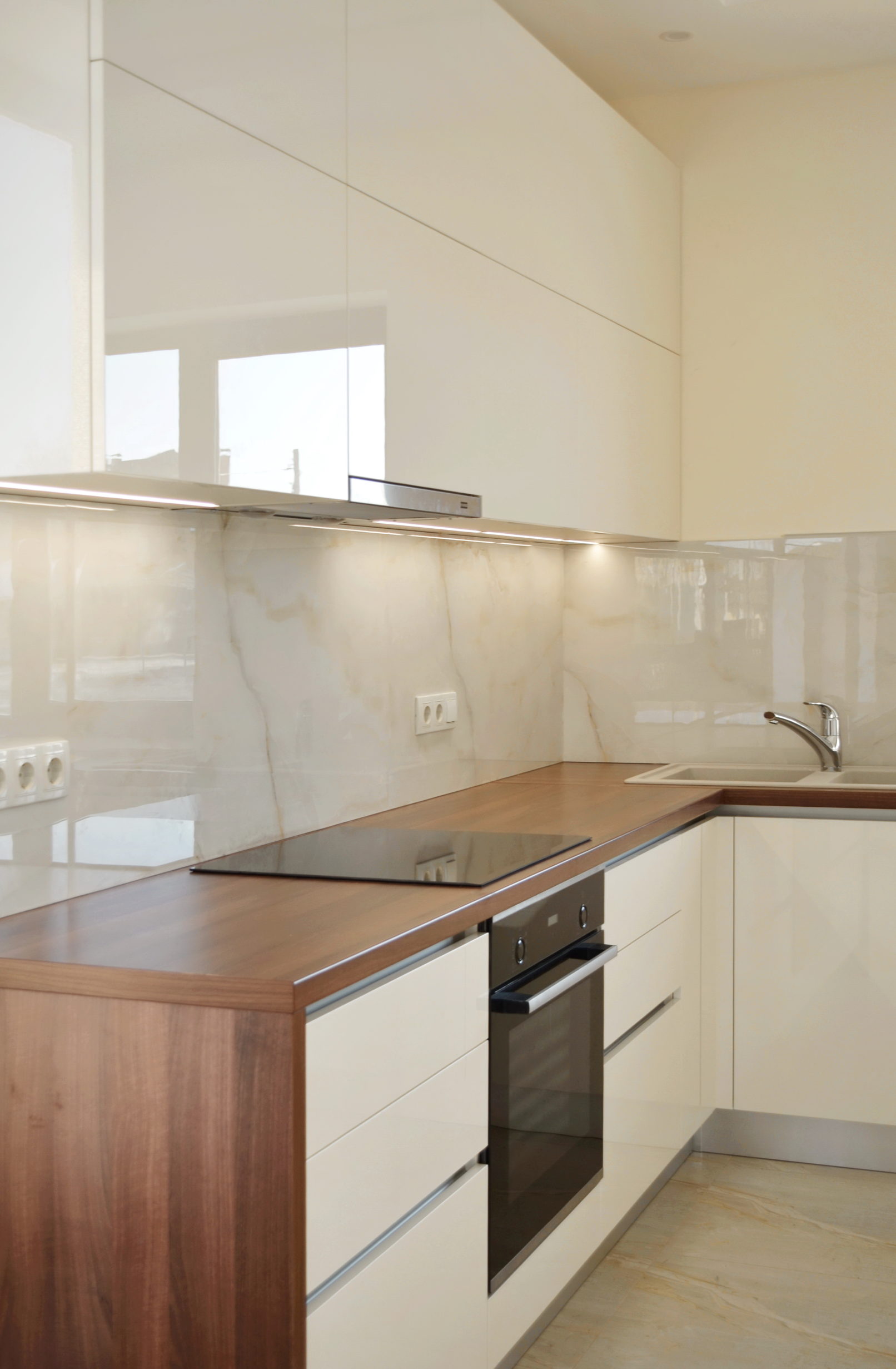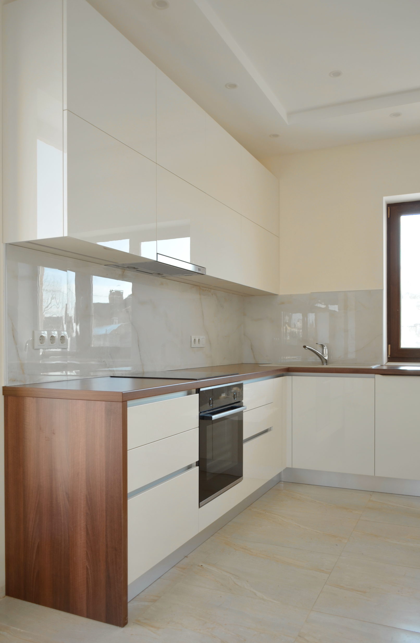 У цьому проєкті ми використали глянцеві фасади у кремовому відтінку – це універсальний вибір для тих, хто хоче дизайн сучасної кухні без візуального перевантаження. Кухні в світлих тонах добре працюють у невеликих приміщеннях, роблячи їх візуально просторішими.