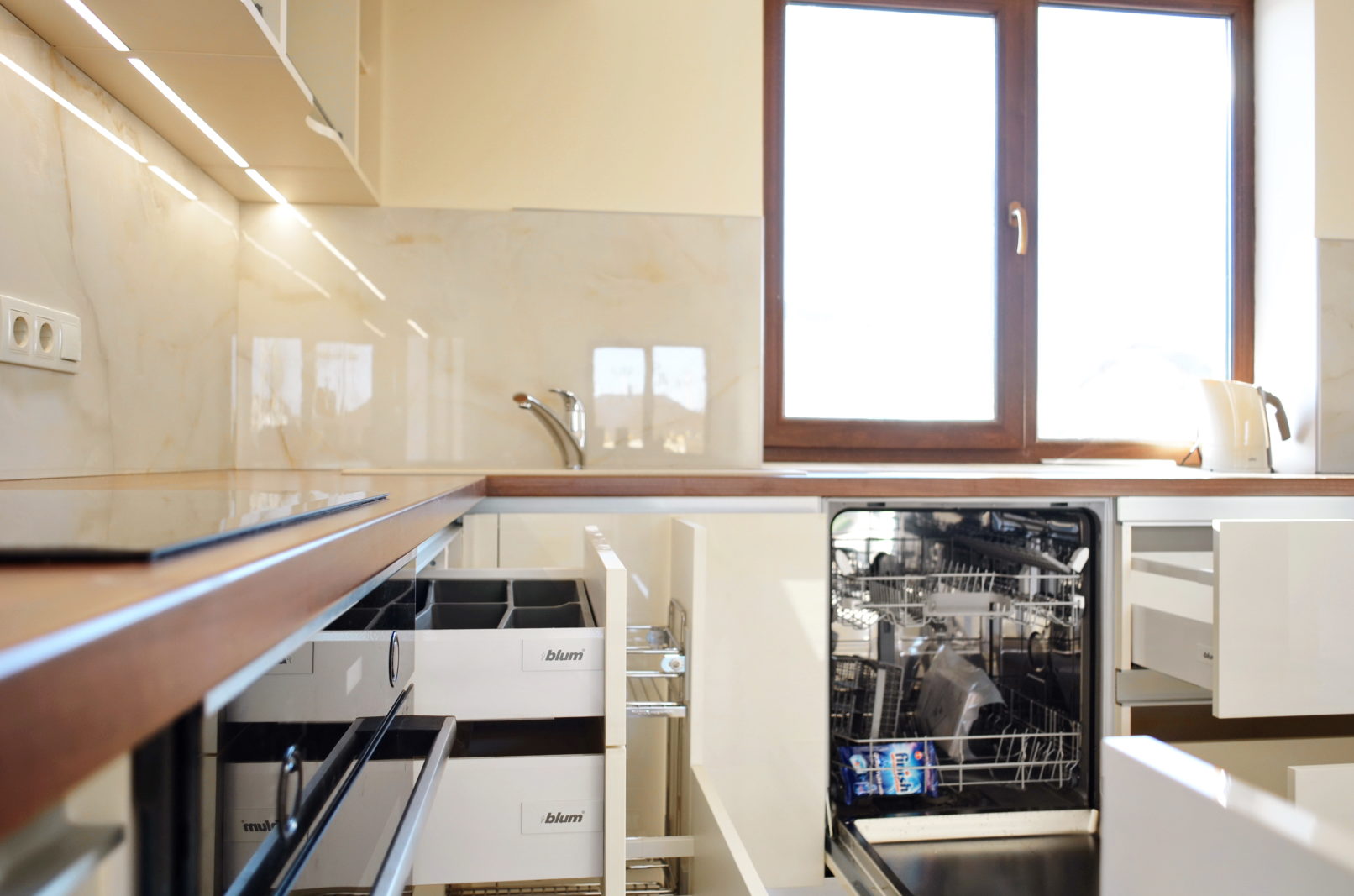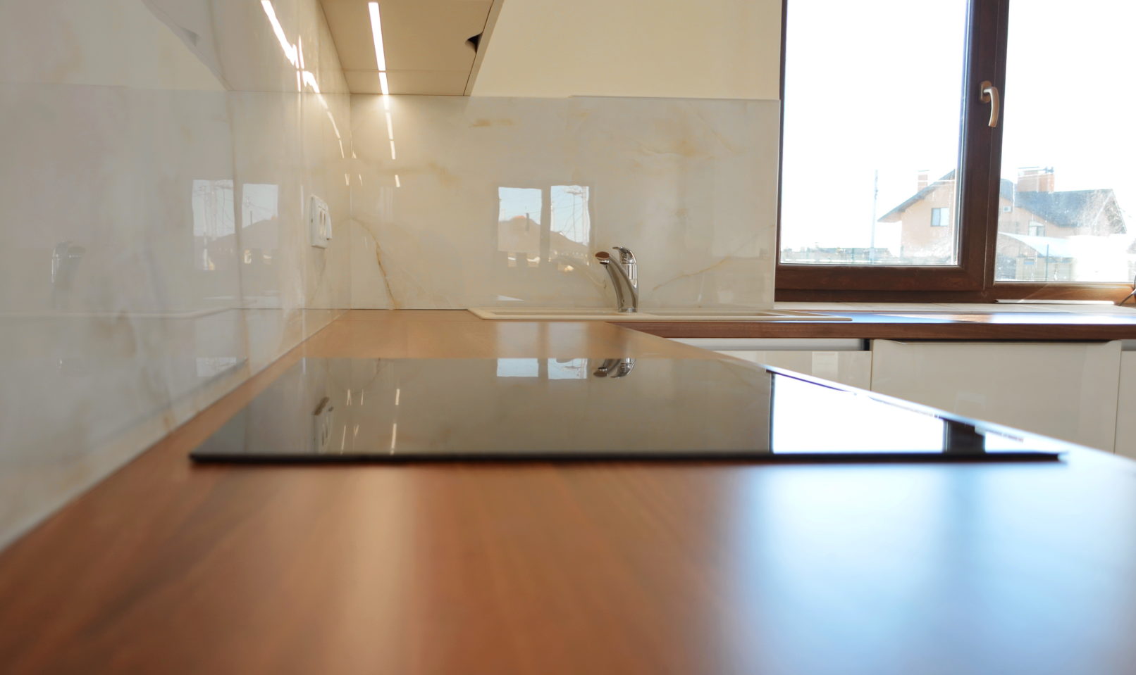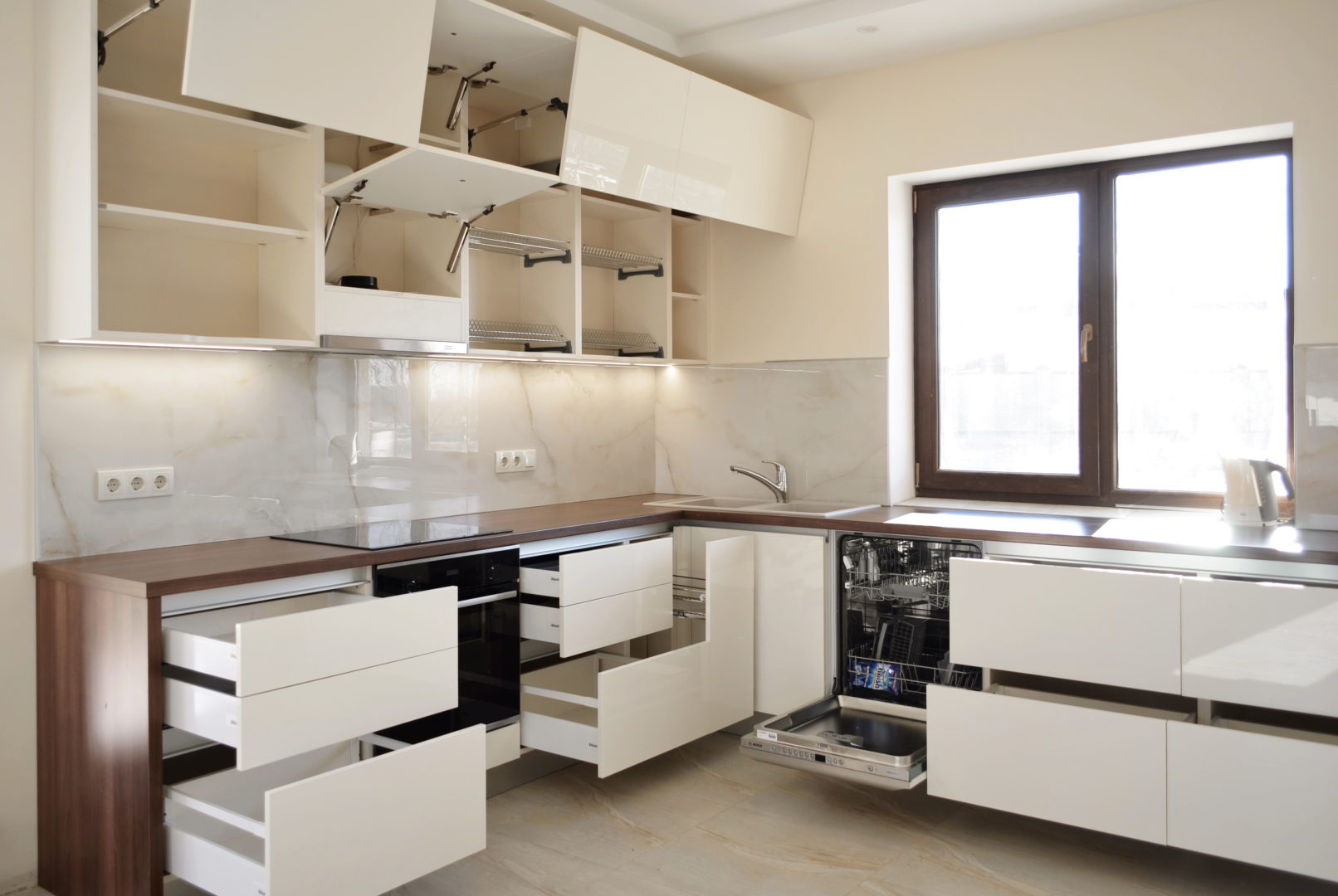 У цьому проєкті ми використали глянцеві фасади у кремовому відтінку – це універсальний вибір для тих, хто хоче дизайн сучасної кухні без візуального перевантаження. Кухні в світлих тонах добре працюють у невеликих приміщеннях, роблячи їх візуально просторішими.