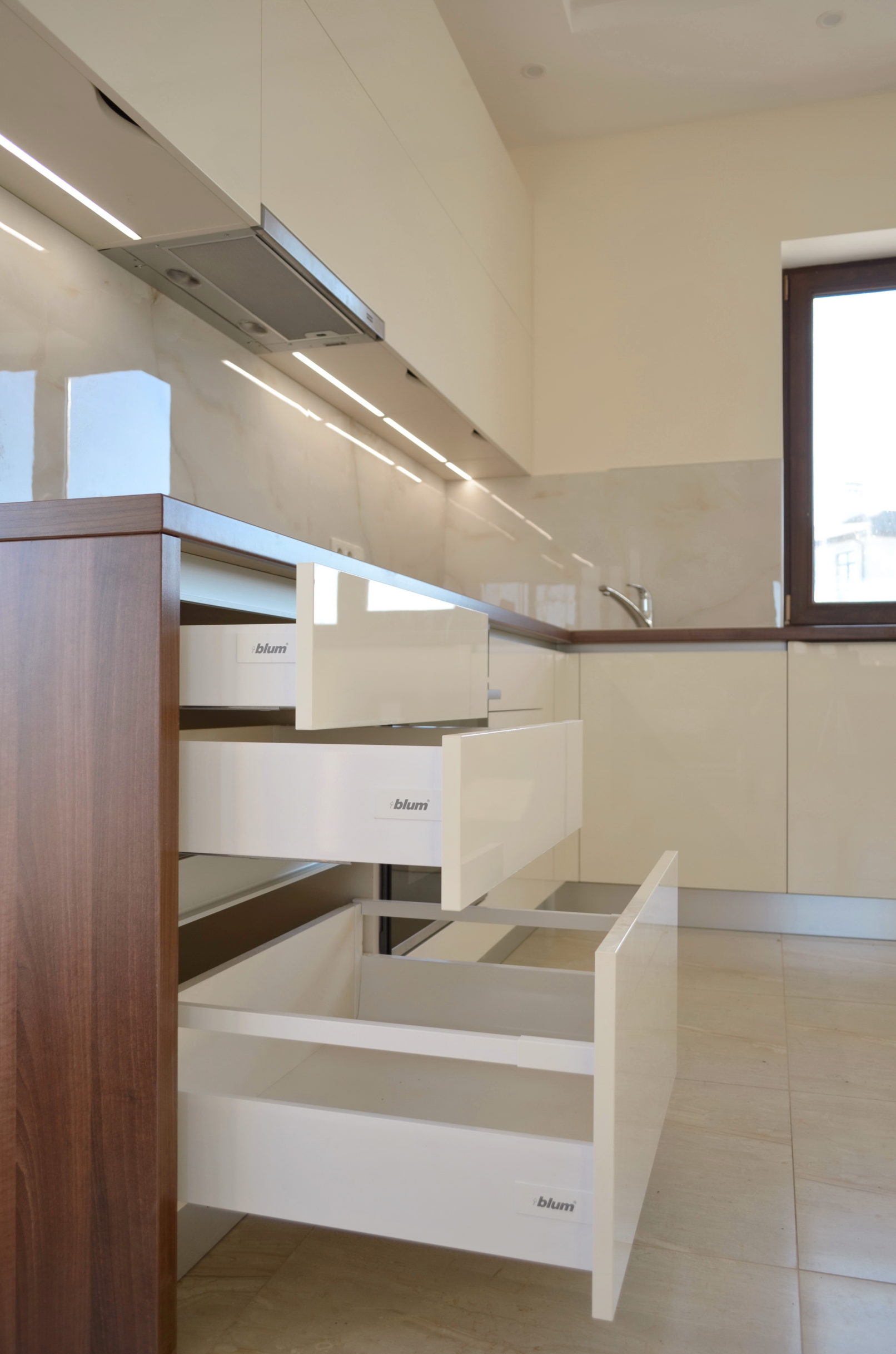 Кремова кухня з глянцевими фасадами й профілем GOLA виглядає легкою, візуально збільшує простір і пасує до інтер’єру в стилі мінімалізм.