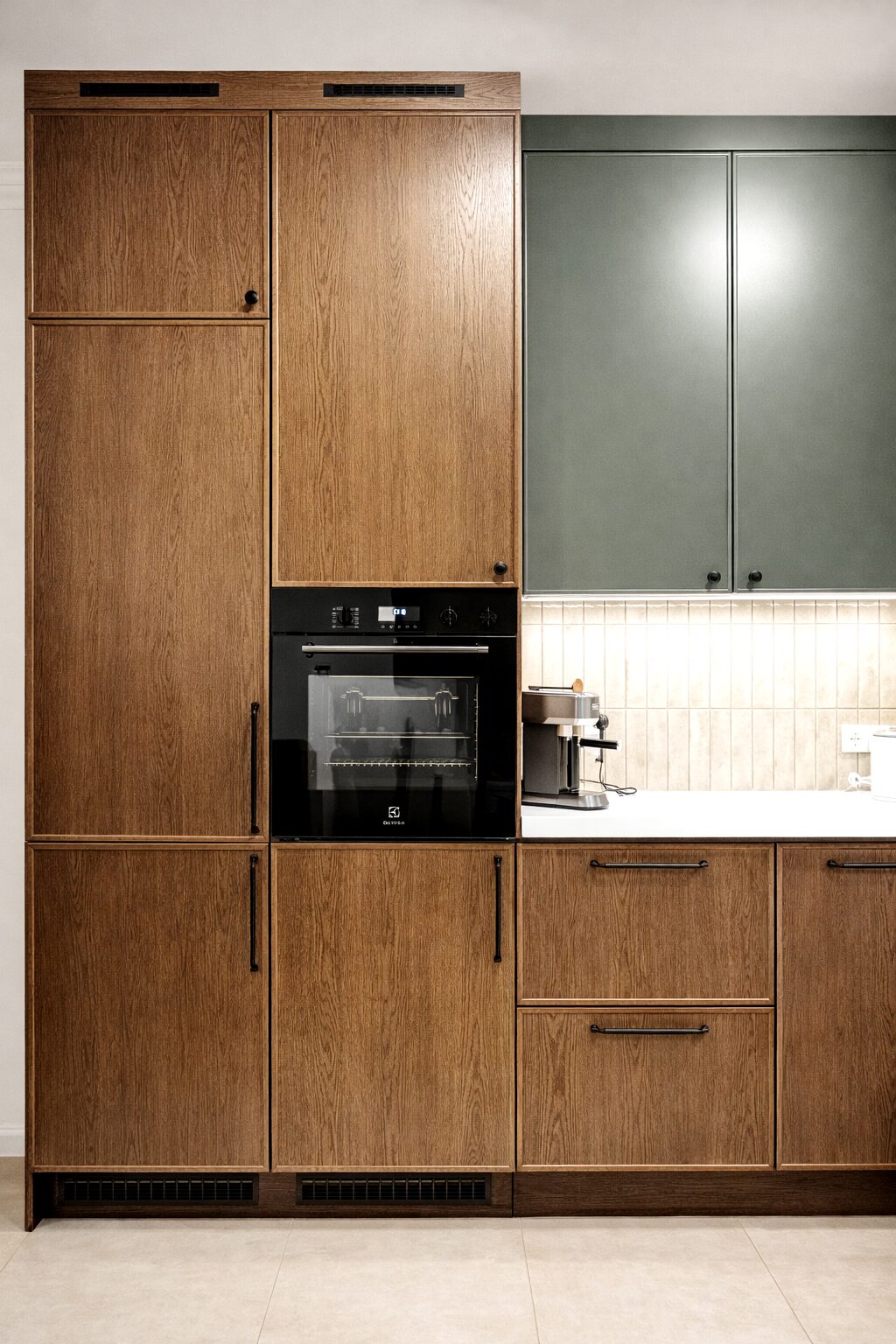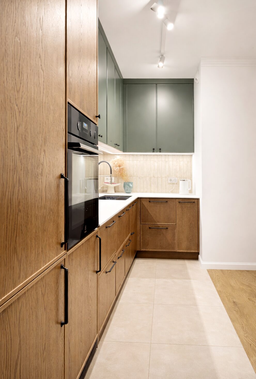 Кухня із зеленими фасадами у поєднанні з дубом