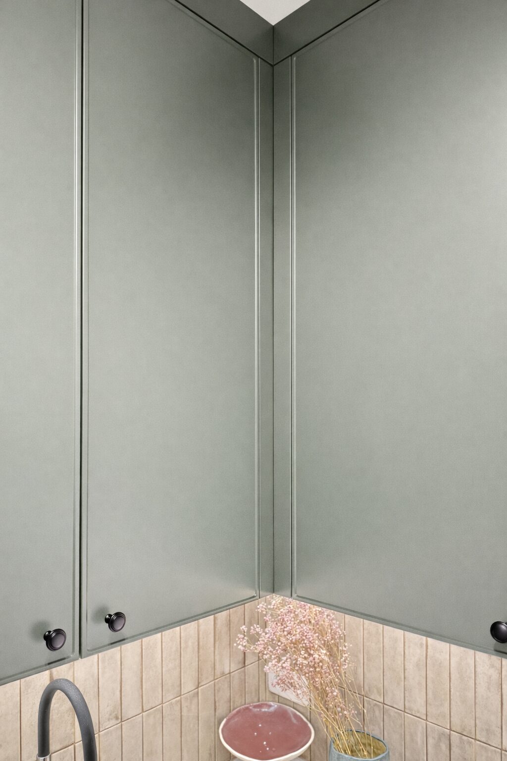 Іноді одна неточна фарба робить інтер’єр пласким, занадто холодним або візуально незавершеним. Але коли фасади підібрані в гармонії, простір починає звучати. Відтінок туманної шавлії працює глибоко й спокійно, підсилюючи натуральний дуб. Деревина виглядає теплішою та виразнішою, а вся композиція стає зібраною й цілісною.