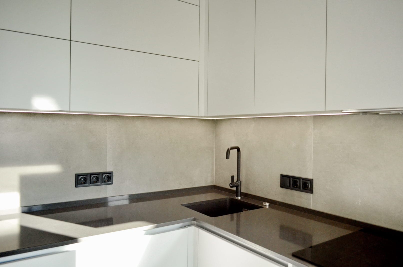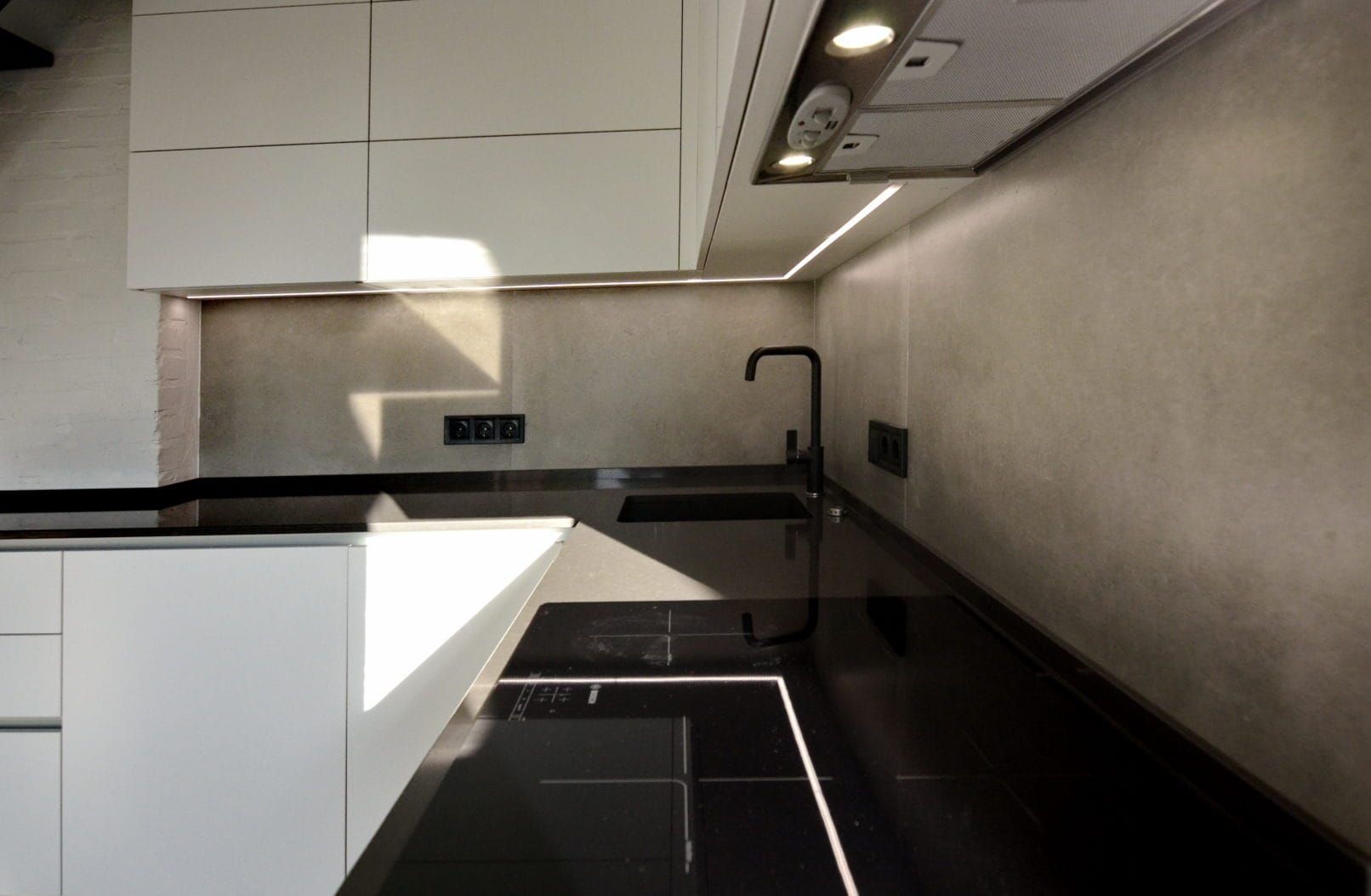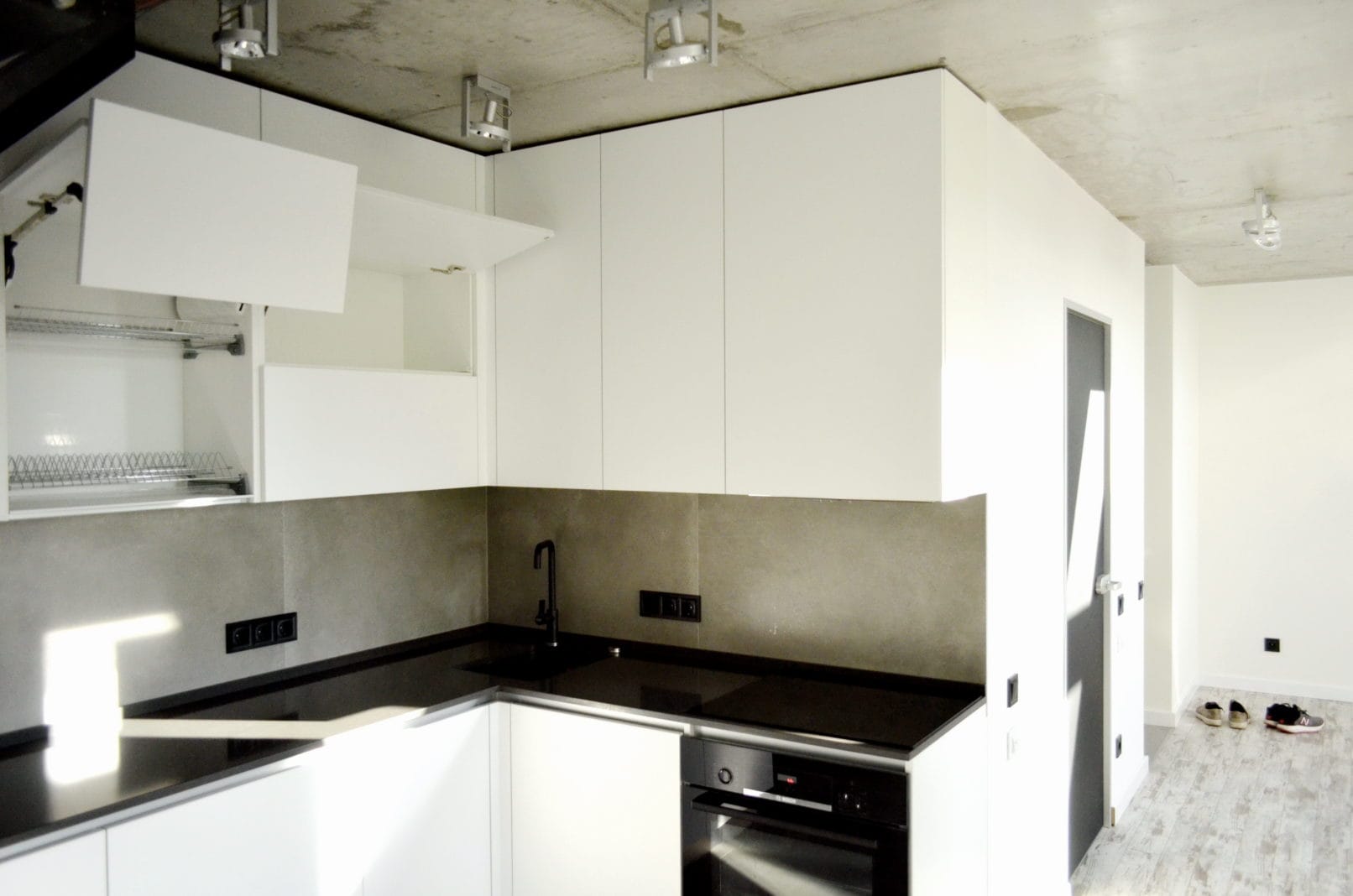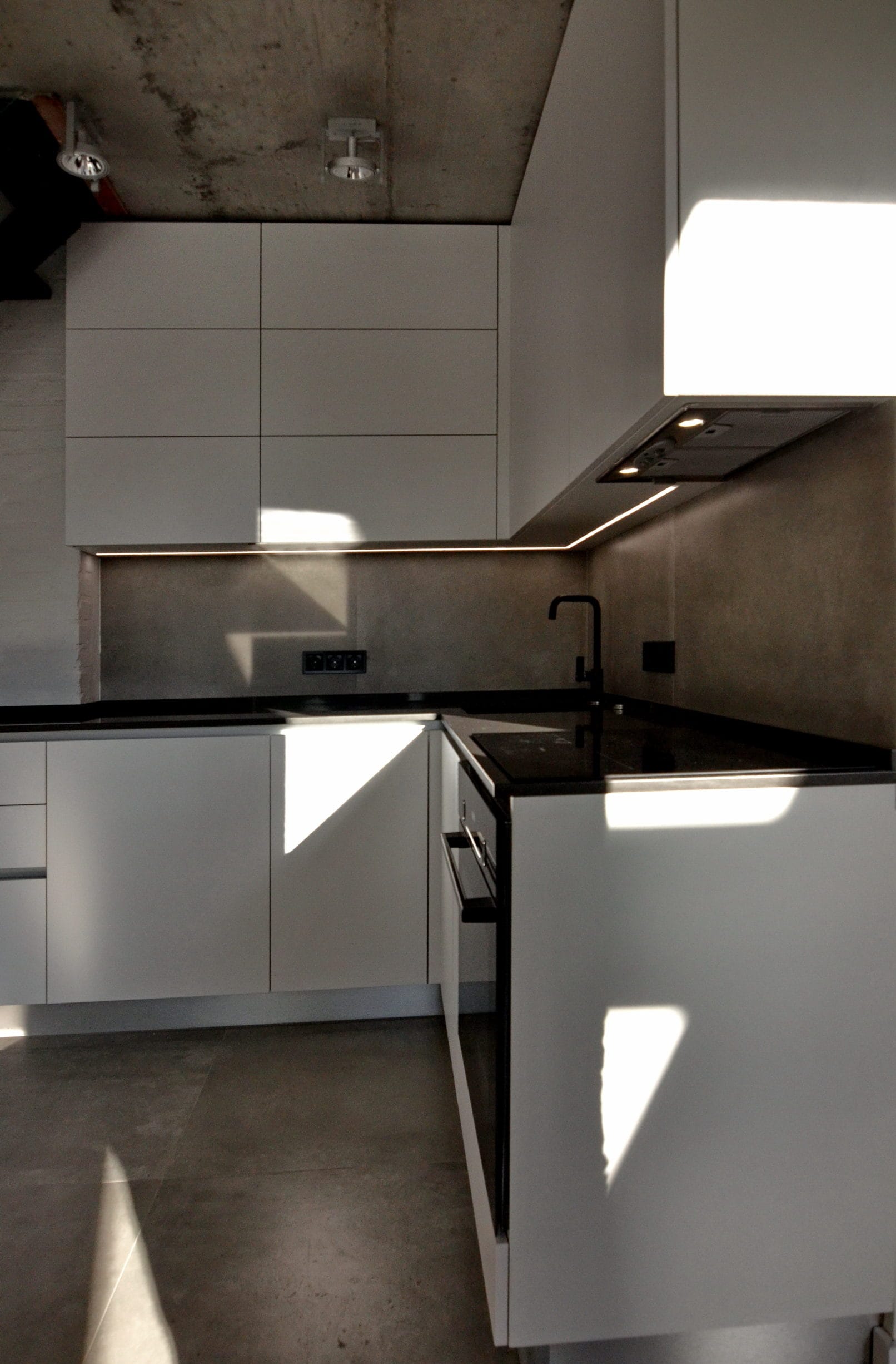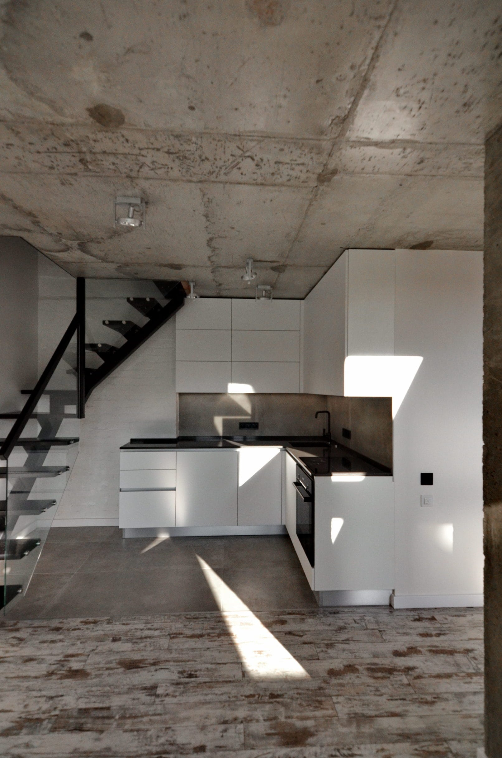 Кухні в стилі лофт завжди мають характер. У цьому проєкті ми поєднали матові фасади без ручок із фактурою бетону – стриманий, але ефектний modern-дизайн. Робоча зона розташована під сходами, що дало змогу максимально використати простір без втрати ергономіки. Фасади з вологостійкого ДСП, фартух і стільниця з HPL – все підібрано для щоденного користування.