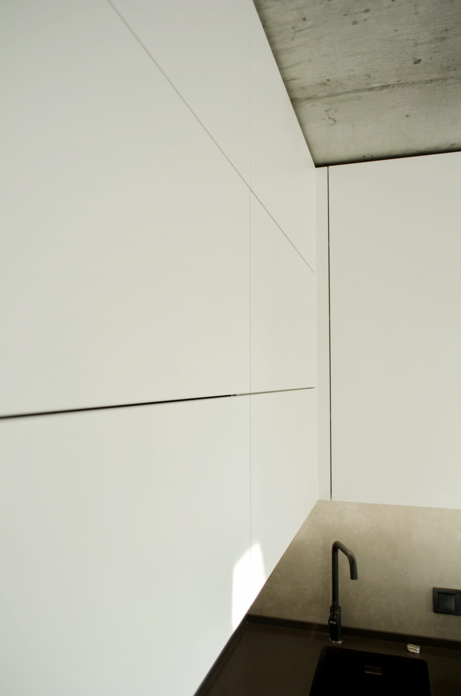 Верхні шафи йдуть до самої стелі, створюючи цілісну геометрію. Вся фурнітура прихована – з дотягувачами та плавним ходом. Такі кухні в стилі лофт добре поєднуються з індустріальною архітектурою та не потребують зайвого декору.