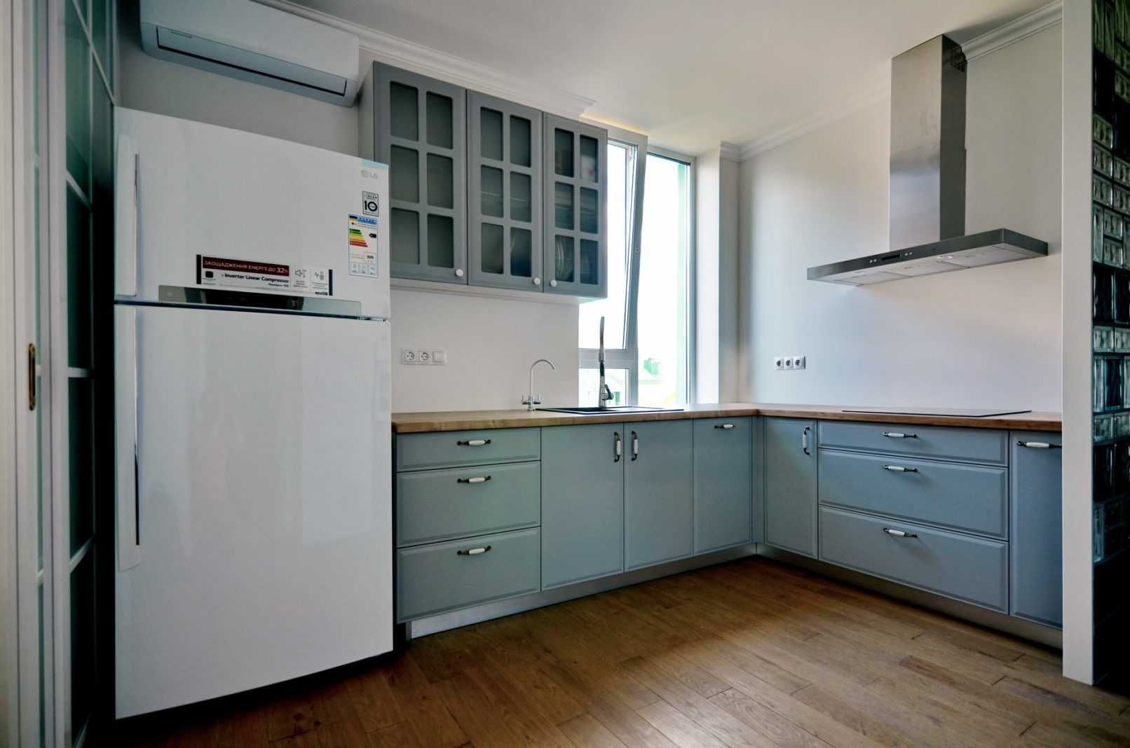 Фрезеровані фасади завжди додають кухні характеру. Фасади пофарбовані в глибокий сірий, із легкою матовістю, що гармонійно поєднується з дерев’яною стільницею. Візуально кухня компактна, але насправді містить усе необхідне: і вбудовану техніку, і високі пенали, і зручну мийку біля вікна.