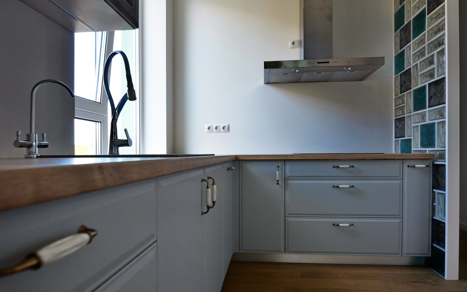 Кожна деталь продумана: ретро-ручки з керамічними вставками створюють атмосферу затишку, а глибока чорна мийка виглядає сучасно й практично. Родзинка інтер’єру – перегородка з кольорових склоблоків, яка зонує простір і вносить трохи гри світла.