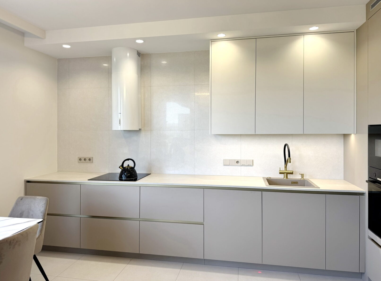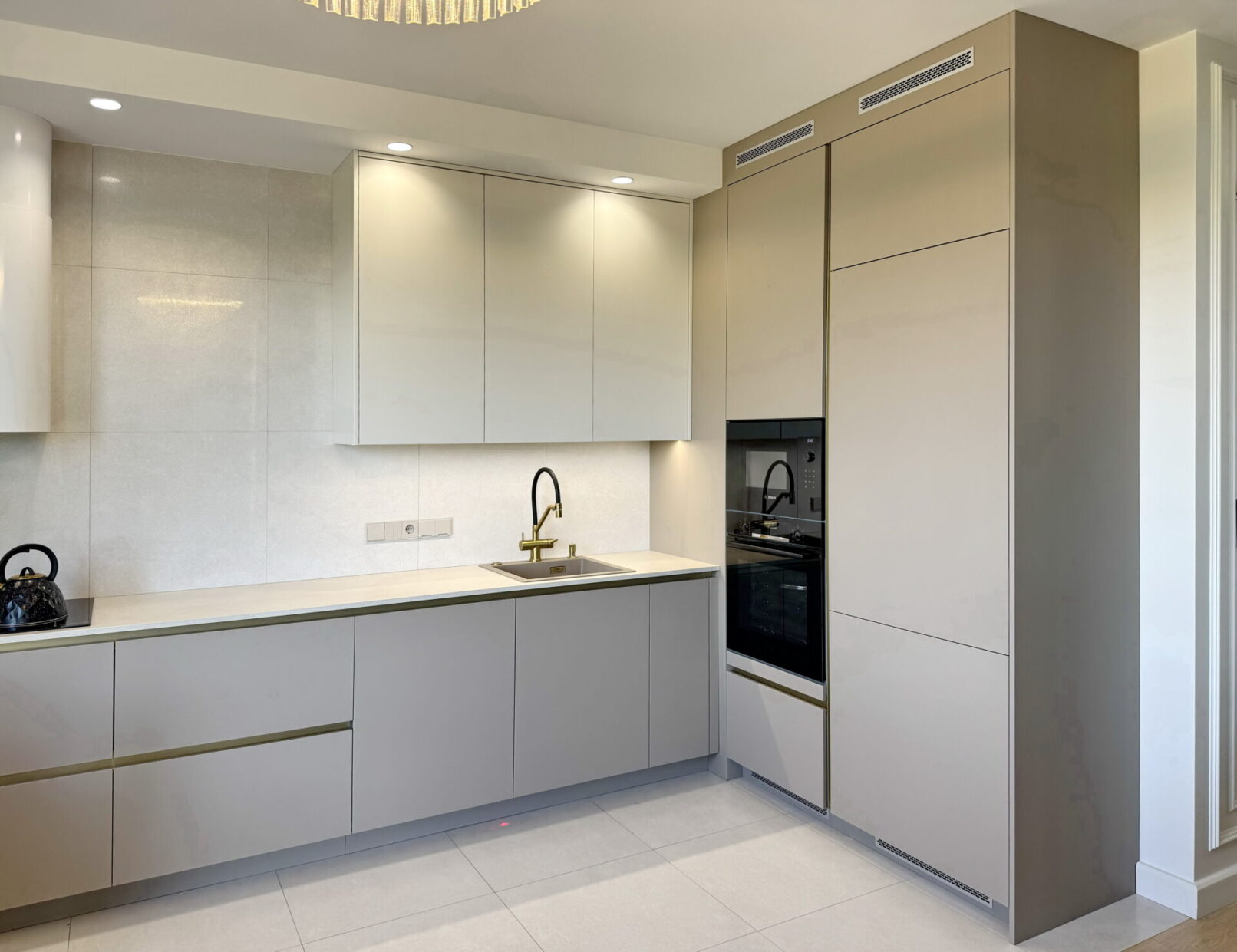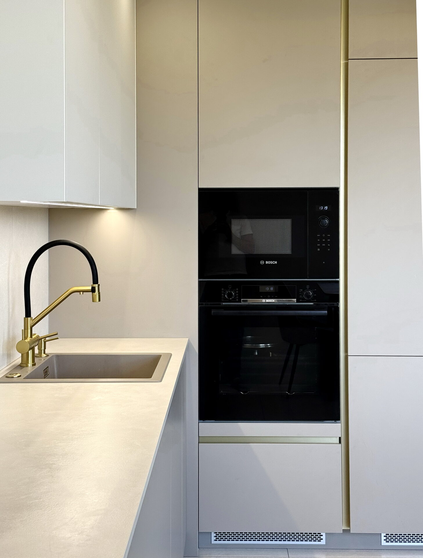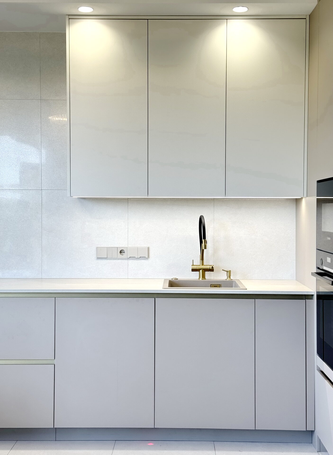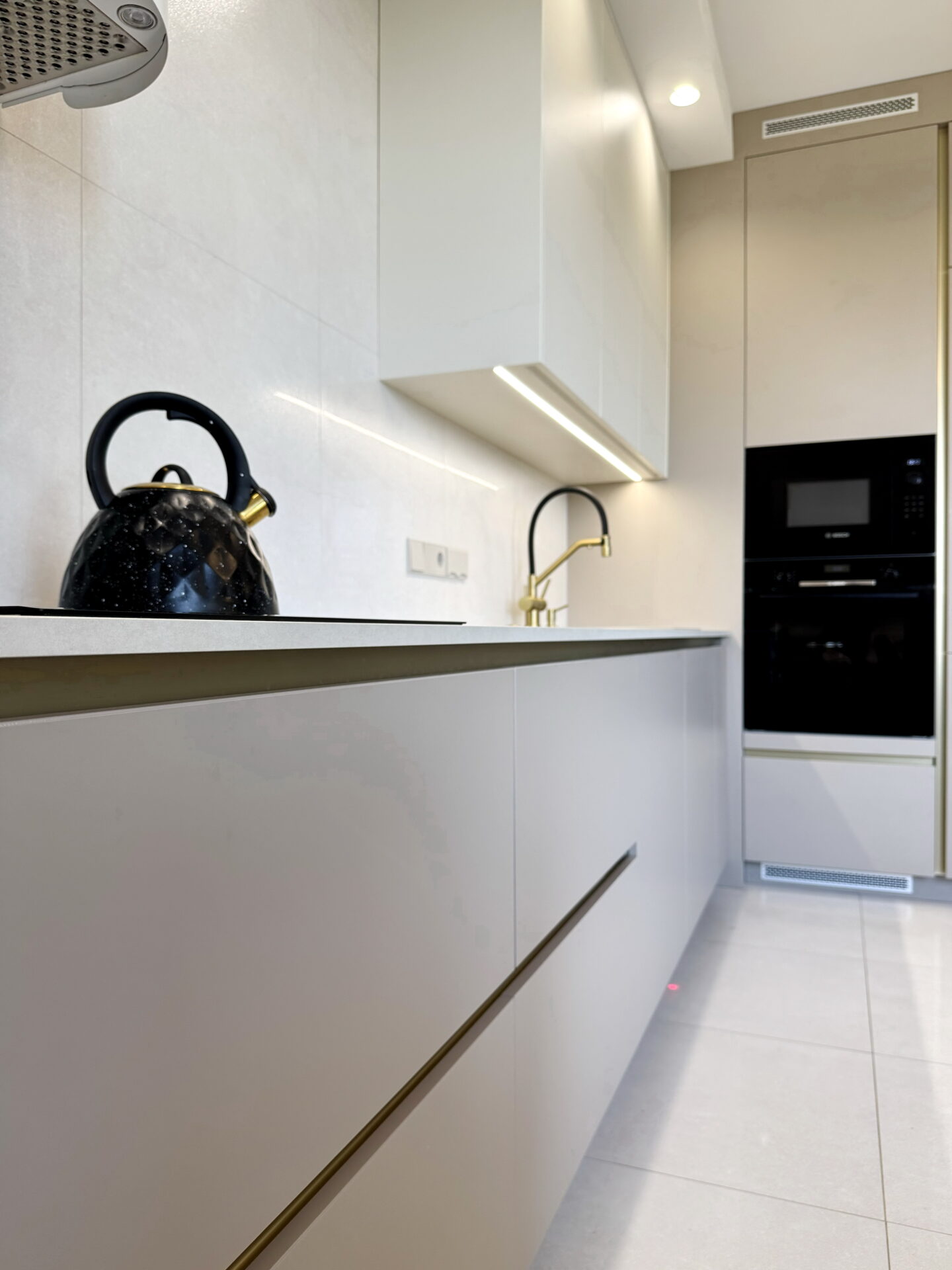 Світлі поверхні та вбудована техніка формують чисту геометрію, а металеві лінії Gola профілю золотого кольору підкреслюють пропорції. Мінімалізм з характером – коли все просто, але зі смаком.