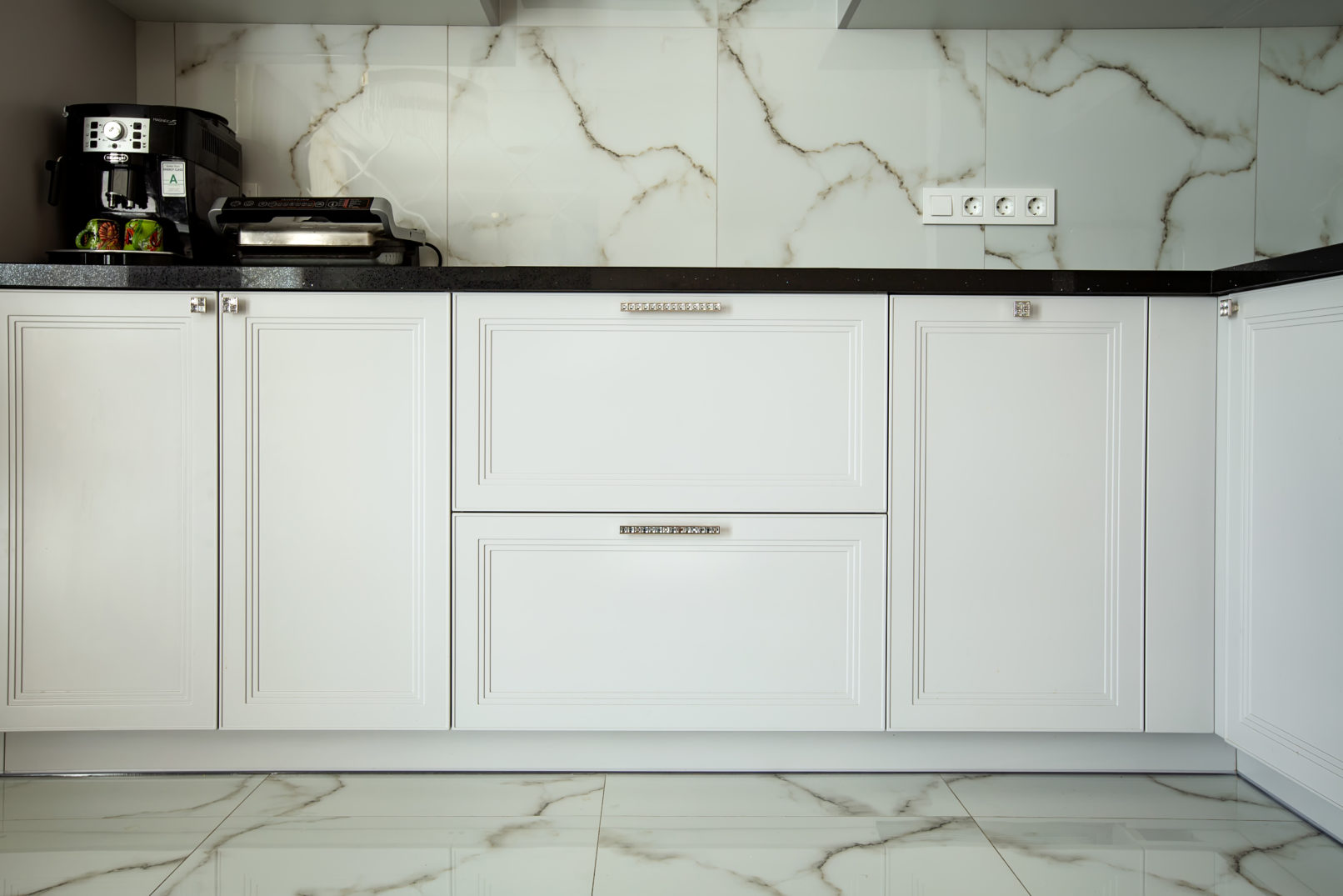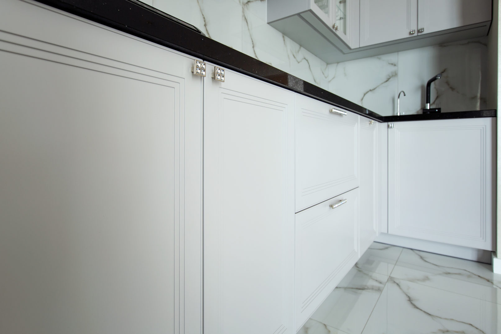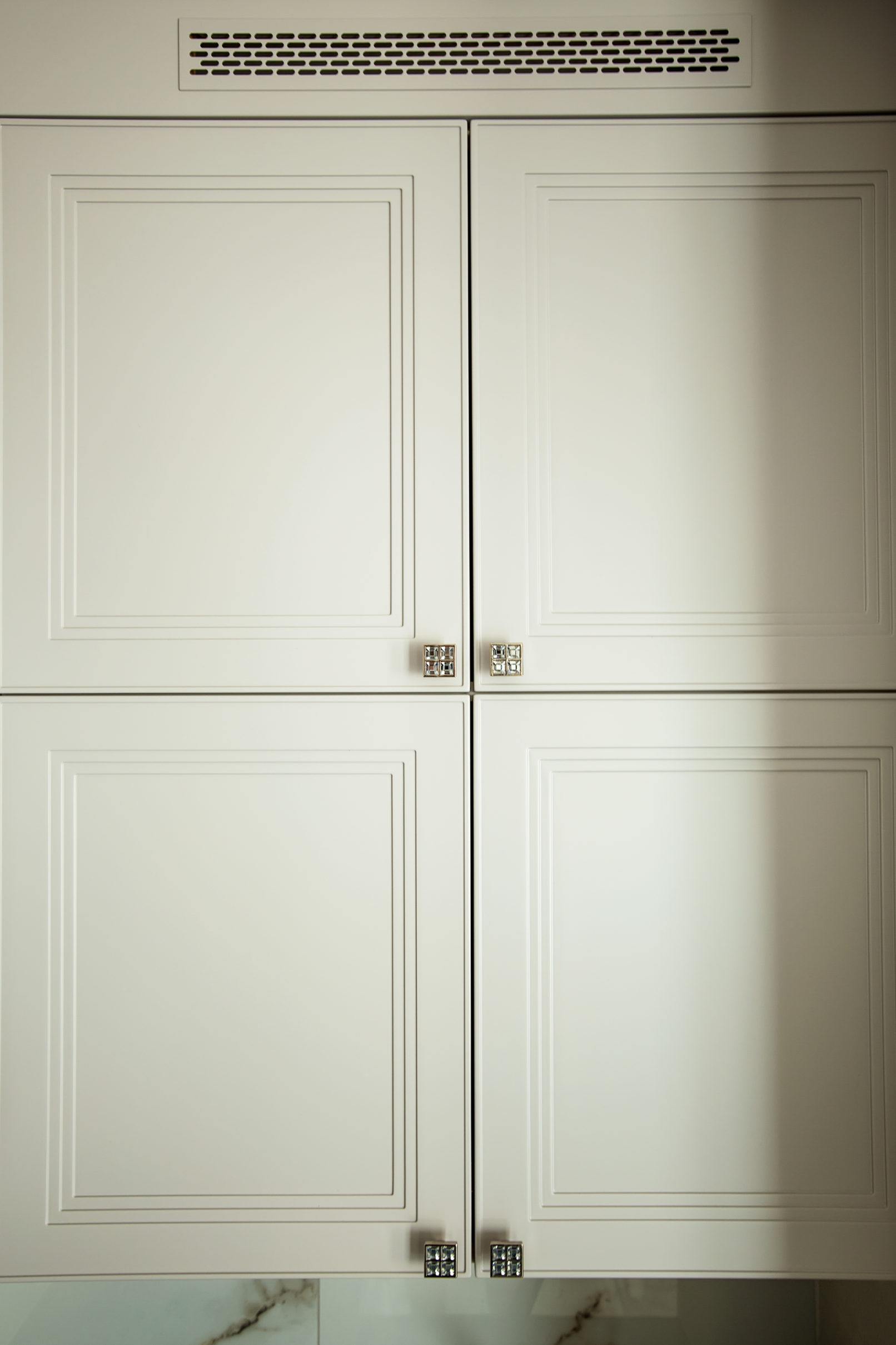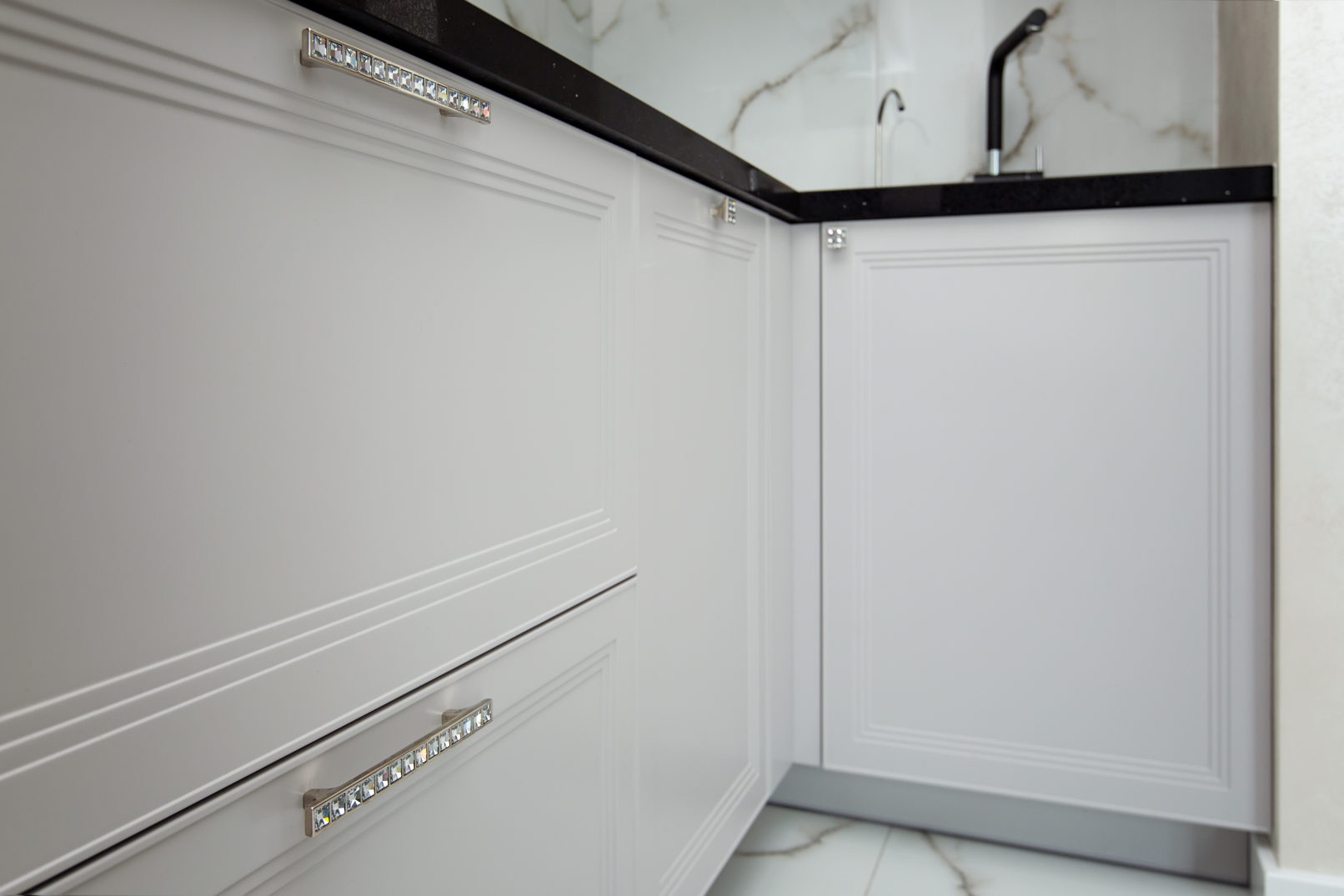 Ця класична кухня створена для тих, хто цінує стриману елегантність і перевірені часом рішення. Світлі фасади з делікатним фрезеруванням надають меблям вишуканості, а чорна кварцова стільниця додає глибини та контрасту. Скляні шафки з підсвічуванням демонструють улублені сервізи, водночас зберігаючи легкість інтер’єру. Вбудована техніка Bosch, індукційна варильна поверхня, сучасна фурнітура з доводчиками – усе це забезпечує комфорт щоденної експлуатації.