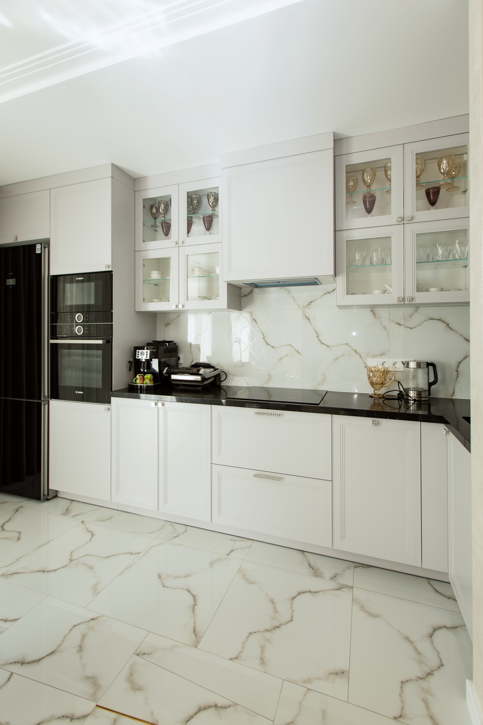 Кахель із малюнком під мармур на підлозі й фартуху додає простору статусу та практичності. Раціональне планування з глибокими шафами та кутовою мийкою робить навіть невелике приміщення функціональним.