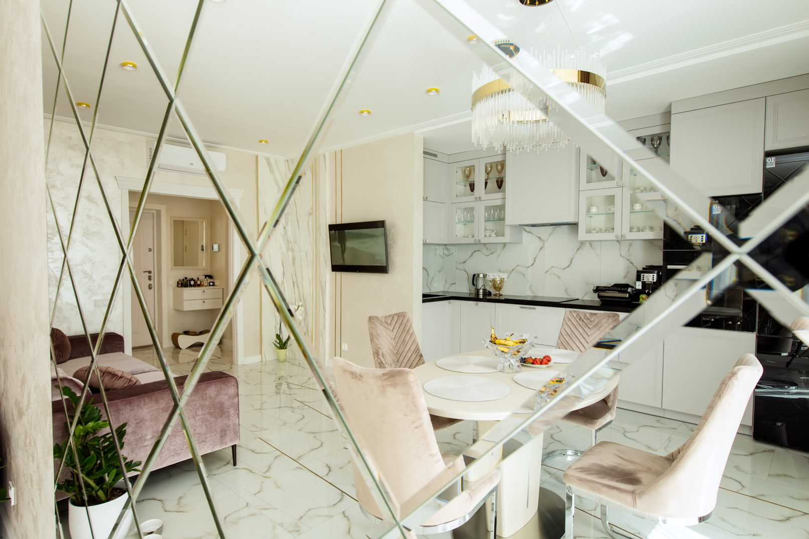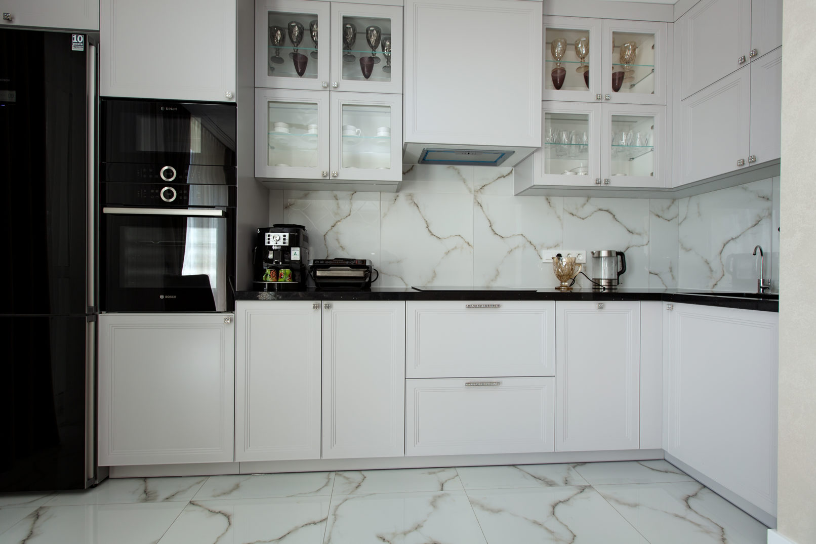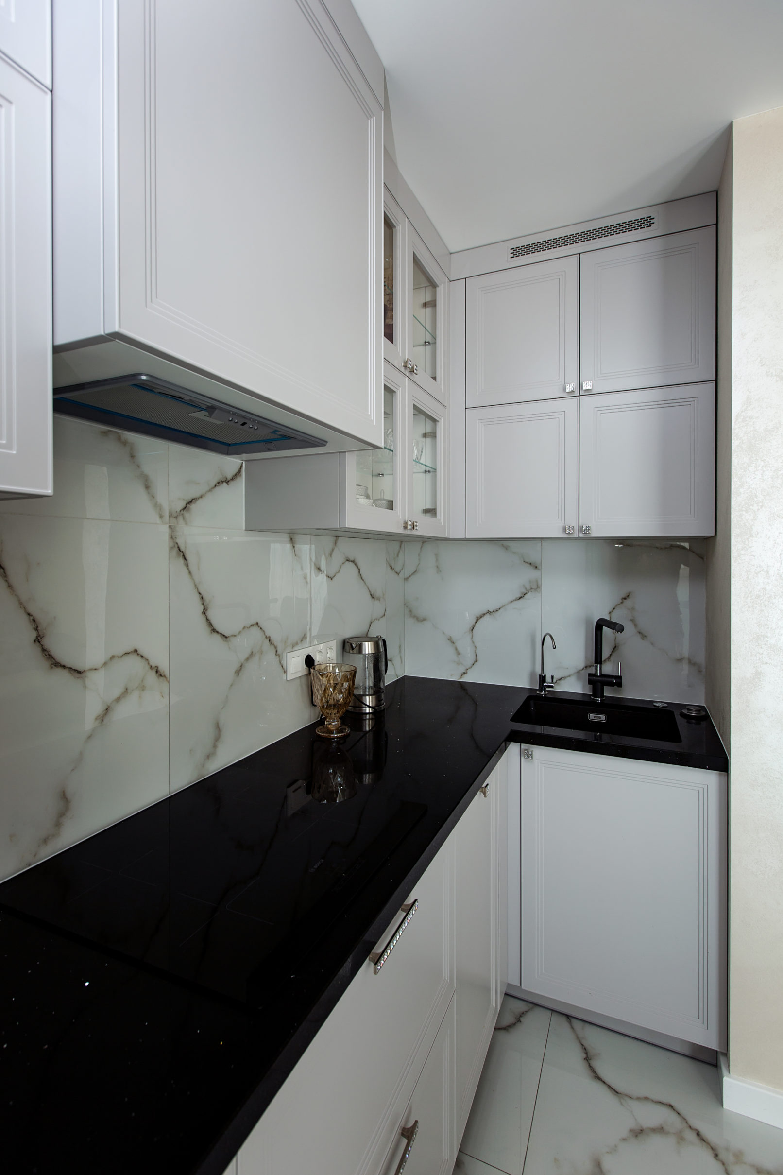 Класична кухня з чорним кварцом і фасадами у світлих тонах