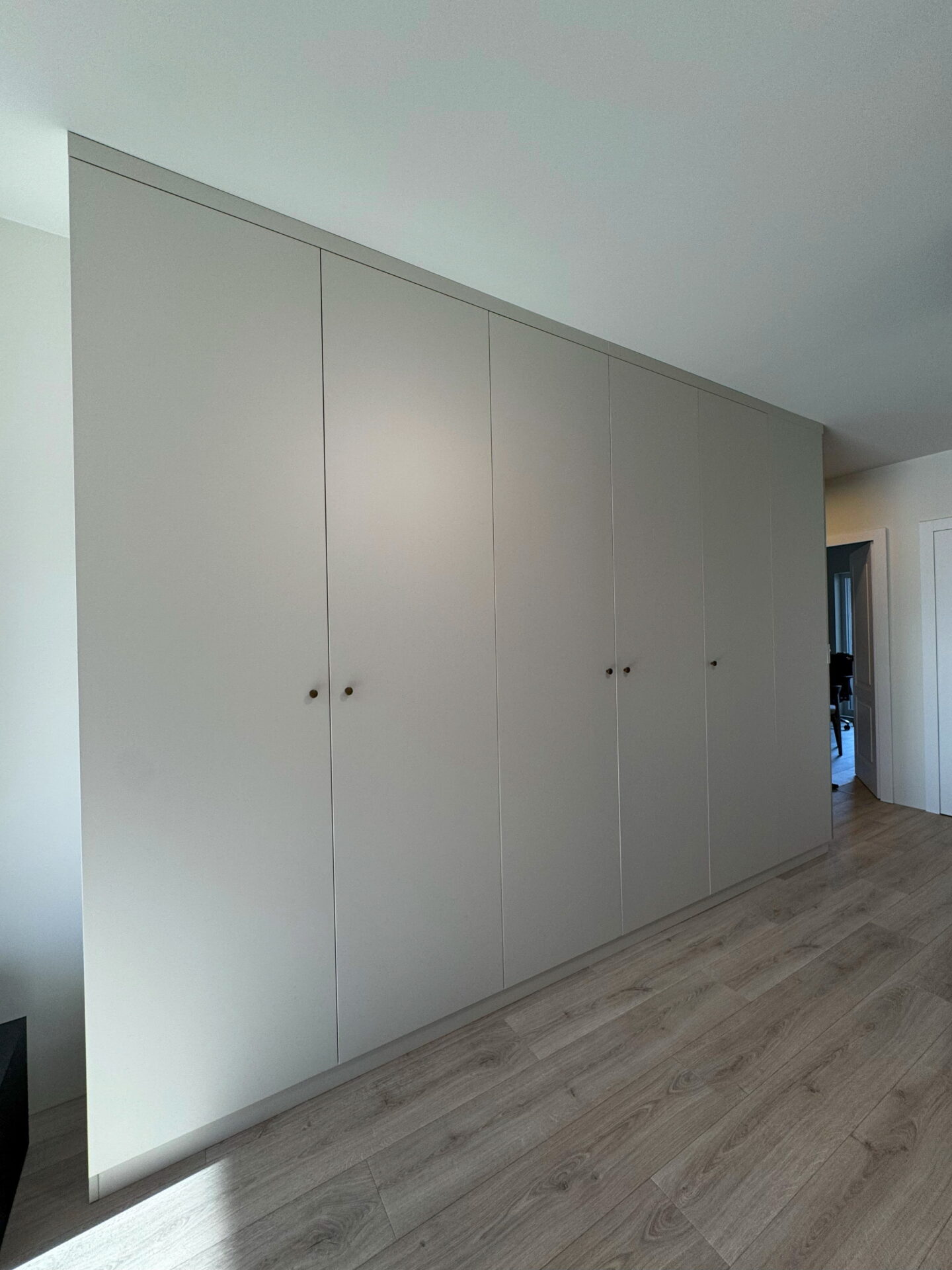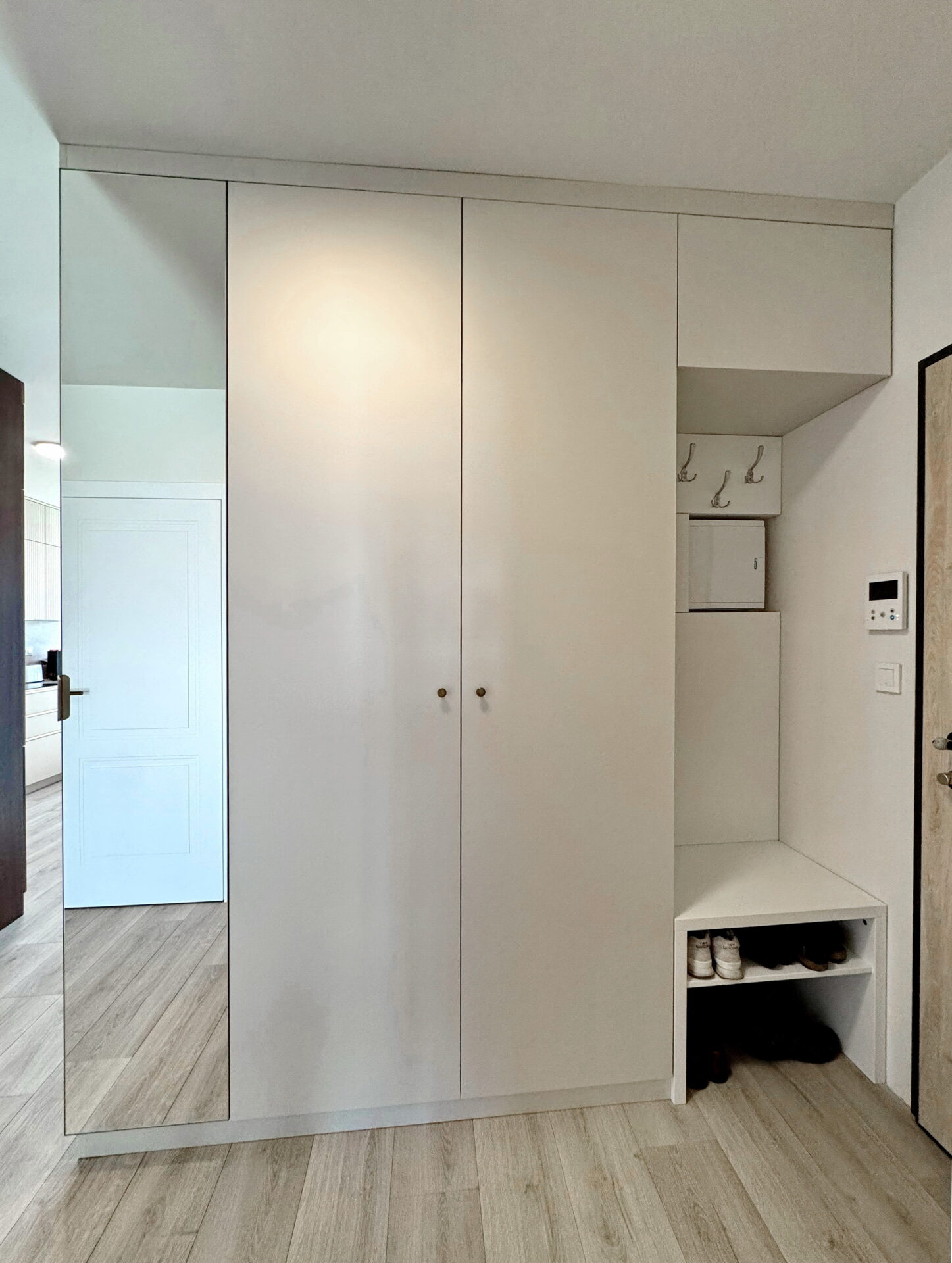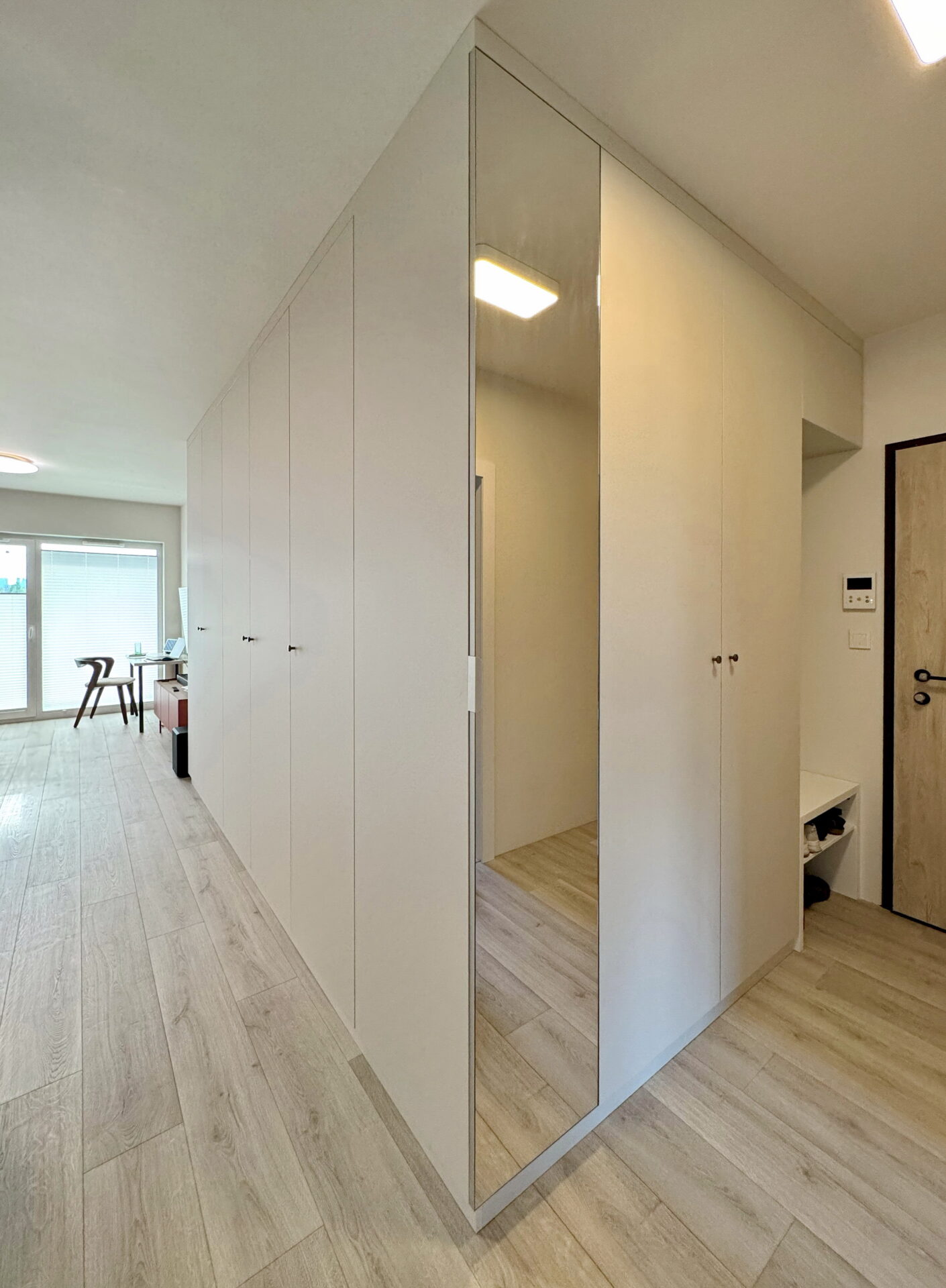У шафі продумано місце для сидіння та зручного перевзування. Дзеркало на дверцятах візуально розширює простір і додає функціональності, а електрощитки інтегровані всередину меблів. Чисті лінії, нейтральні фасади та ергономічність роблять цю шафу універсальним рішенням для сучасних інтер’єрів.