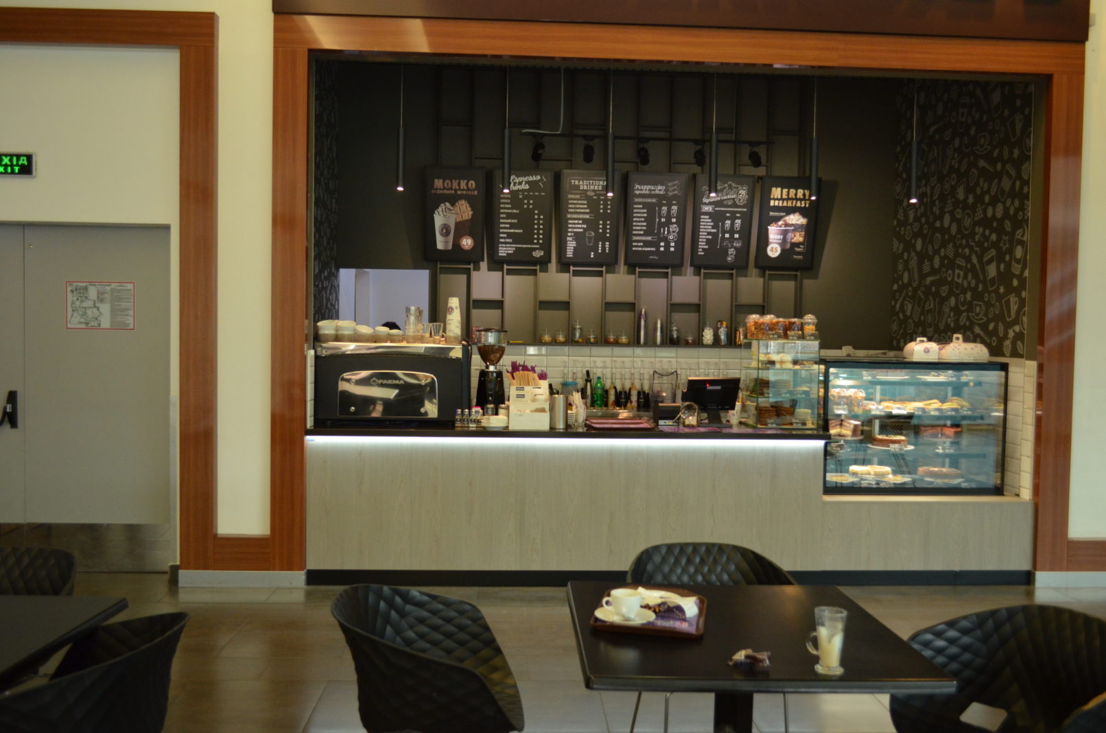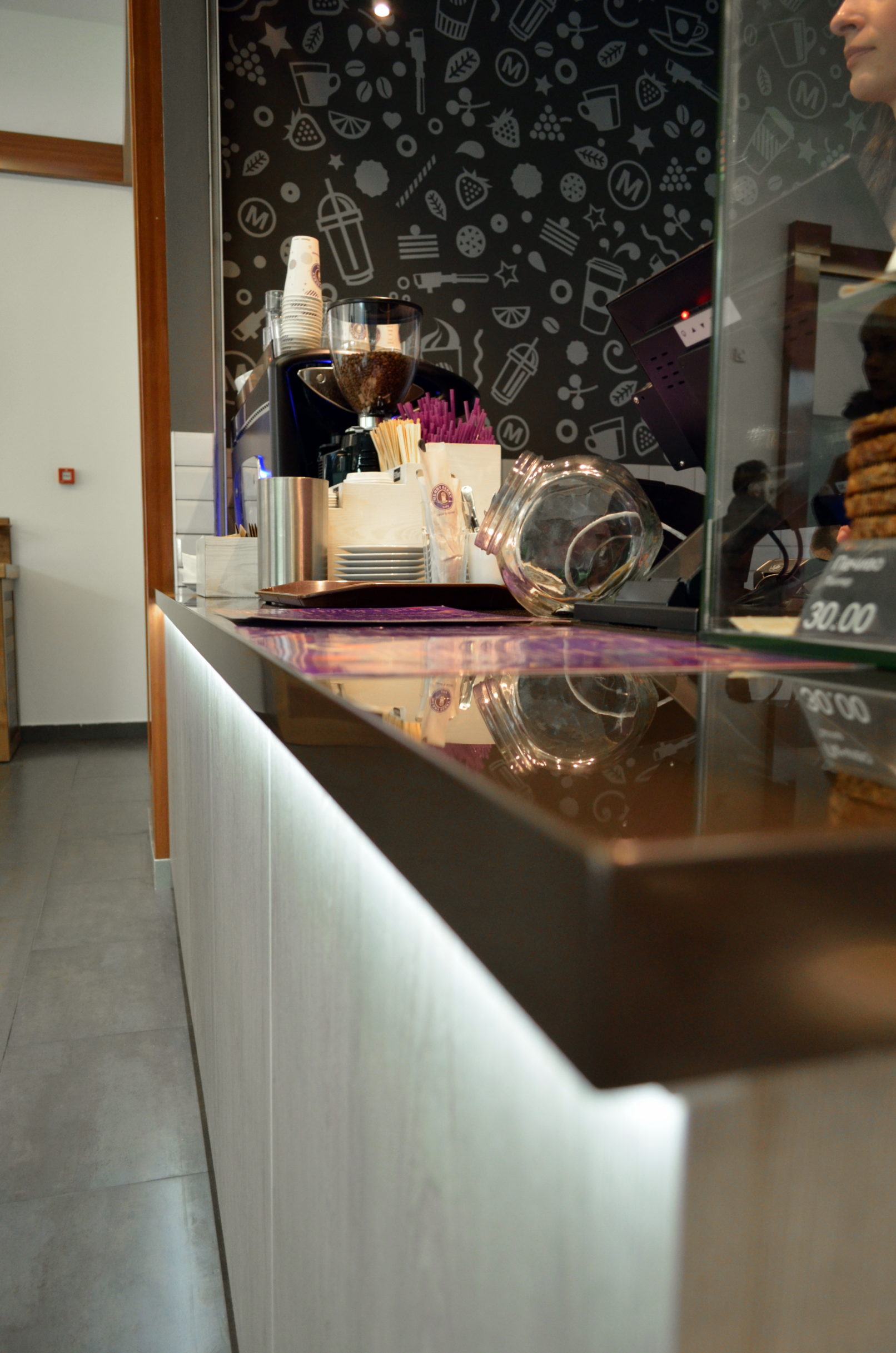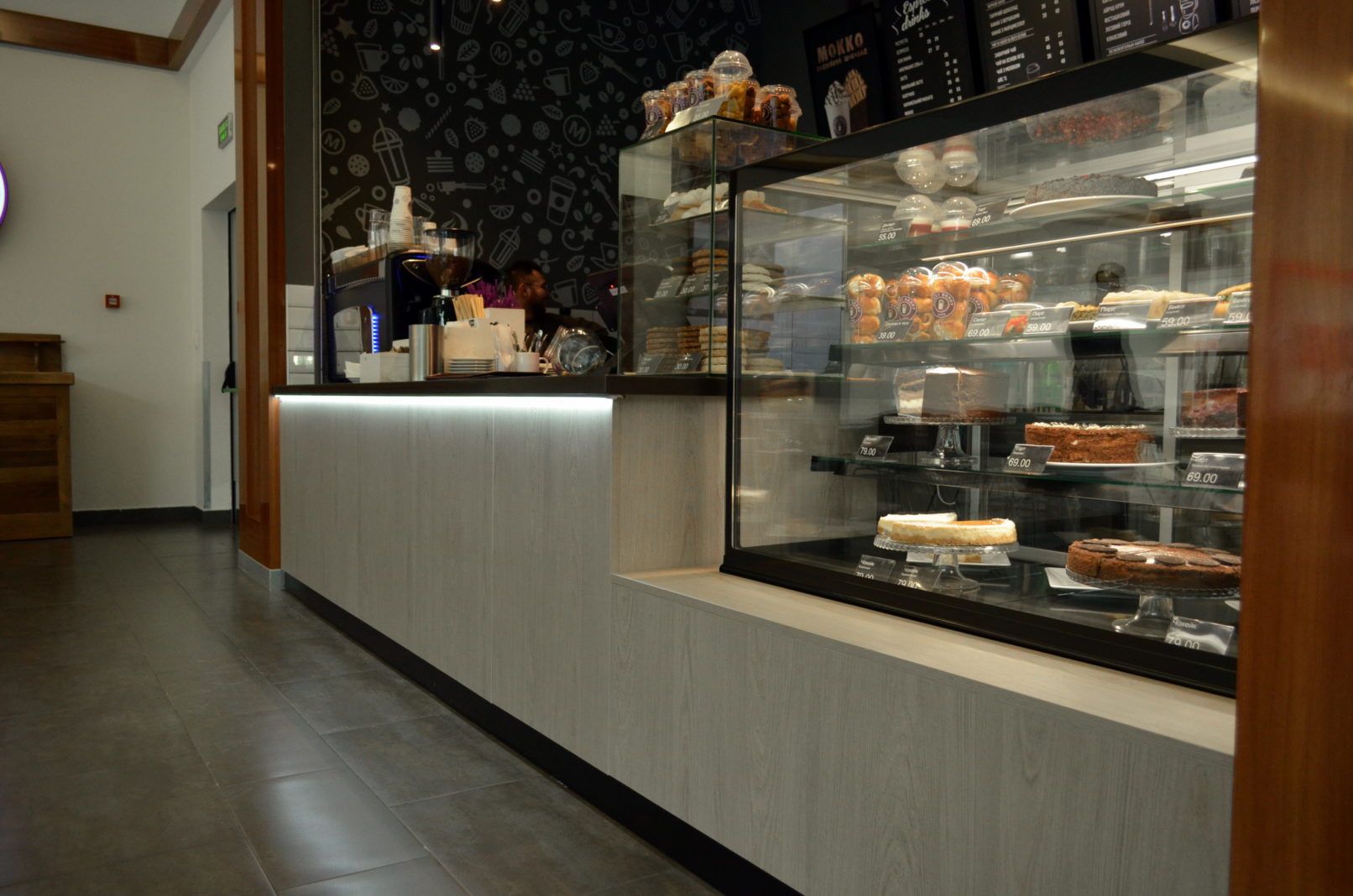 Ми використали вологостійкі матеріали з текстурою світлого дерева, що поєднується з темним оздобленням і фірмовим стилем закладу. Вітрини для десертів, модулі зберігання, касова зона – усе виготовлено індивідуально з урахуванням технологічних процесів і побажань клієнта.
