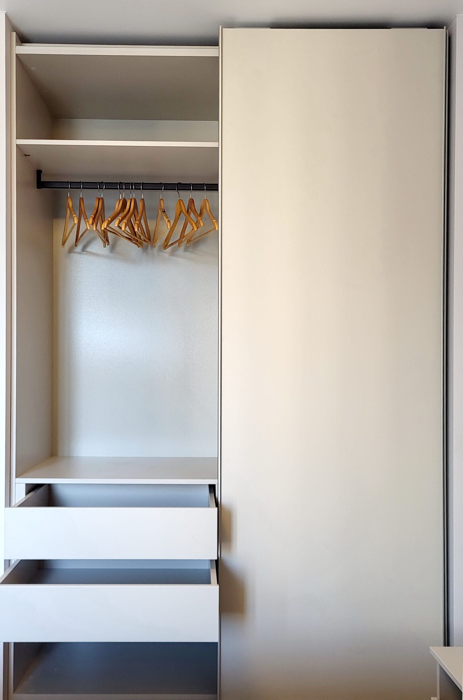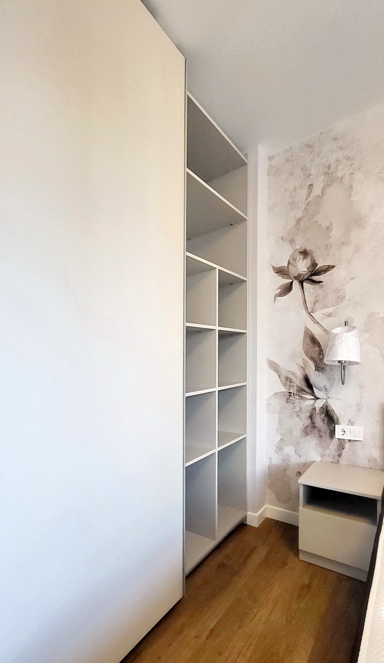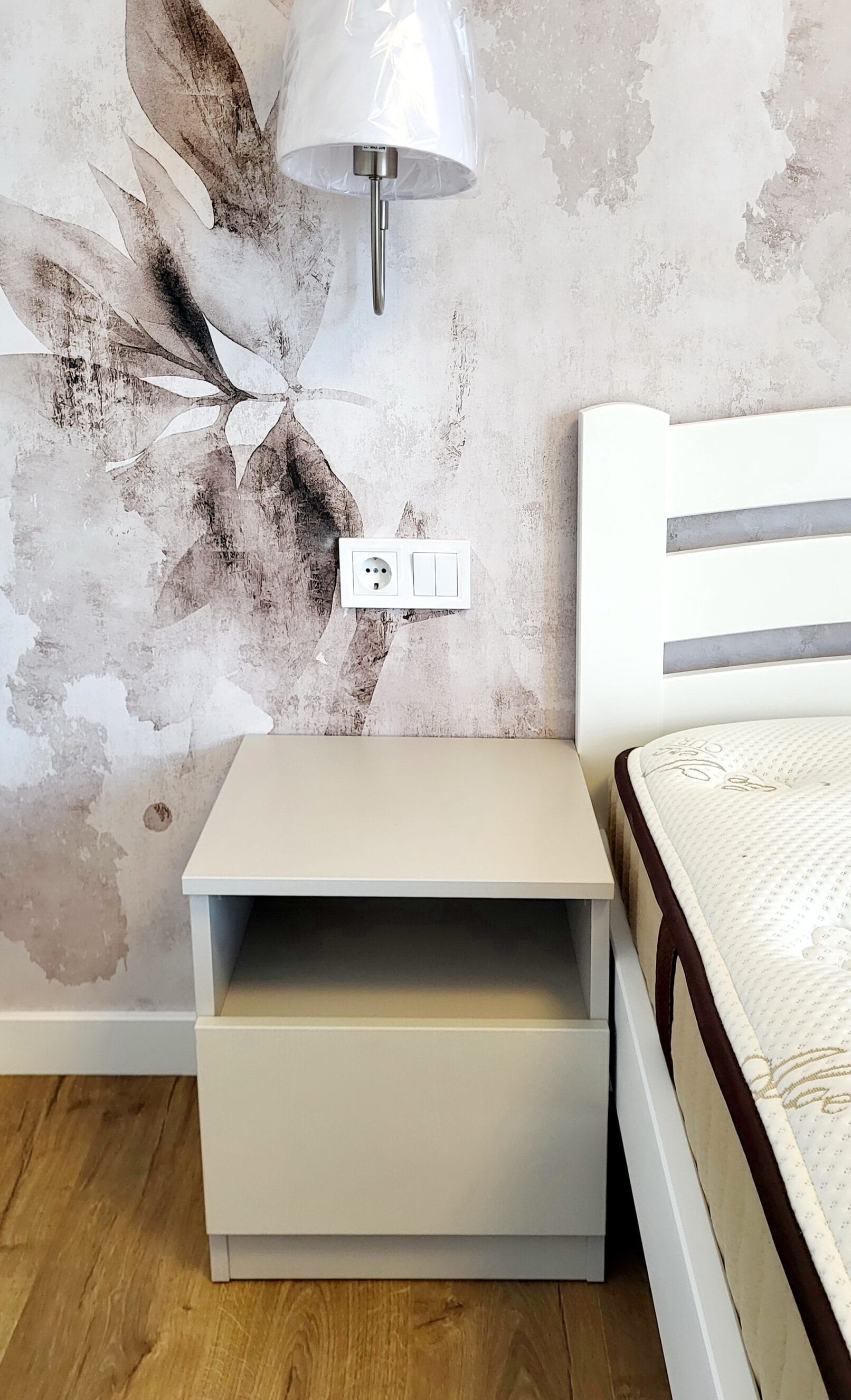 Світлі фасади без ручок роблять кімнату візуально більшою. Висувні шухляди рухаються плавно завдяки надійній фурнітурі BLUM. Такі меблі не просто прикрашають спальню – вони працюють на комфорт. Кожен елемент виготовлений на замовлення, щоб ідеально вписатись у простір і стиль власника.