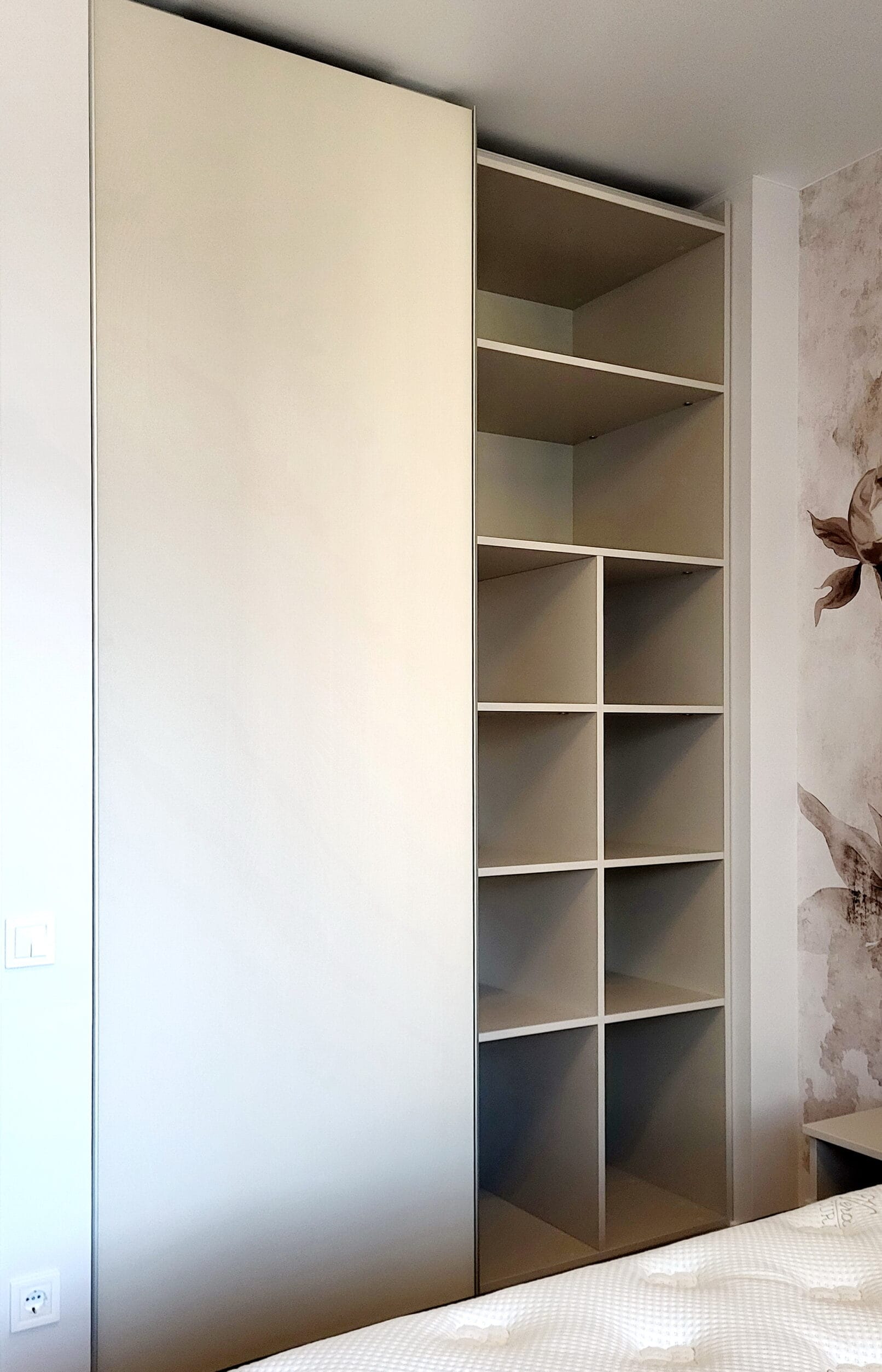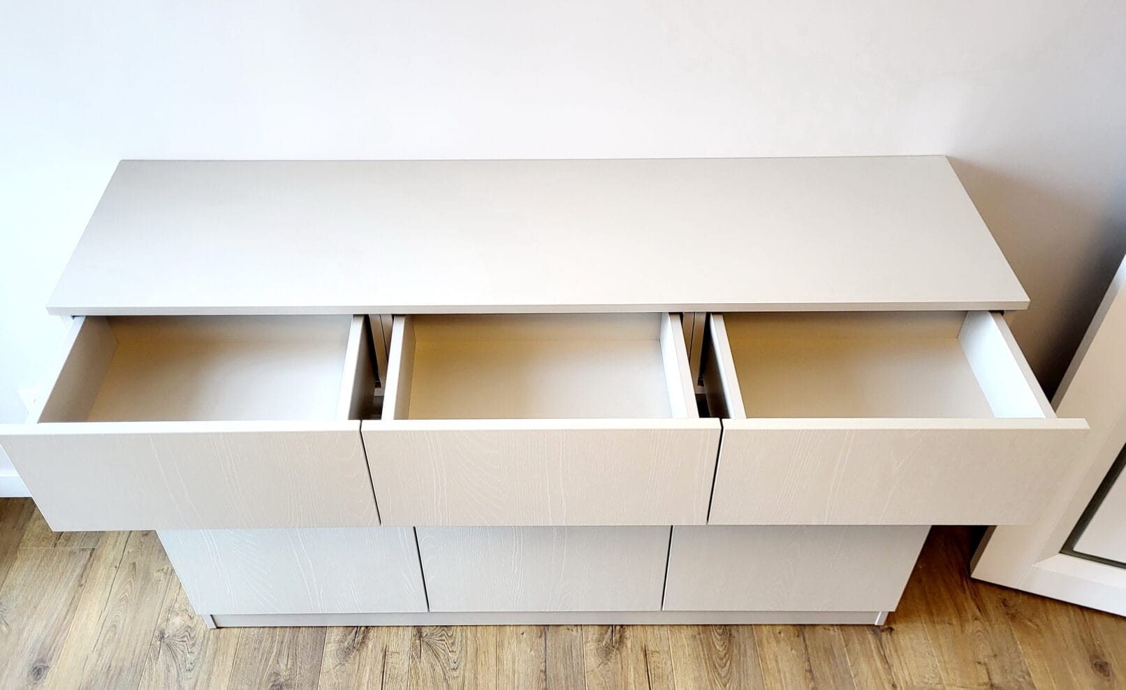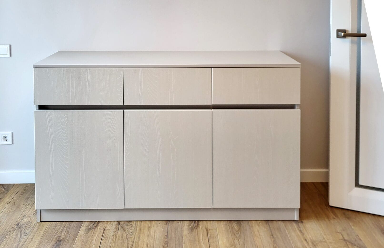 Світлі фасади без ручок роблять кімнату візуально більшою. Висувні шухляди рухаються плавно завдяки надійній фурнітурі BLUM. Такі меблі не просто прикрашають спальню – вони працюють на комфорт. Кожен елемент виготовлений на замовлення, щоб ідеально вписатись у простір і стиль власника.