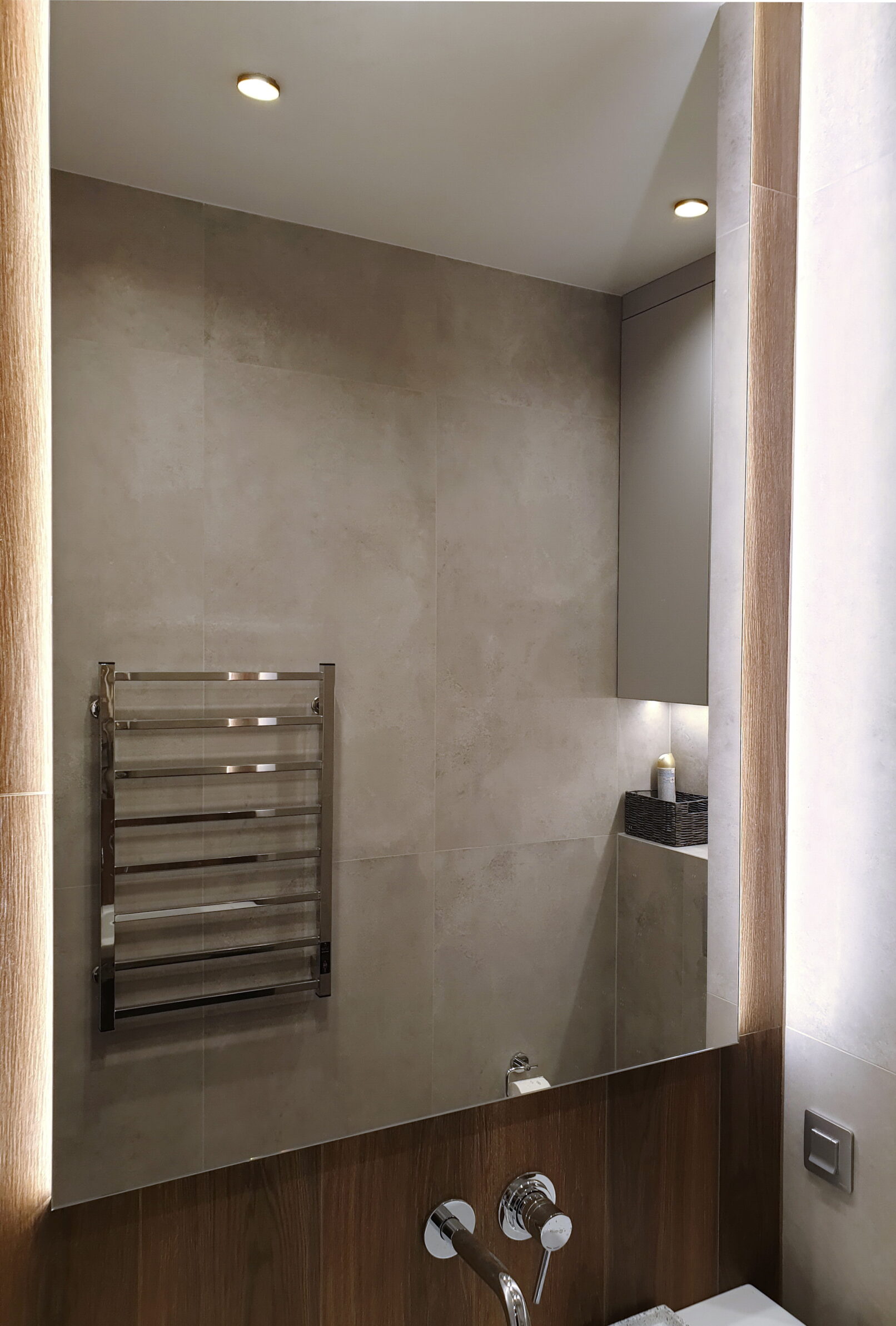 Компактний санвузол – це можливість поєднати функціональність і витонченість. Меблі в санвузол від майстерні Добра Шафа максимально використовують межі простору. Пральна машина та полиці ховаються в ніші й місткій шафі до стелі, закритій матовими фасадами. LED-підсвітка підкреслює об’єм і створює атмосферу, а дзеркала візуально розширюють простір, додаючи світла й легкості.