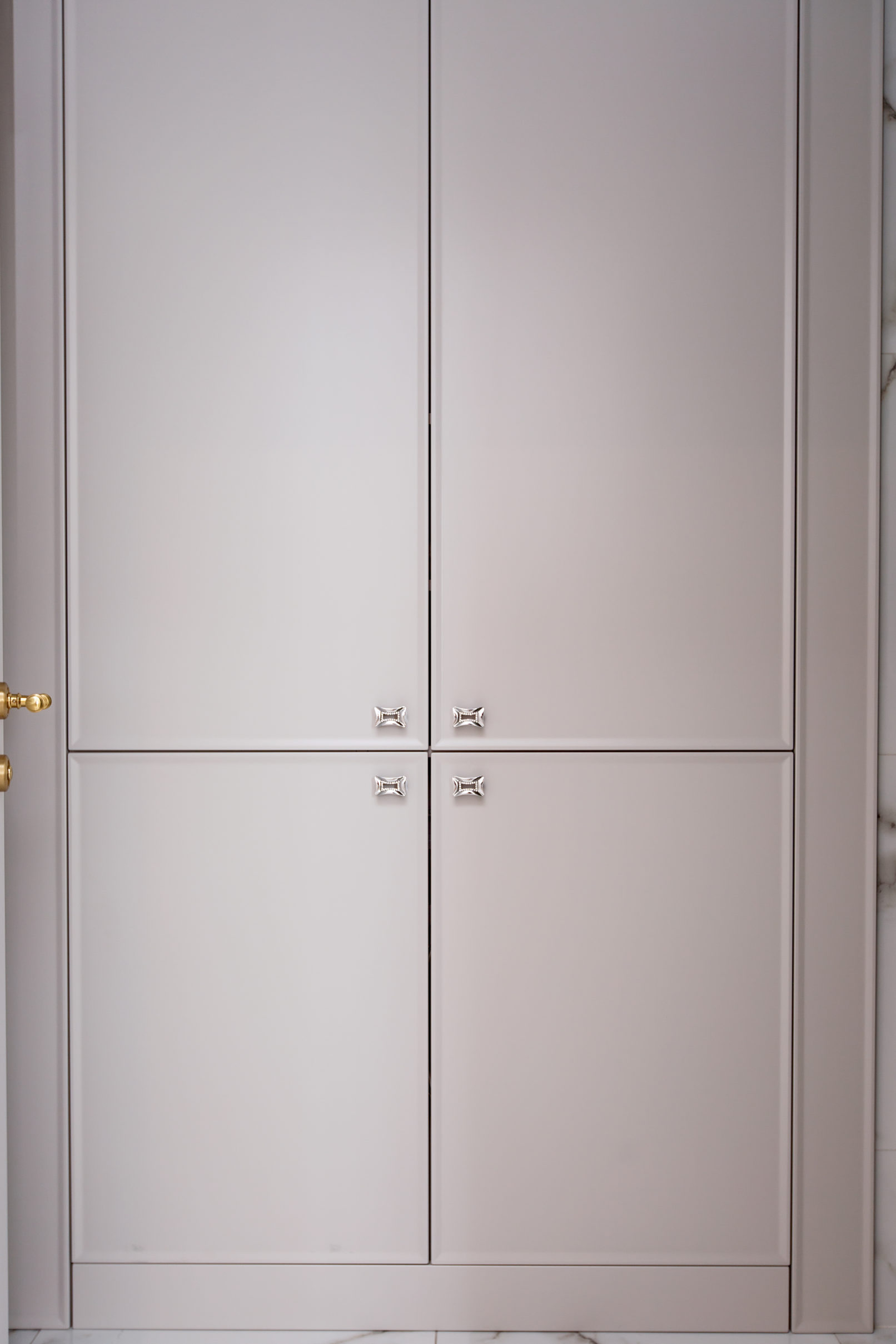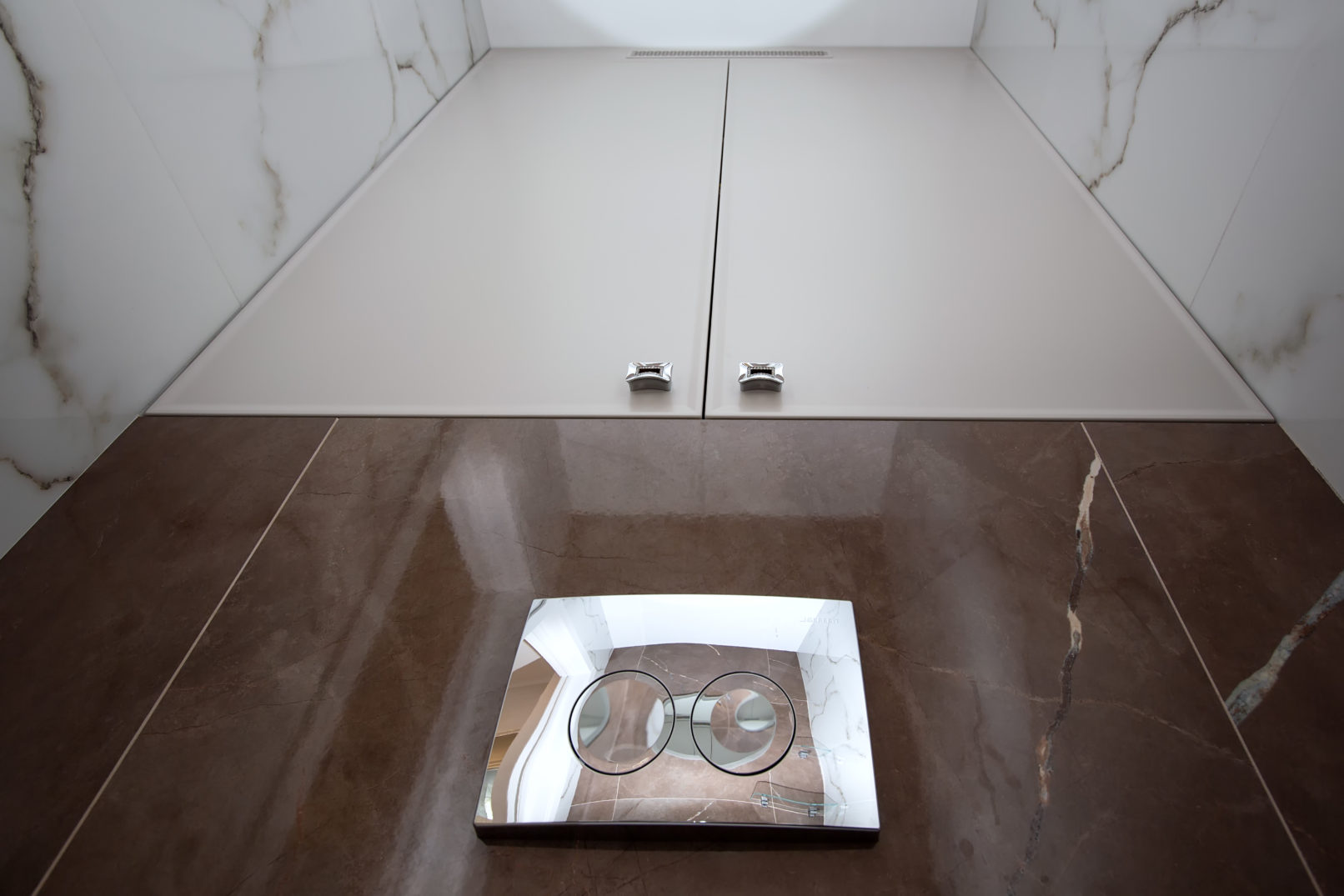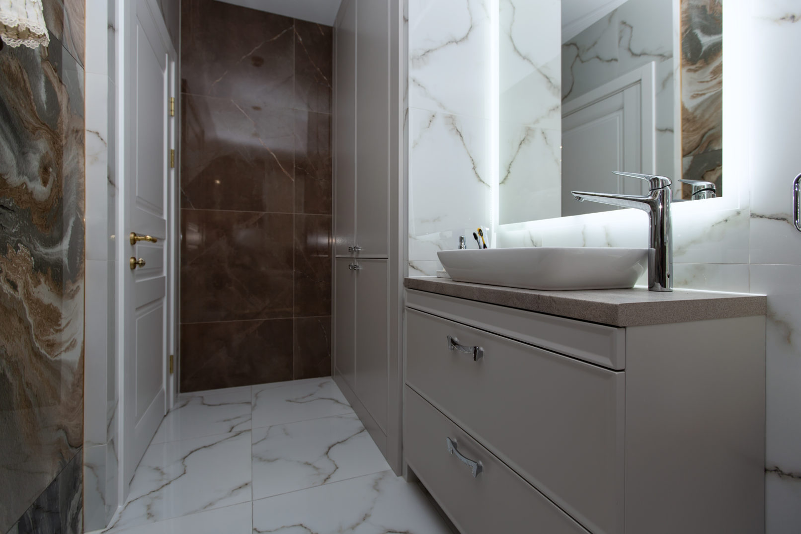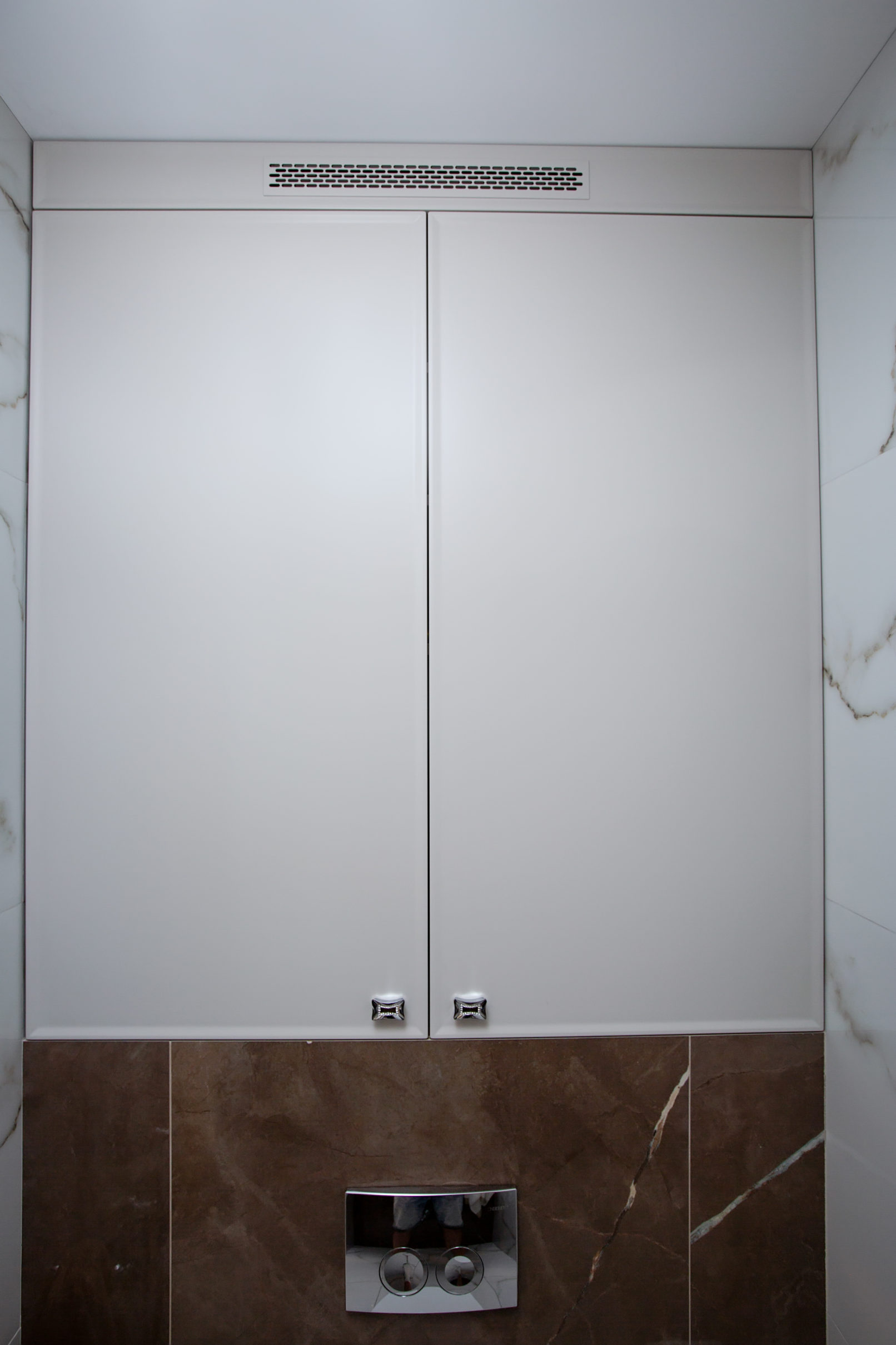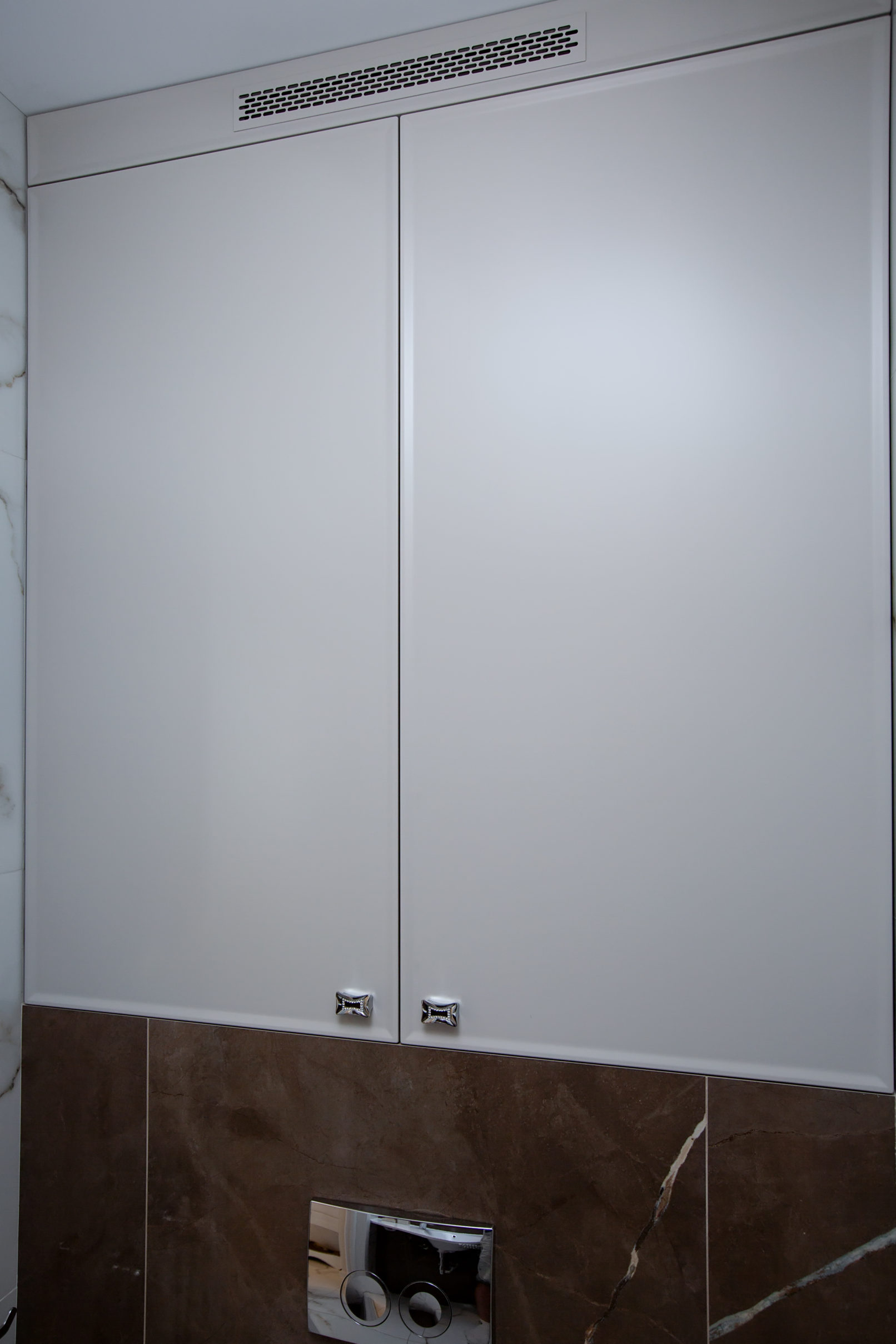Шафа для інженерної зони виконана в єдиній стилістиці та повністю вбудована в нішу. Для облицювання використано керамограніт із мармуровим малюнком – це не лише красиво, а й стійко до вологи та забруднень. Всі елементи меблів виготовлені під розміри приміщення, з урахуванням зручності доступу до сантехнічних вузлів.