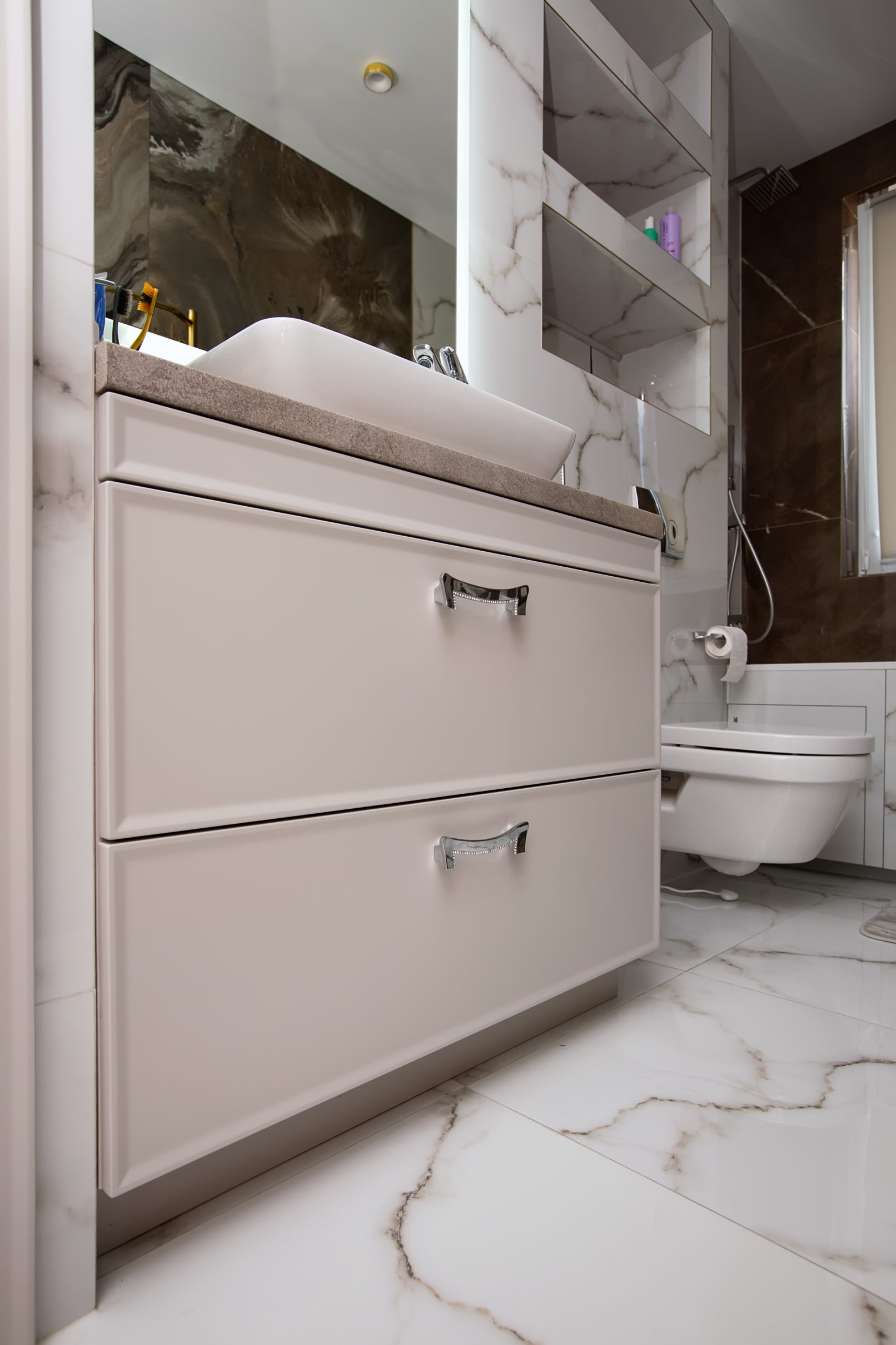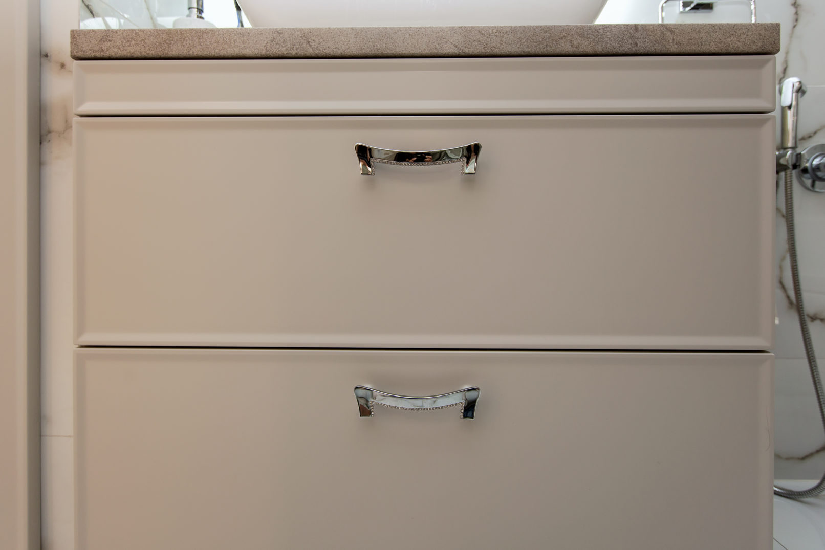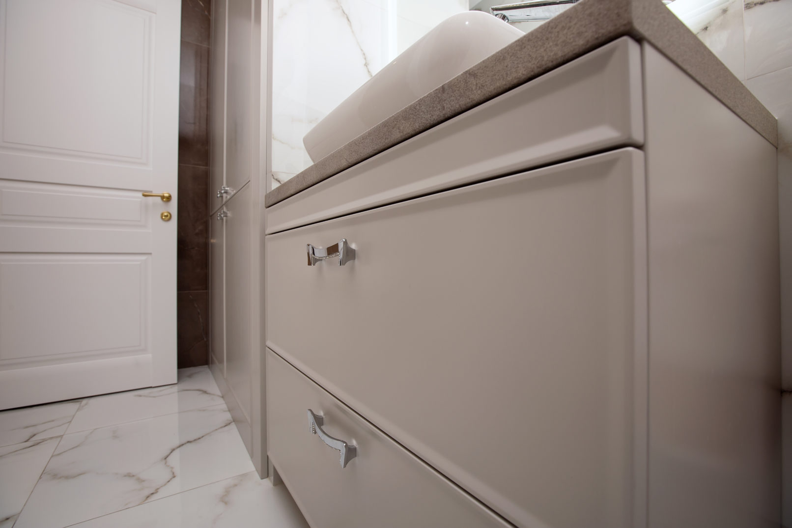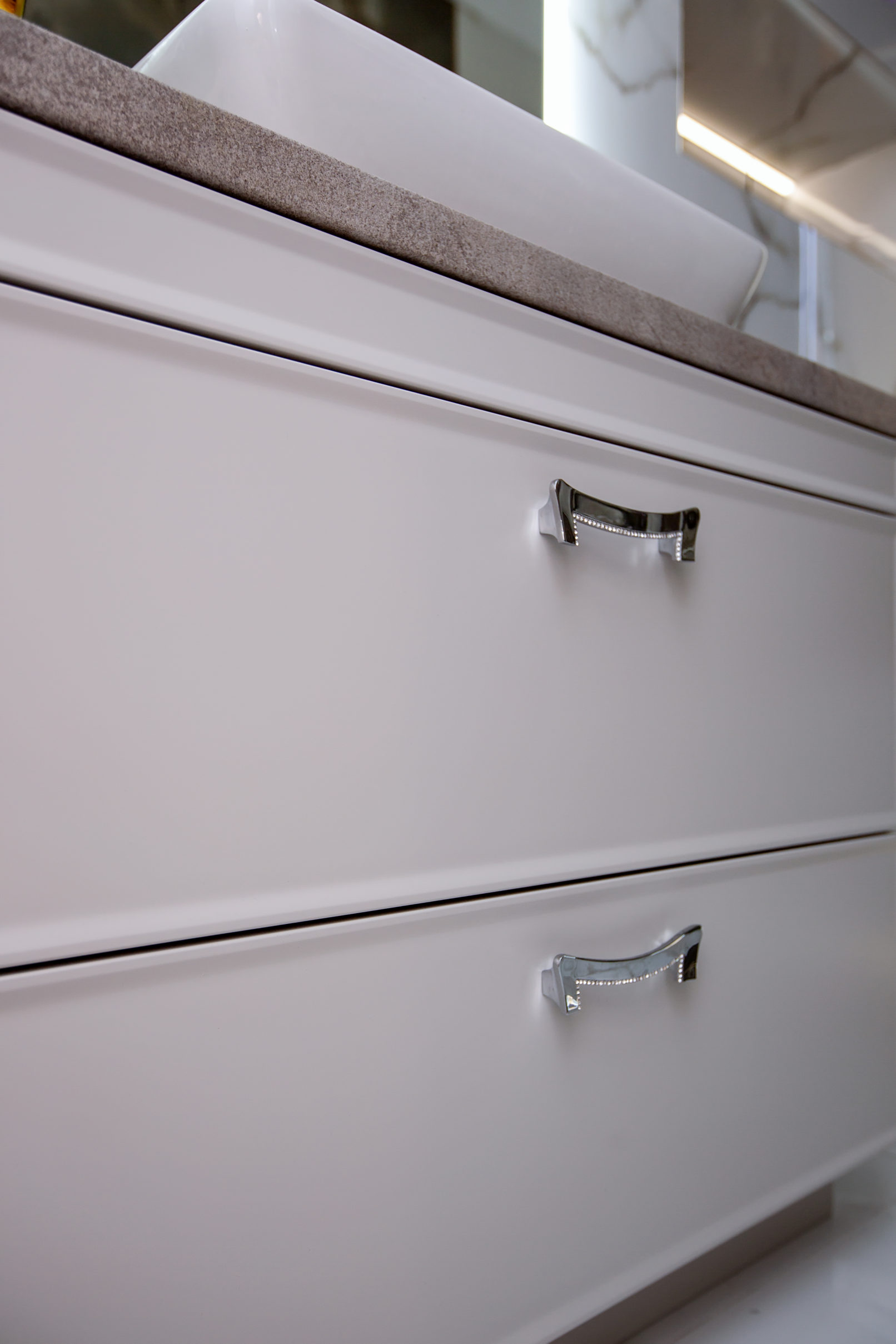 Ці меблі до ванної кімнати на замовлення поєднують у собі витончену класику та практичні сучасні рішення. Фасади оздоблені делікатним фрезеруванням, ручки зі вставками з кристалів додають інтер’єру елегантності. Стільниця під камінь створює контраст і гармонійно поєднується з раковиною накладного типу. Глибокі шухляди на напрямних із доводчиками забезпечують комфортне зберігання всіх необхідних речей.