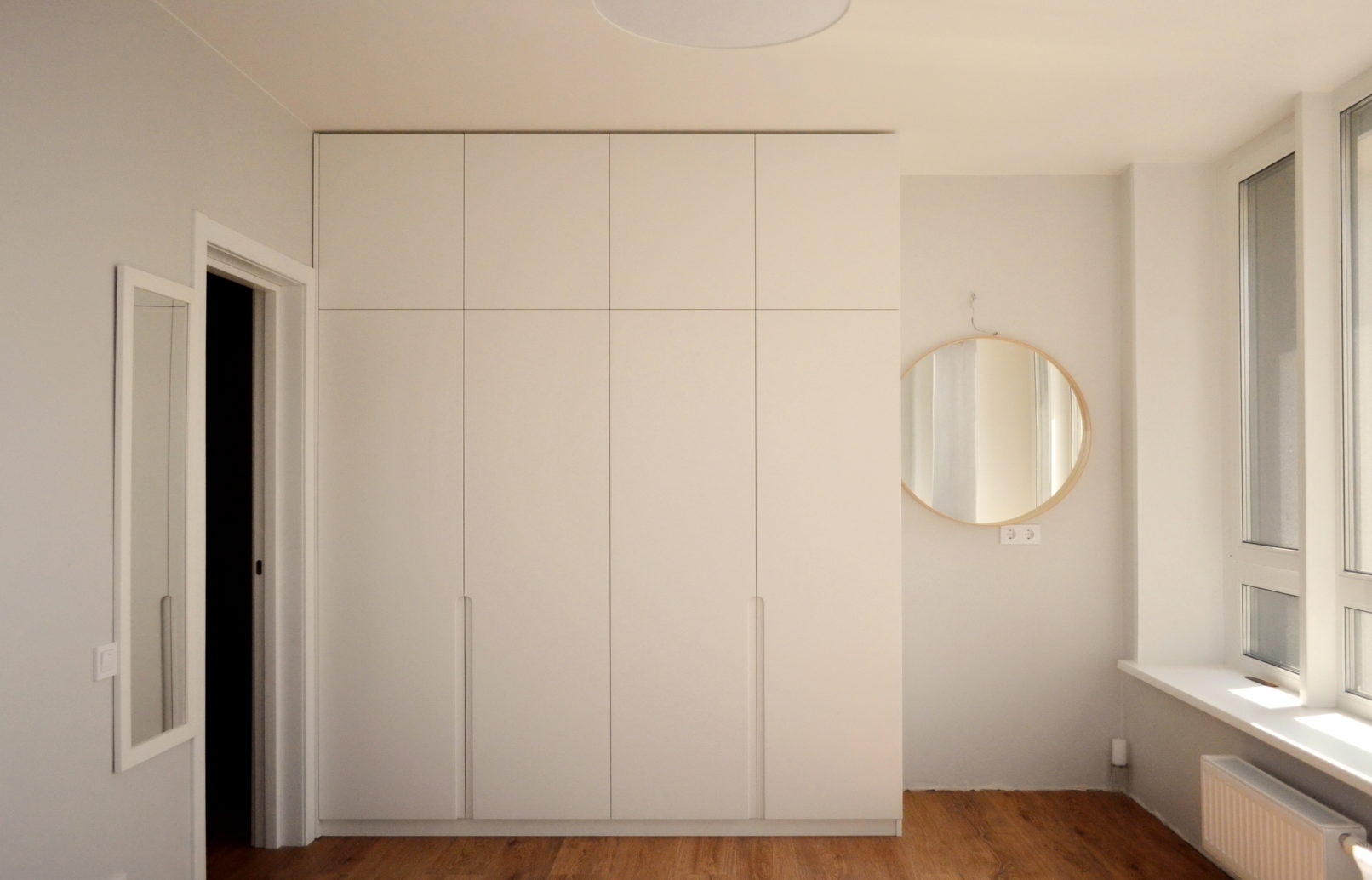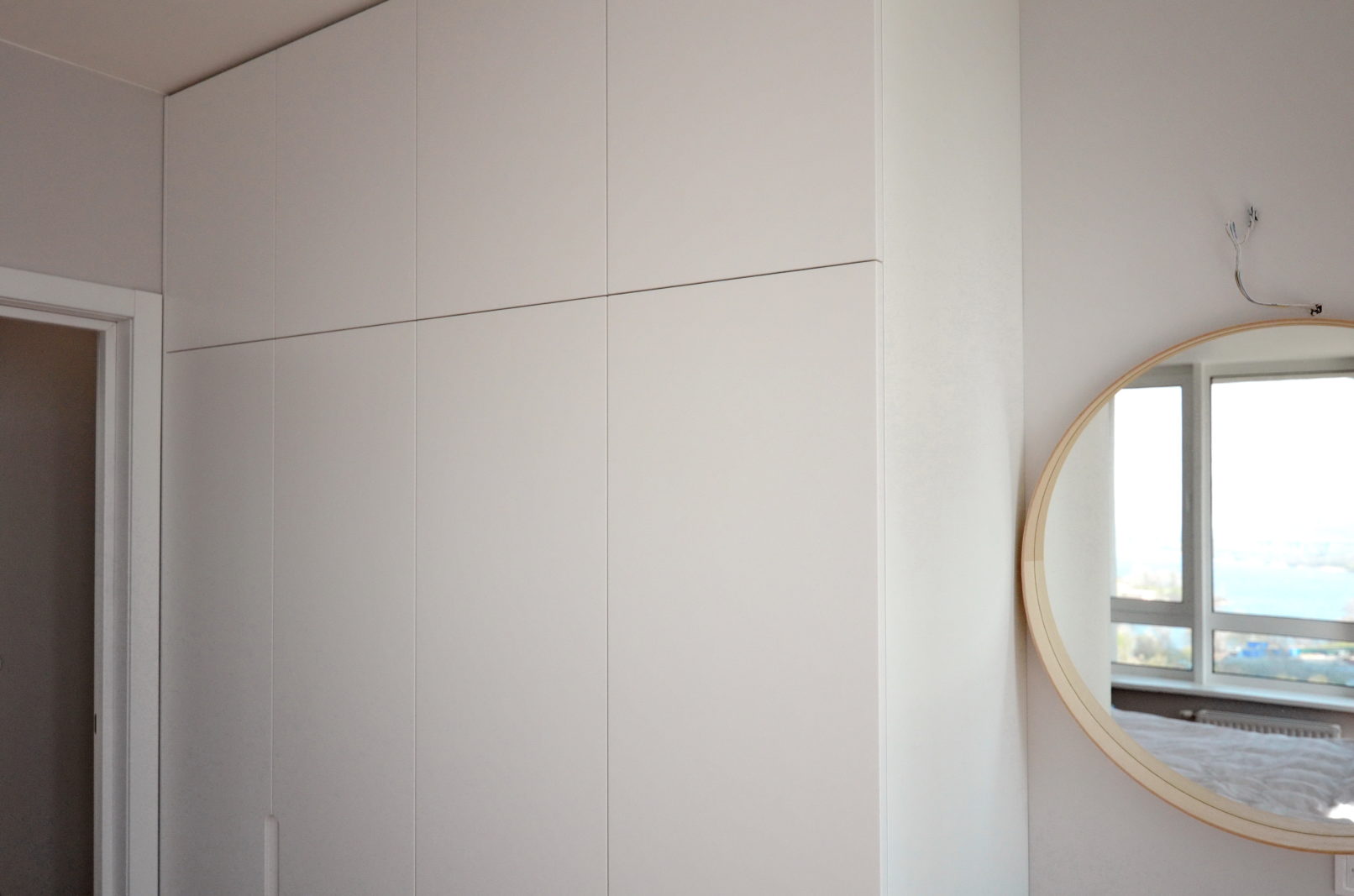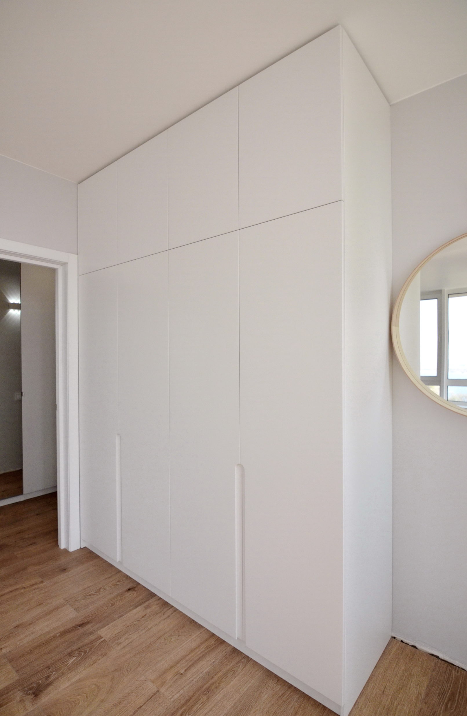 Ця шафа до спальні з фарбованого МДФ з інтегрованими ручками виготовлена на замовлення спеціально для спальні з урахуванням усіх побажань клієнта. Чиста геометрія, фарбовані фасади з МДФ та врізні ручки роблять конструкцію візуально легкою та сучасною. Висота до стелі дозволяє використати максимум простору для зберігання, а чіткі лінії фасадів зливаються зі стінами, не перевантажуючи інтер’єр. Фарбування матове, з приємною на дотик текстурою.