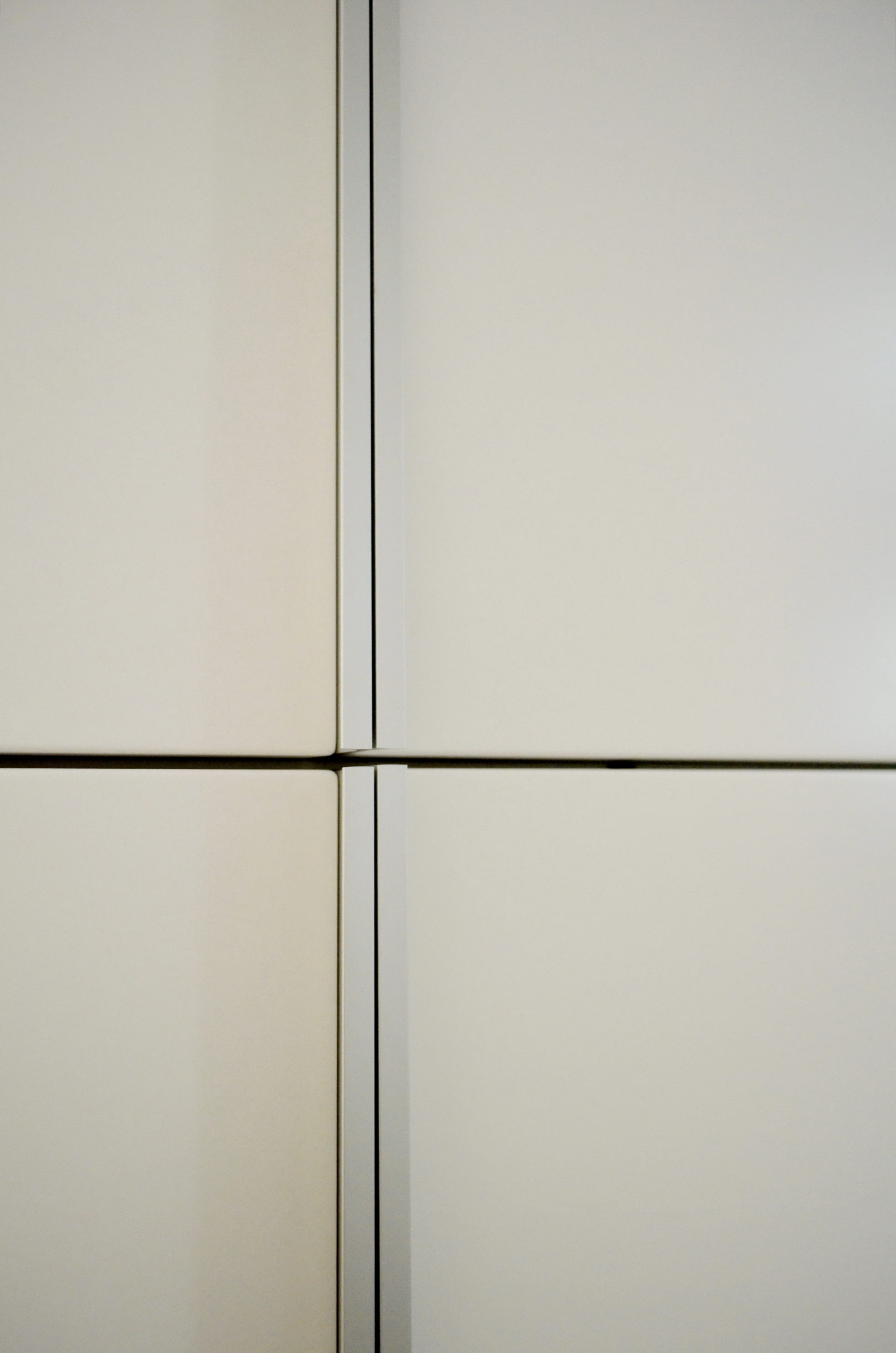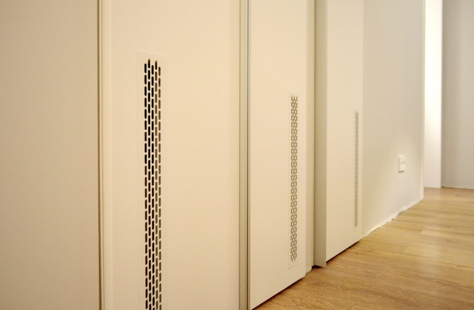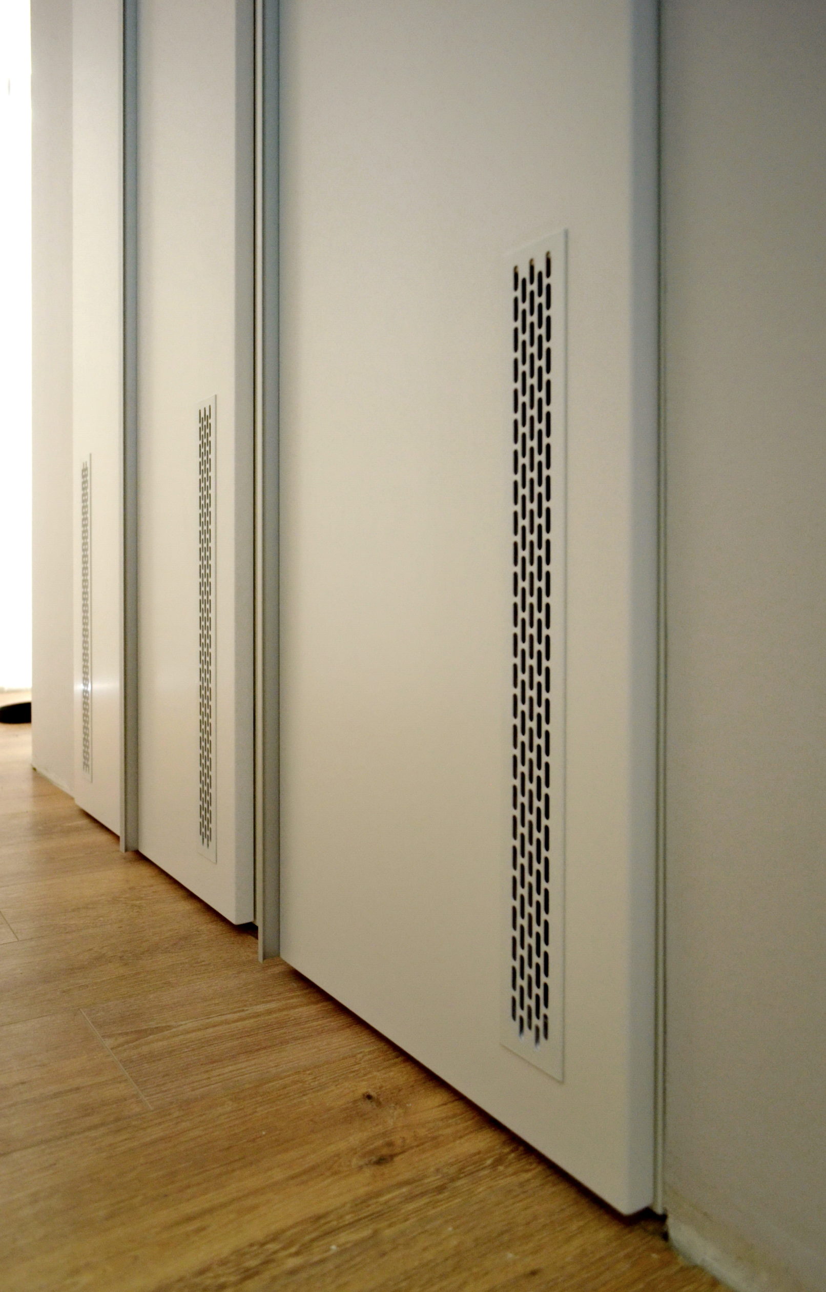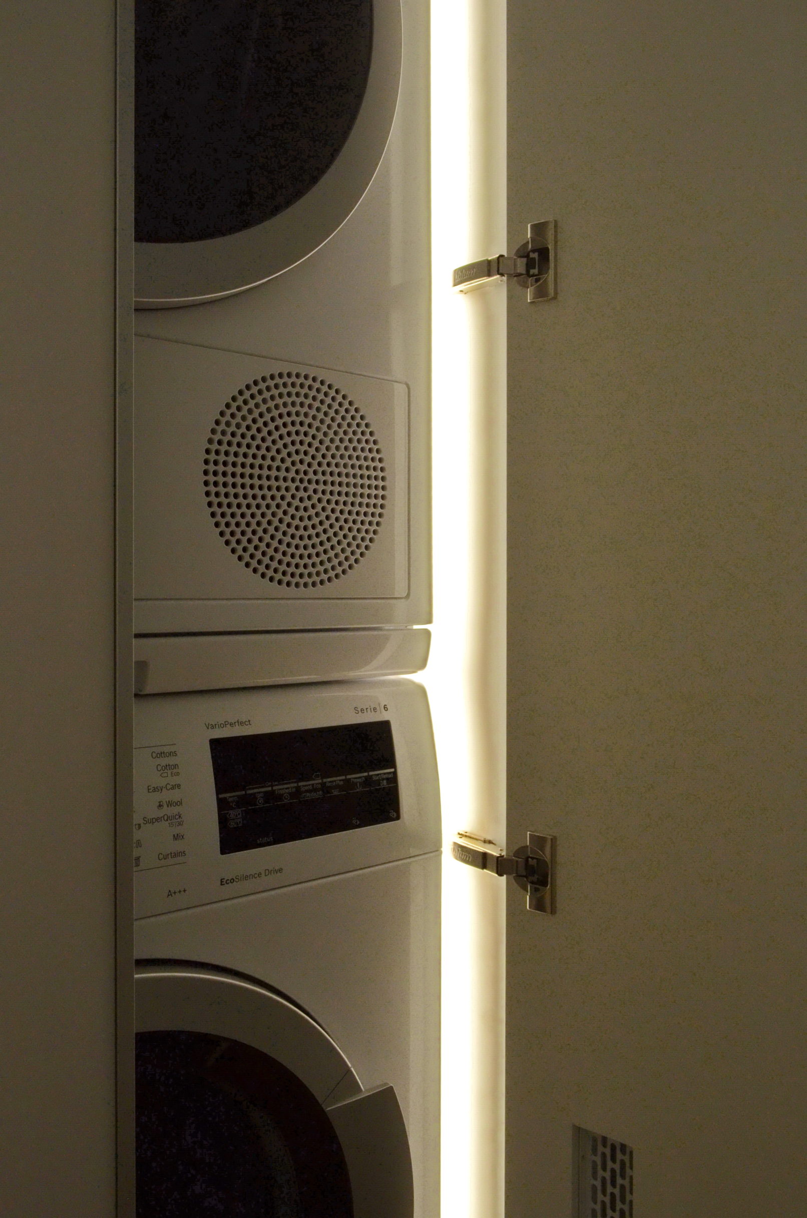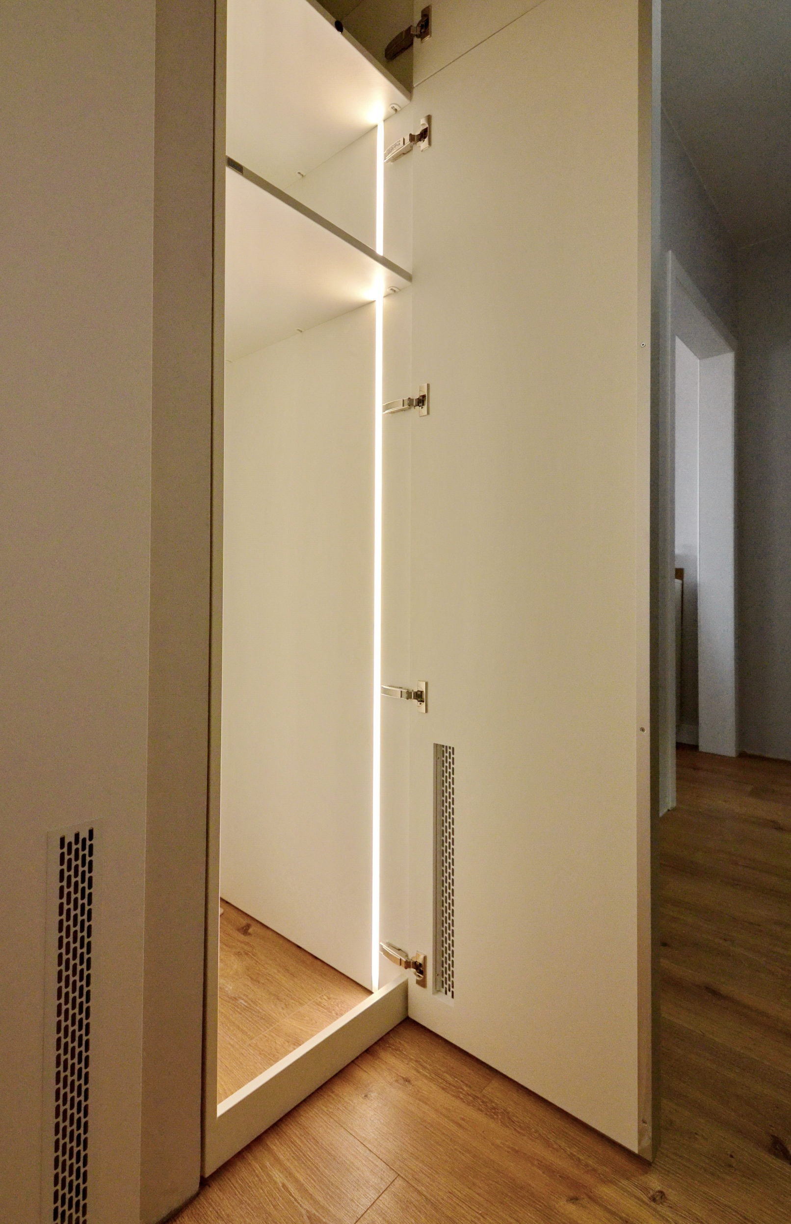 Для вентиляції техніки передбачені акуратні решітки внизу фасадів, а вертикальне LED-підсвічування всередині робить користування комфортним навіть у темний час доби. Фасади виконано у спокійному матовому відтінку – рішення виглядає стримано та естетично в інтер’єрі.