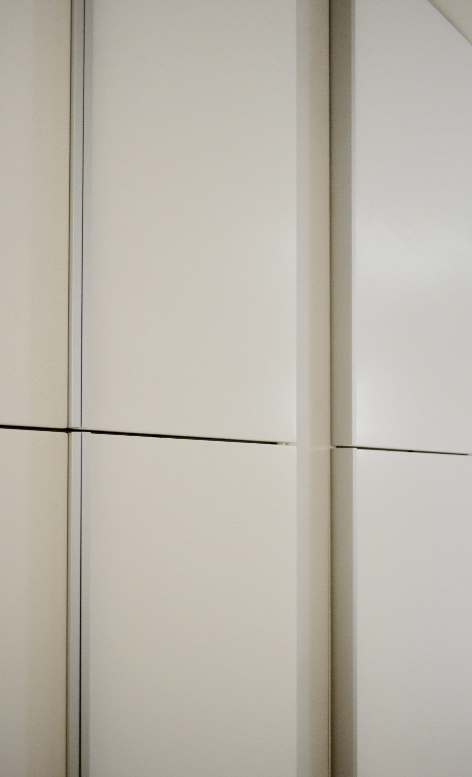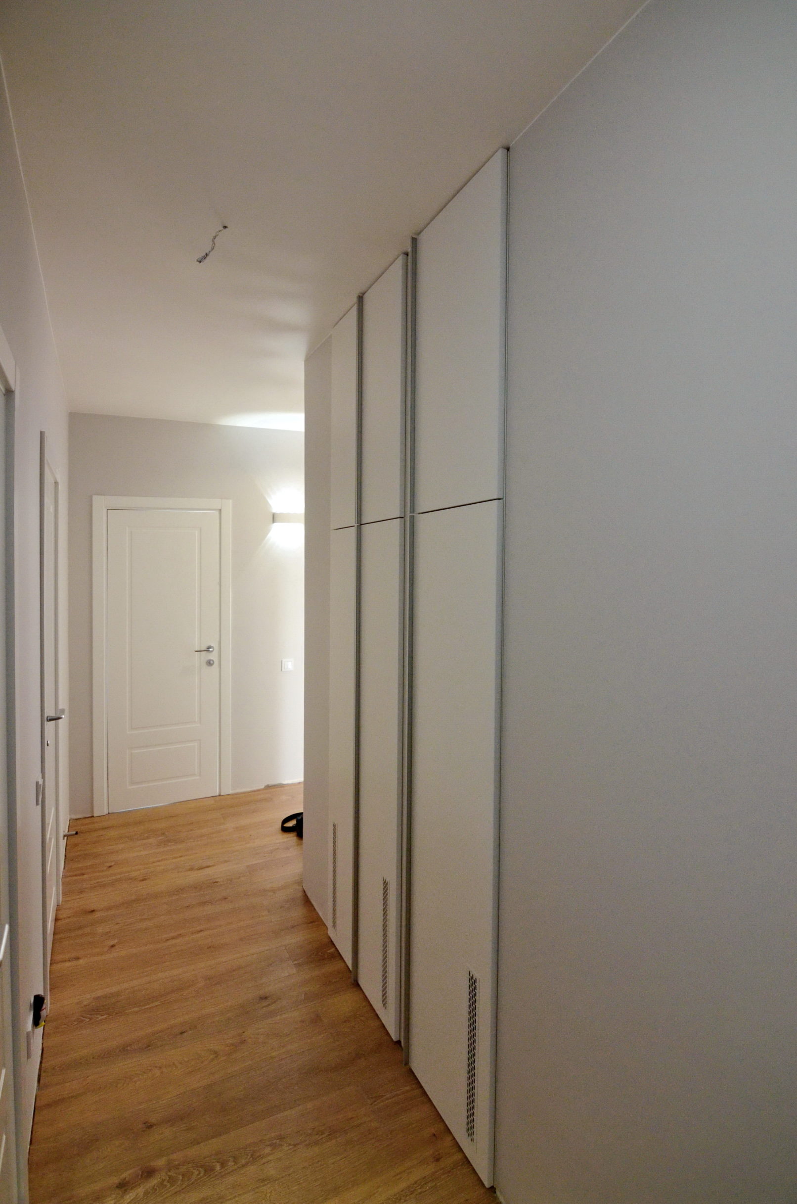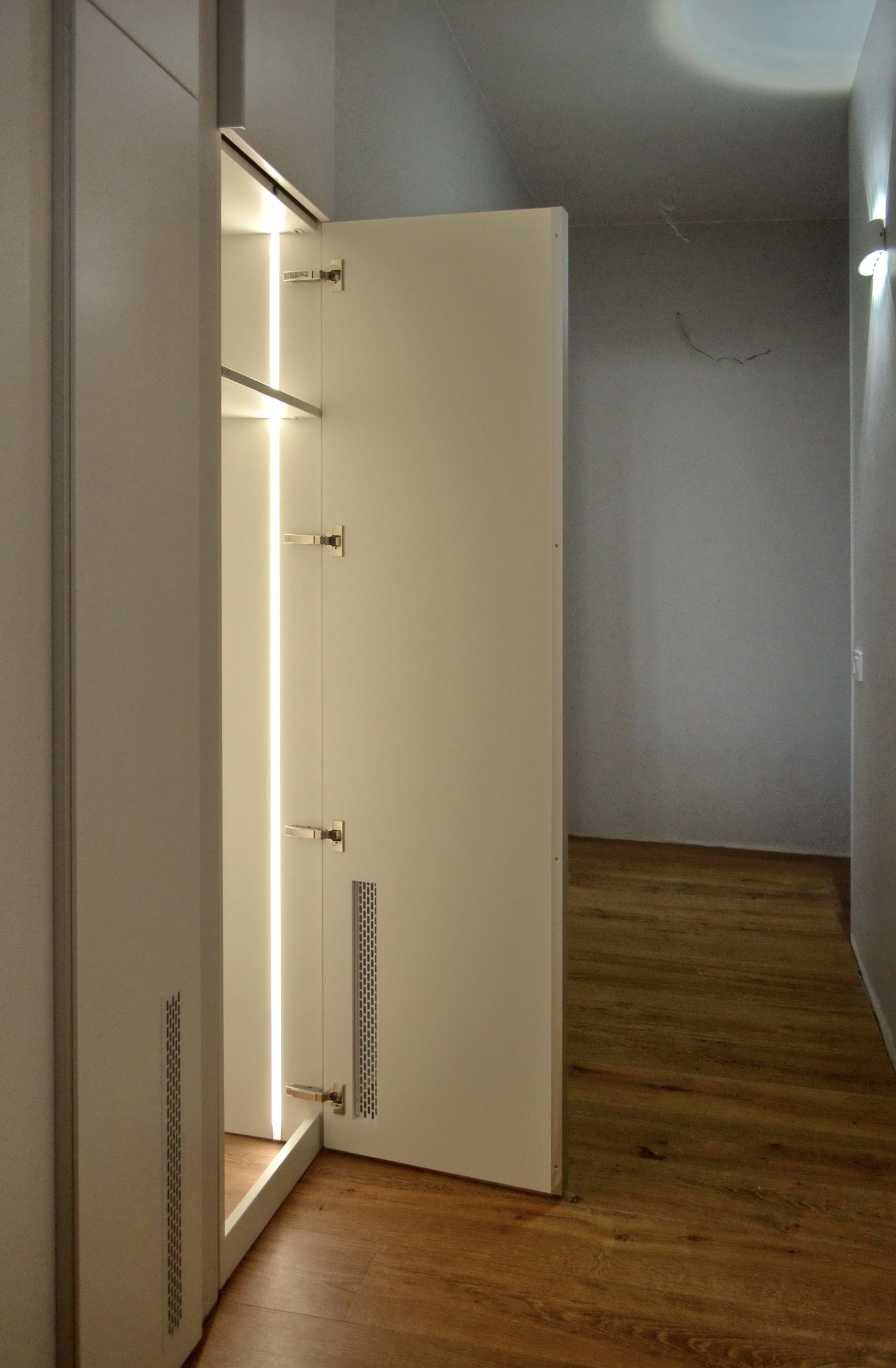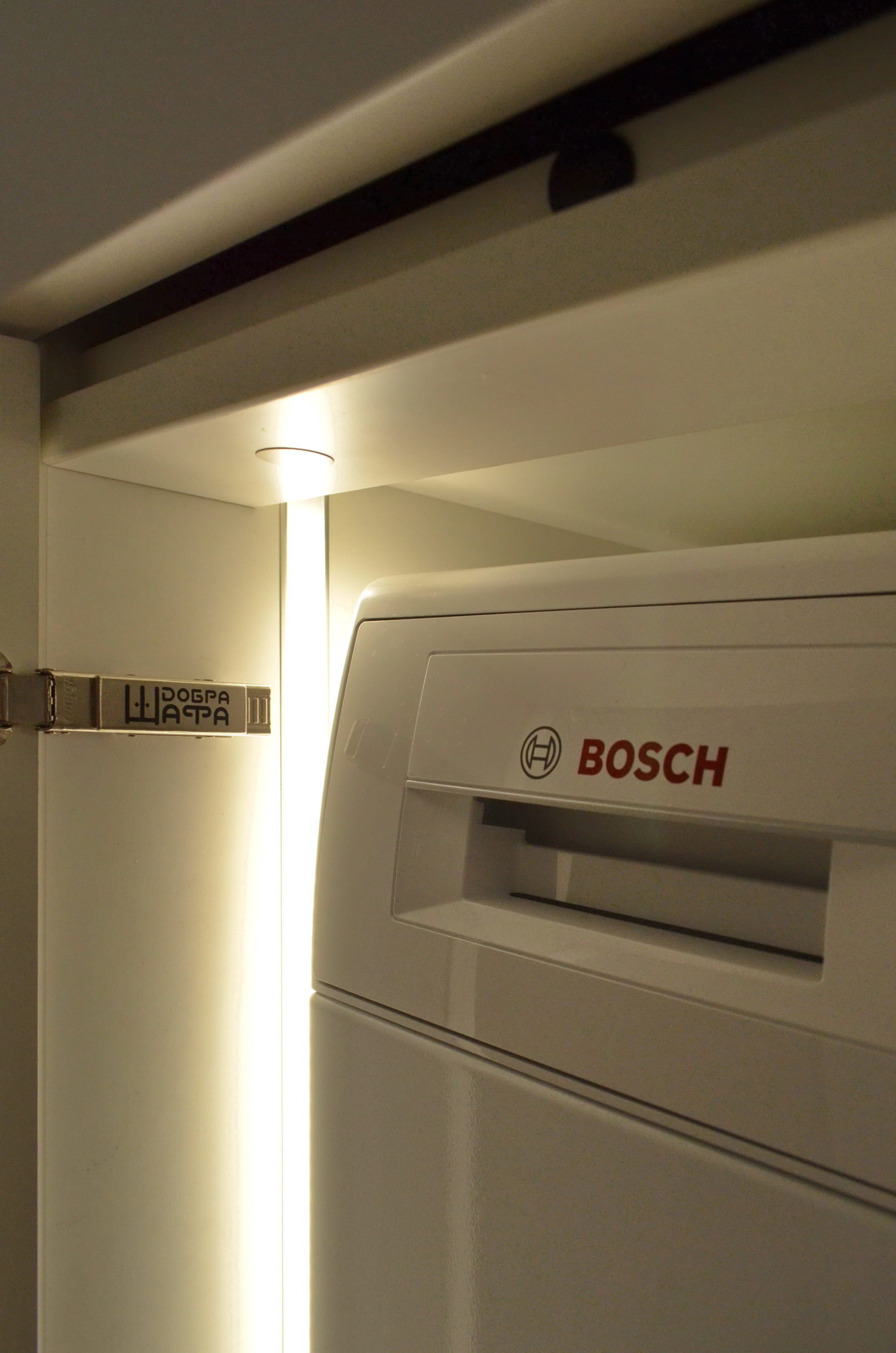 Фурнітура – з доводчиками, петлі з плавним закриванням. Кожен елемент підібрано так, аби шафа в коридор з вбудованою пральною машиноюне тільки виконувала свою функцію, а й гармонійно вписувалась у загальний стиль квартири.