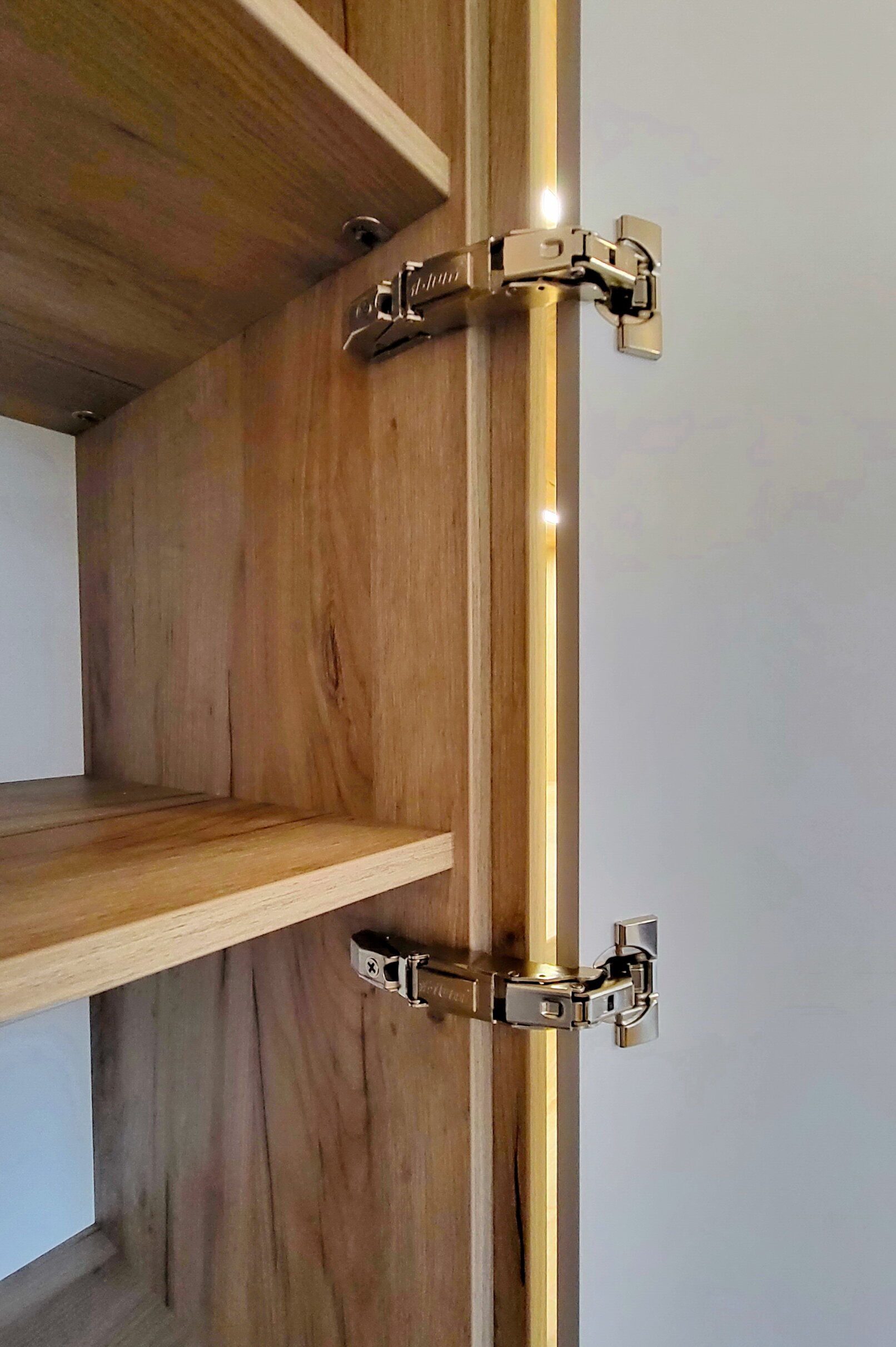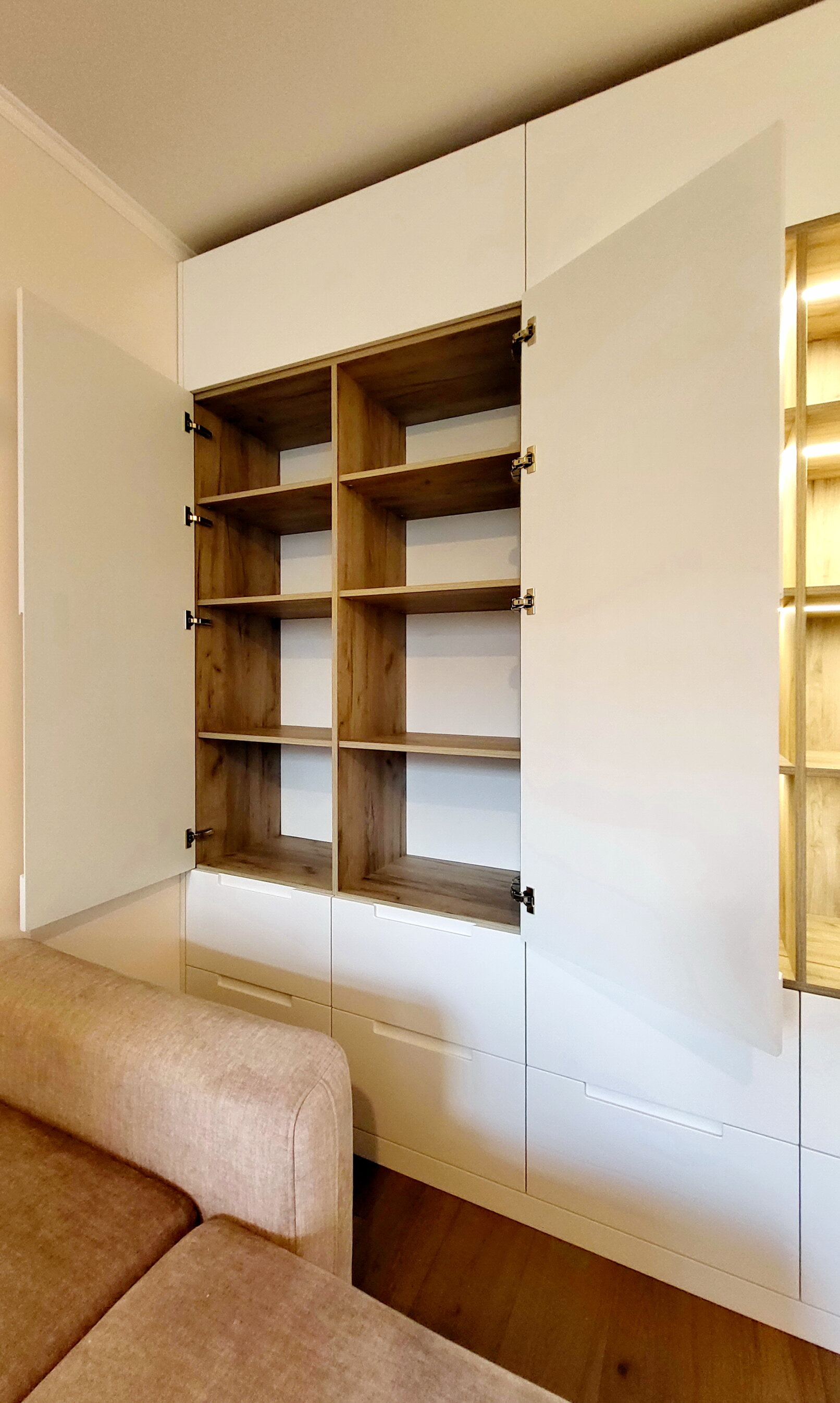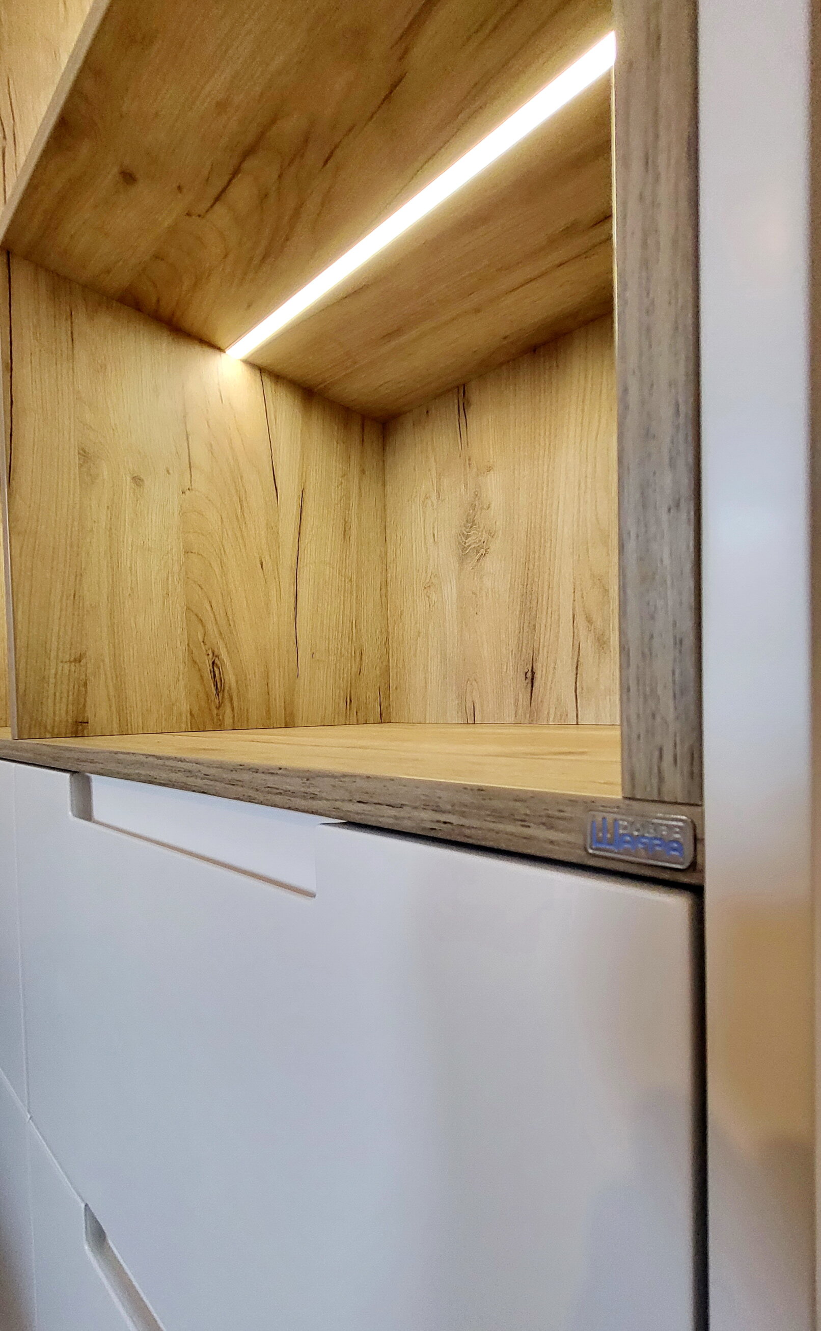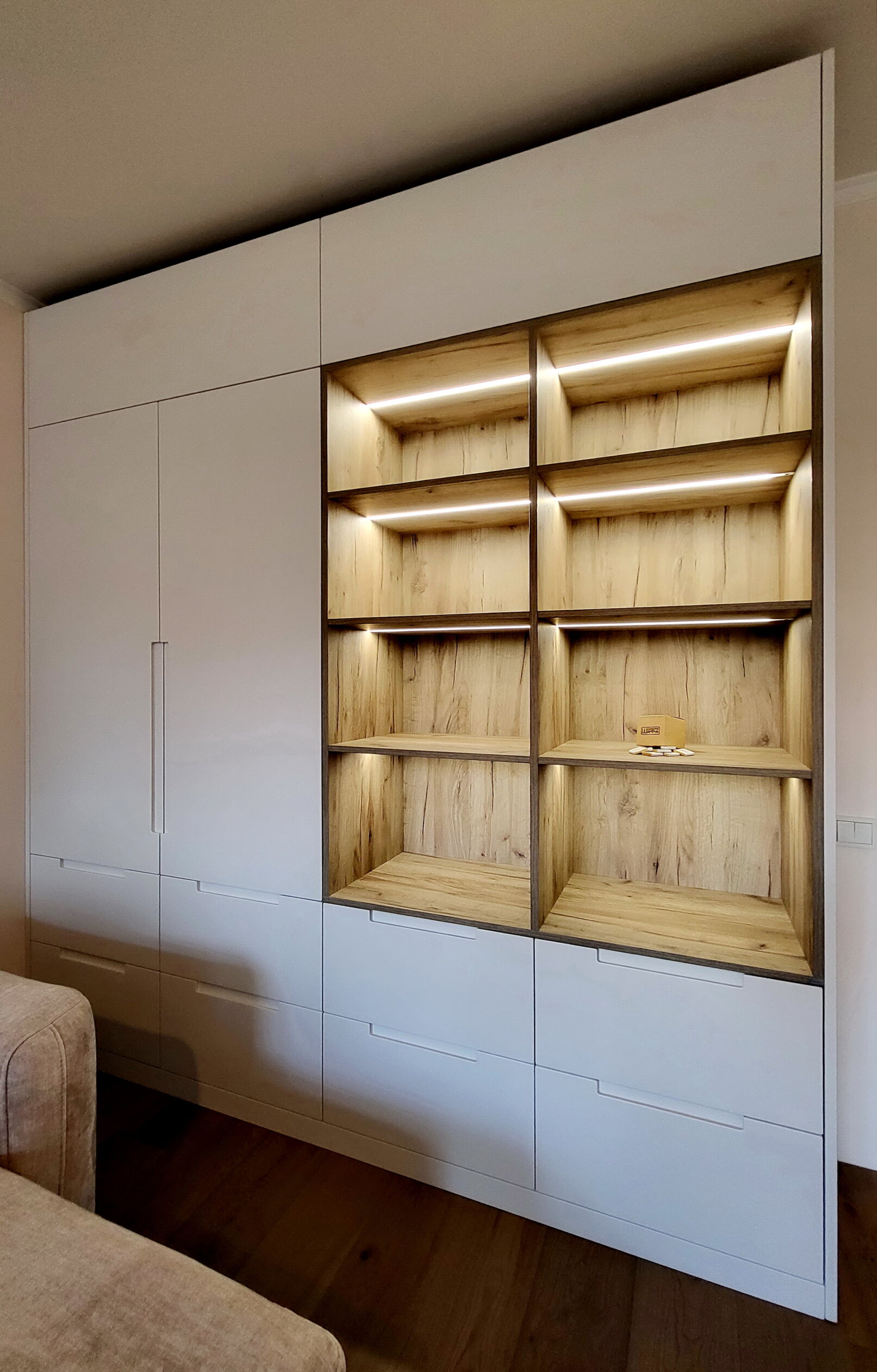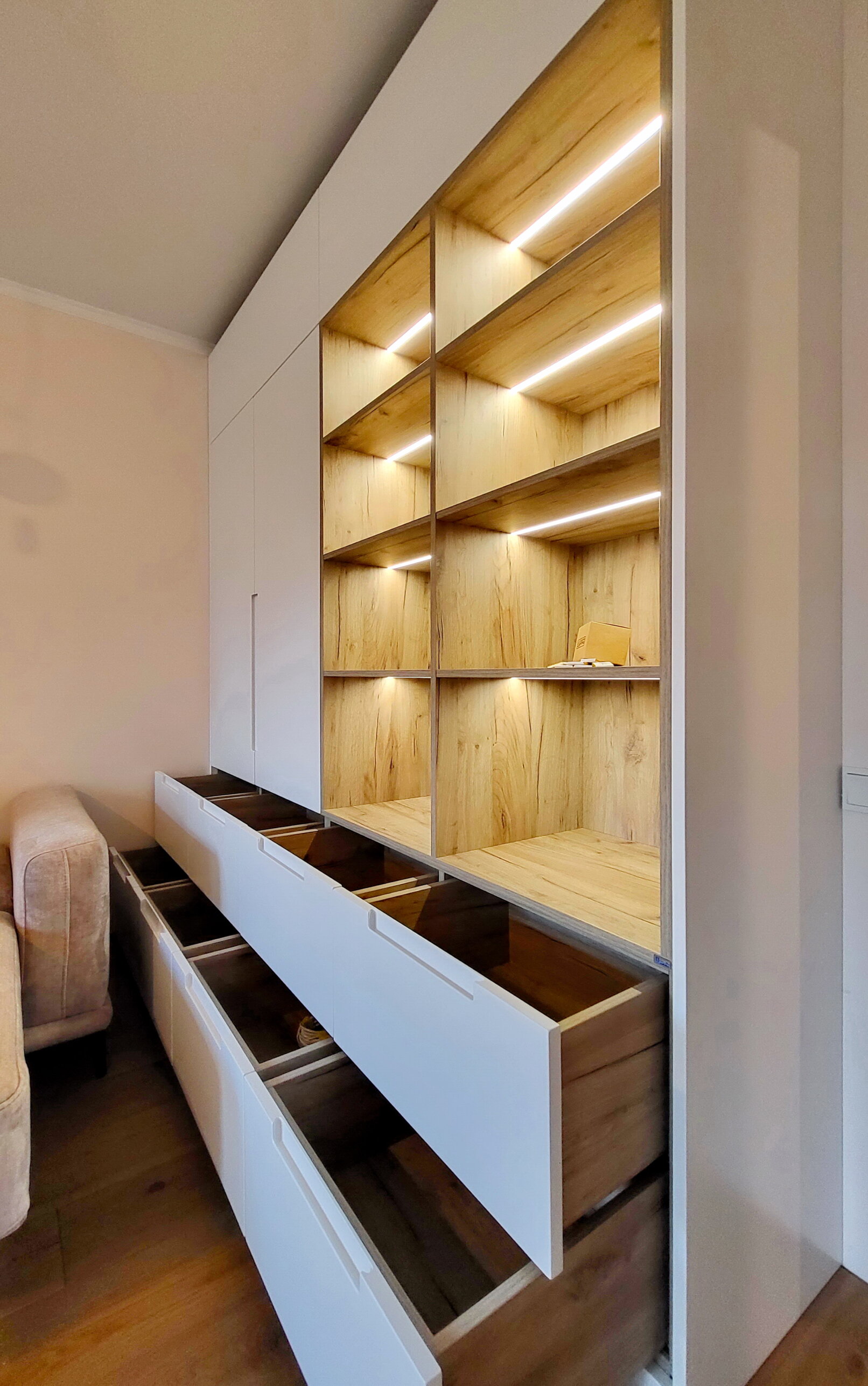 Якщо ви хочете замовити шафу, яка поєднує стиль і функціональність – цей проєкт саме про це. Шафа з фарбованими фасадами та LED-підсвічуванням полиць створює атмосферу затишку і підкреслює красу природного дерева.
