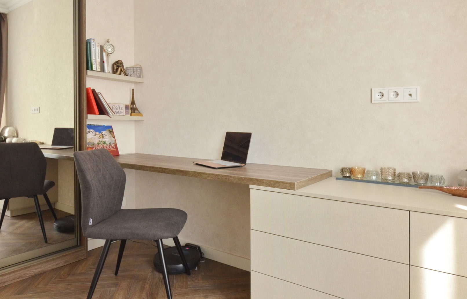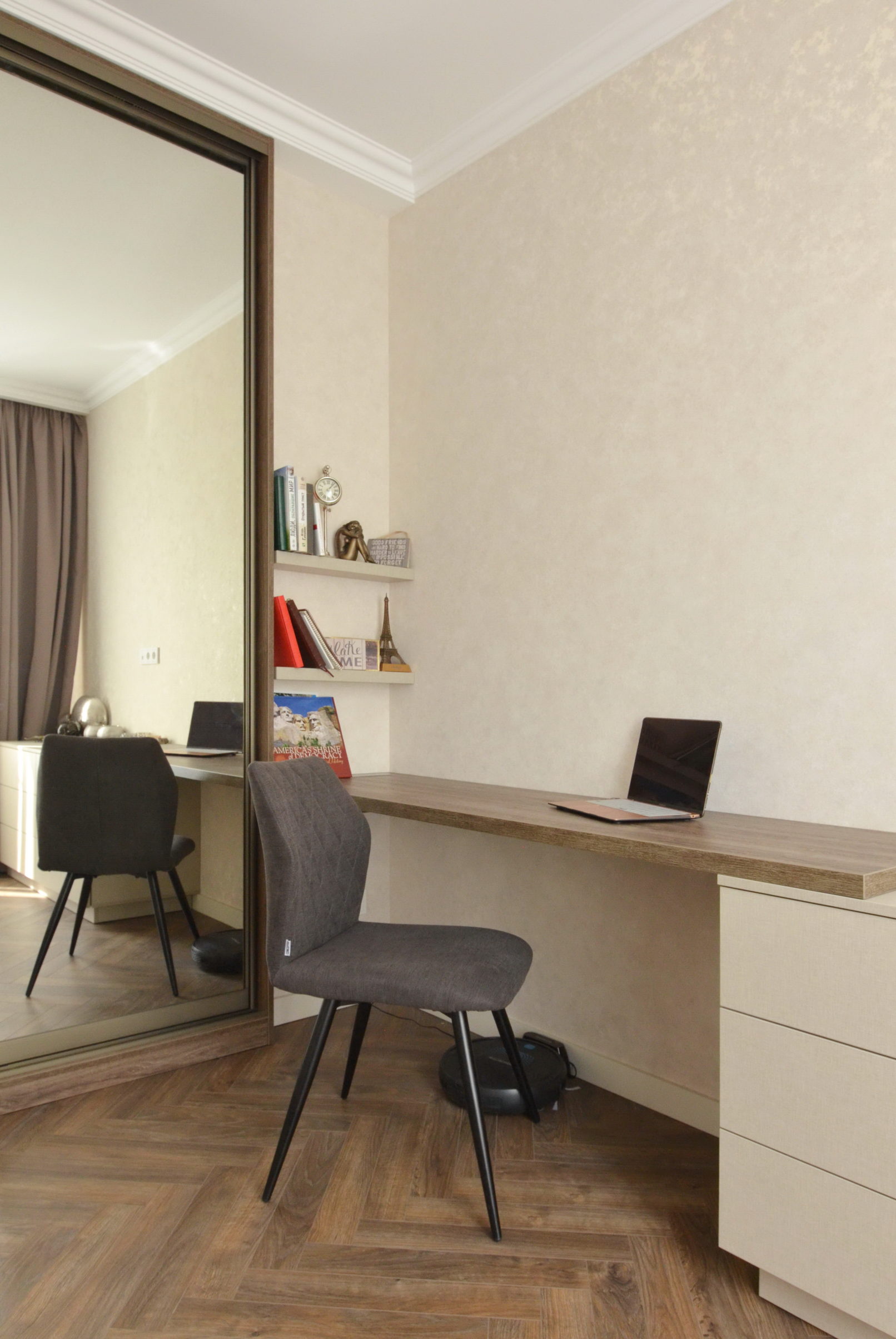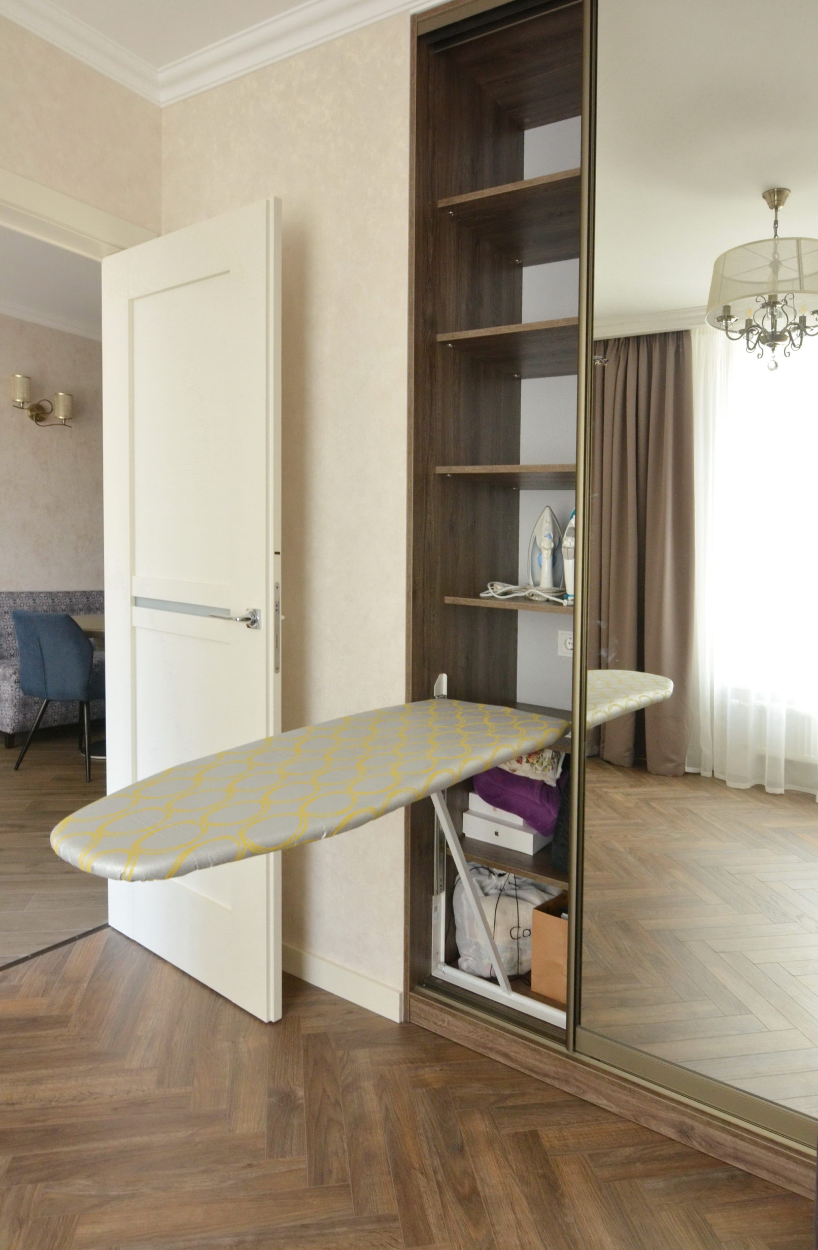 Функціональна зона зберігання, робоче місце й прихована прасувальна дошка – усе це в одному проєкті. Вбудована шафа з робочим місцем та прасувальною дошкою має дзеркальні фасади, що візуально розширють простір. У бічній секції інтегровано механізм прасувальної дошки, яка швидко розкладається й не займає місця у повсякденному використанні. Поруч – робочий стіл з стільницею з ДСП 36 мм та зручний комод. Фасади без ручок створюють чисту, стриману геометрію. Використано якісну фурнітуру з доводчиками та ПУР-клей для надійного крайкування. Кожен елемент адаптований до планування кімнати.