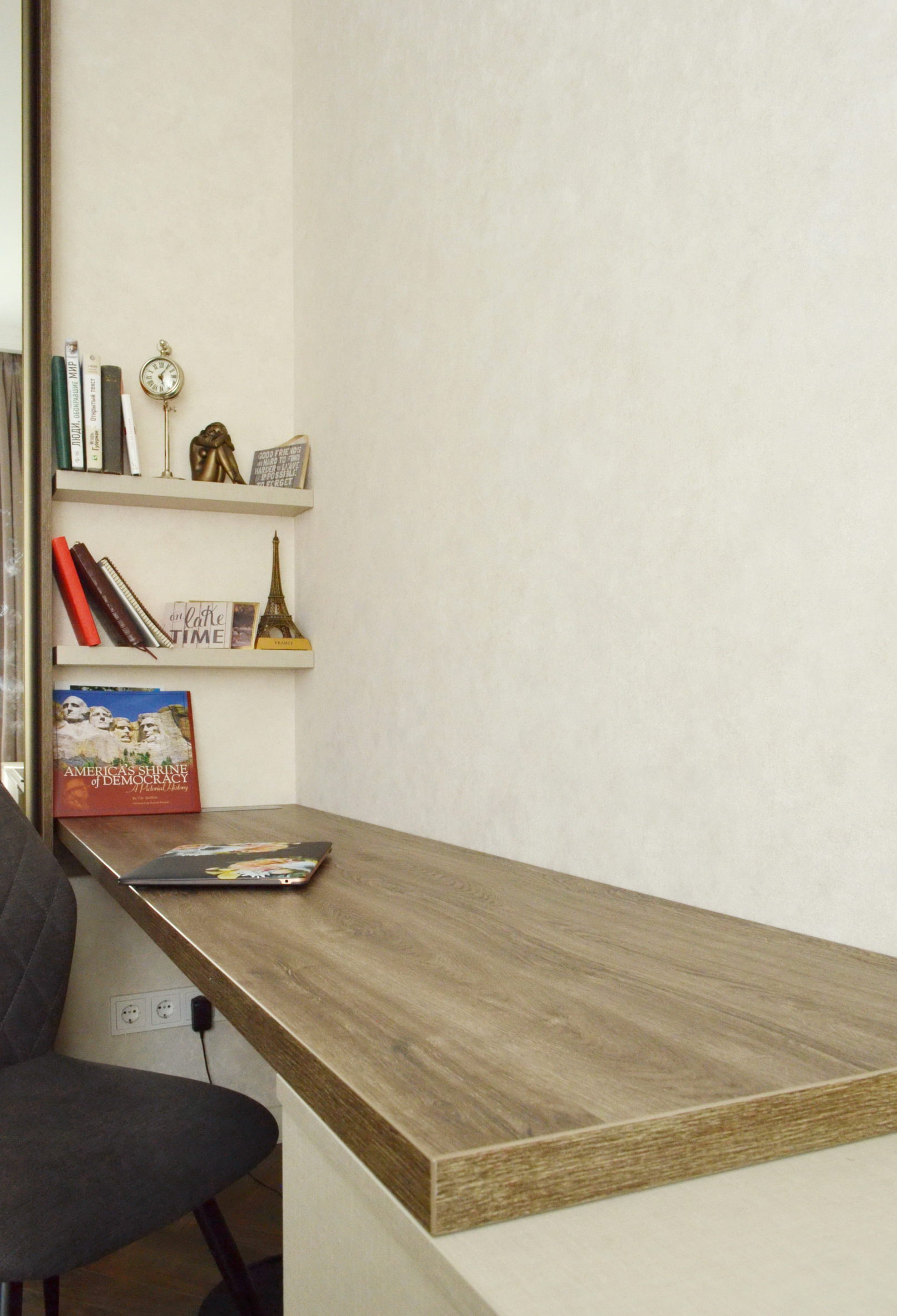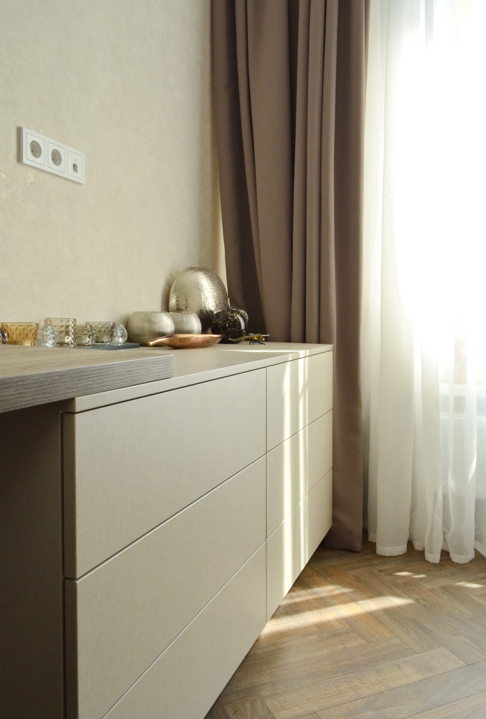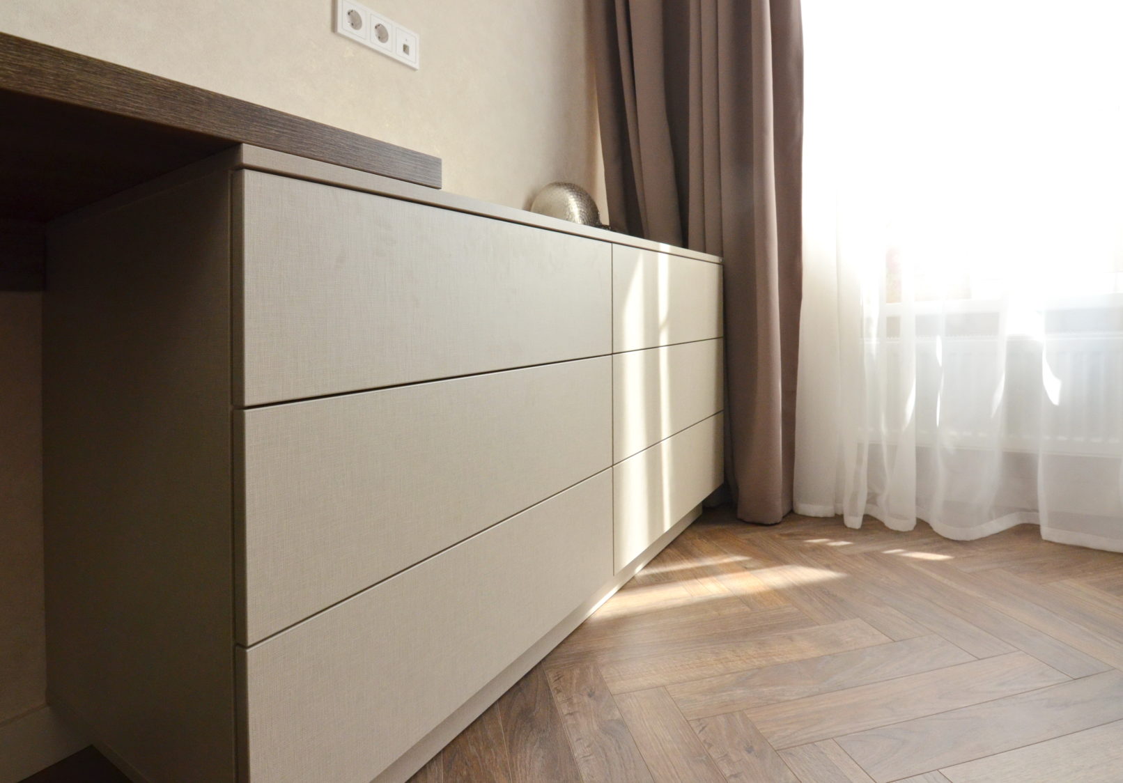 Функціональна зона зберігання, робоче місце й прихована прасувальна дошка – усе це в одному проєкті. Вбудована шафа з робочим місцем та прасувальною дошкою має дзеркальні фасади, що візуально розширють простір. У бічній секції інтегровано механізм прасувальної дошки, яка швидко розкладається й не займає місця у повсякденному використанні. Поруч – робочий стіл з стільницею з ДСП 36 мм та зручний комод. Фасади без ручок створюють чисту, стриману геометрію. Використано якісну фурнітуру з доводчиками та ПУР-клей для надійного крайкування. Кожен елемент адаптований до планування кімнати.