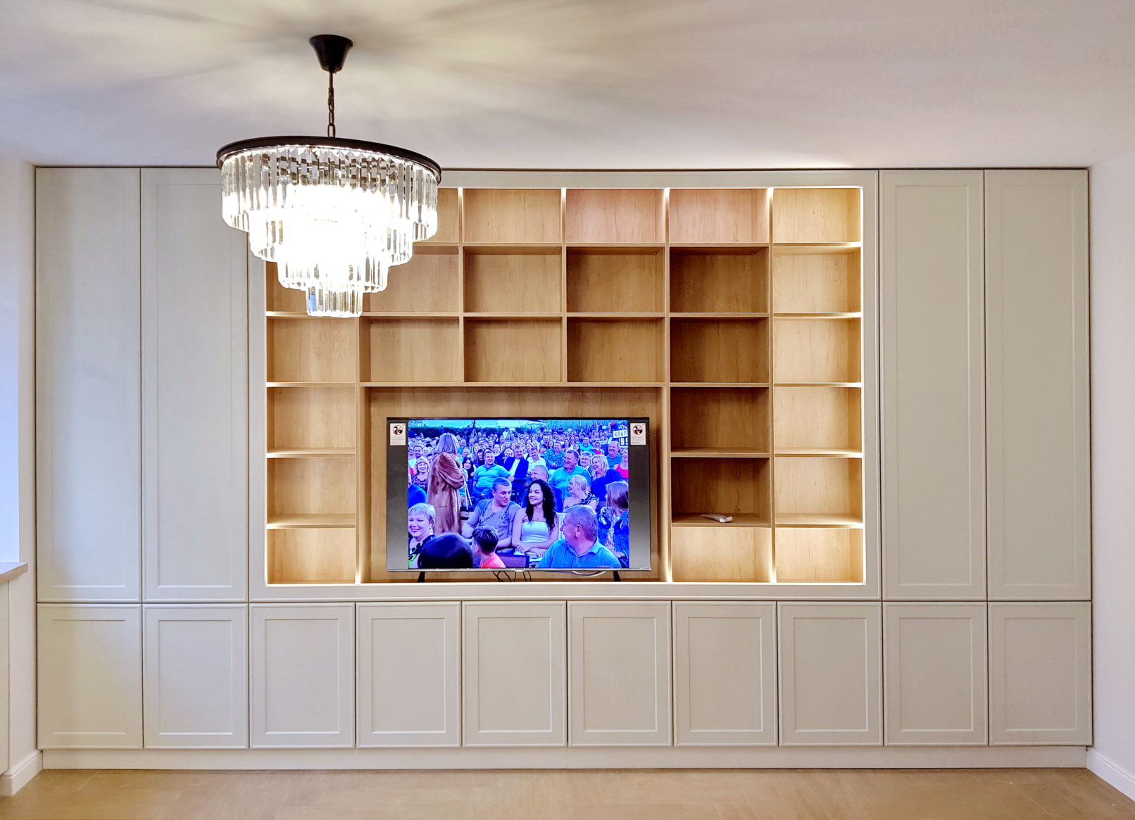 Шафа спроєктована з урахуванням місця для телевізора, закритих модулів для зберігання і відкритих полиць для книг чи декору. Ніжна палітра фасадів робить масивну конструкцію візуально легкою, а вертикальні лінії надають інтер’єру гармонії.