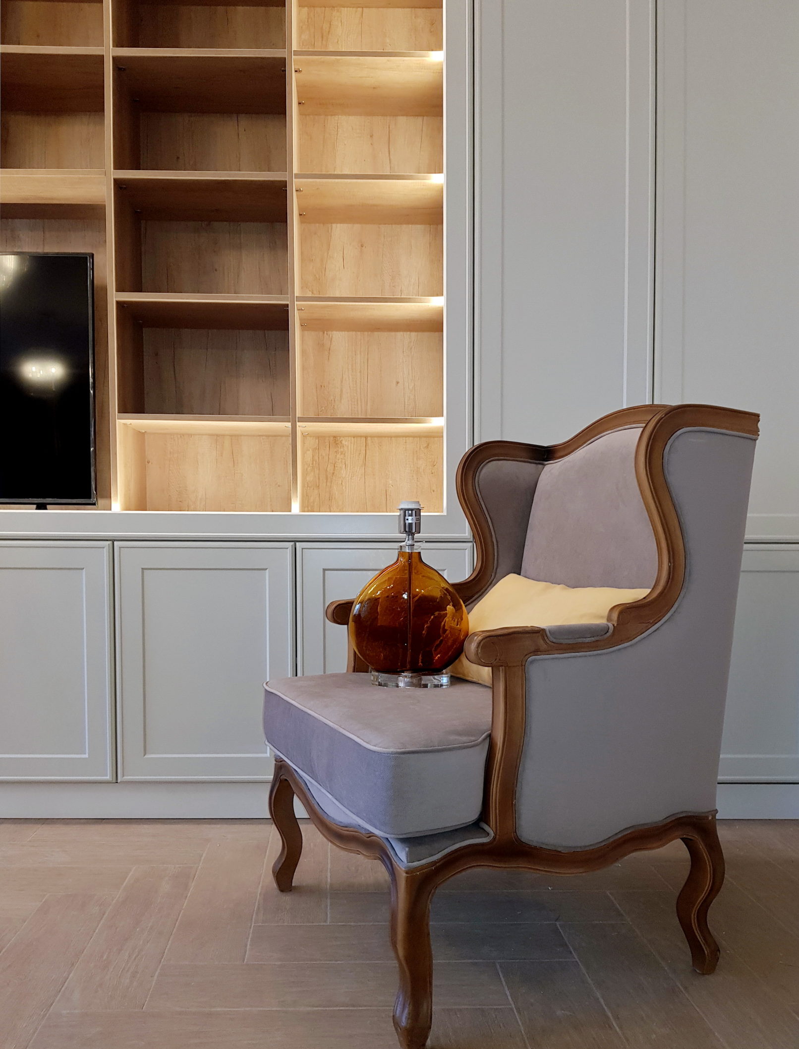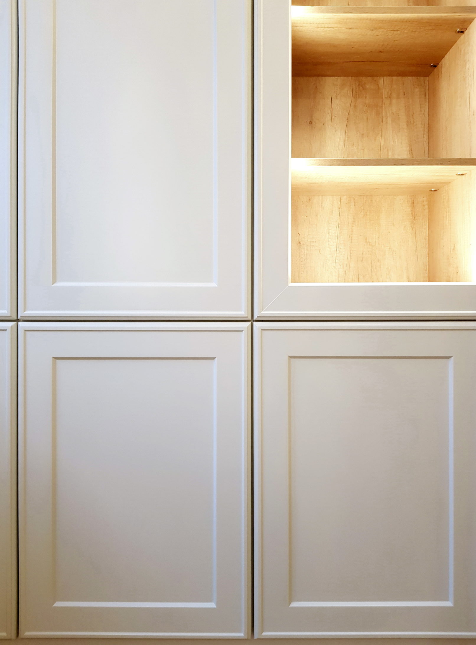 Шафа у вітальню може бути не лише функціональною, а й естетичною домінантою інтер’єру. У цьому проєкті ми поєднали класичні фасади з натуральною текстурою дуба всередині та інтегрованим підсвічуванням полиць. Така конструкція підкреслює архітектурність композиції і водночас створює затишну атмосферу.