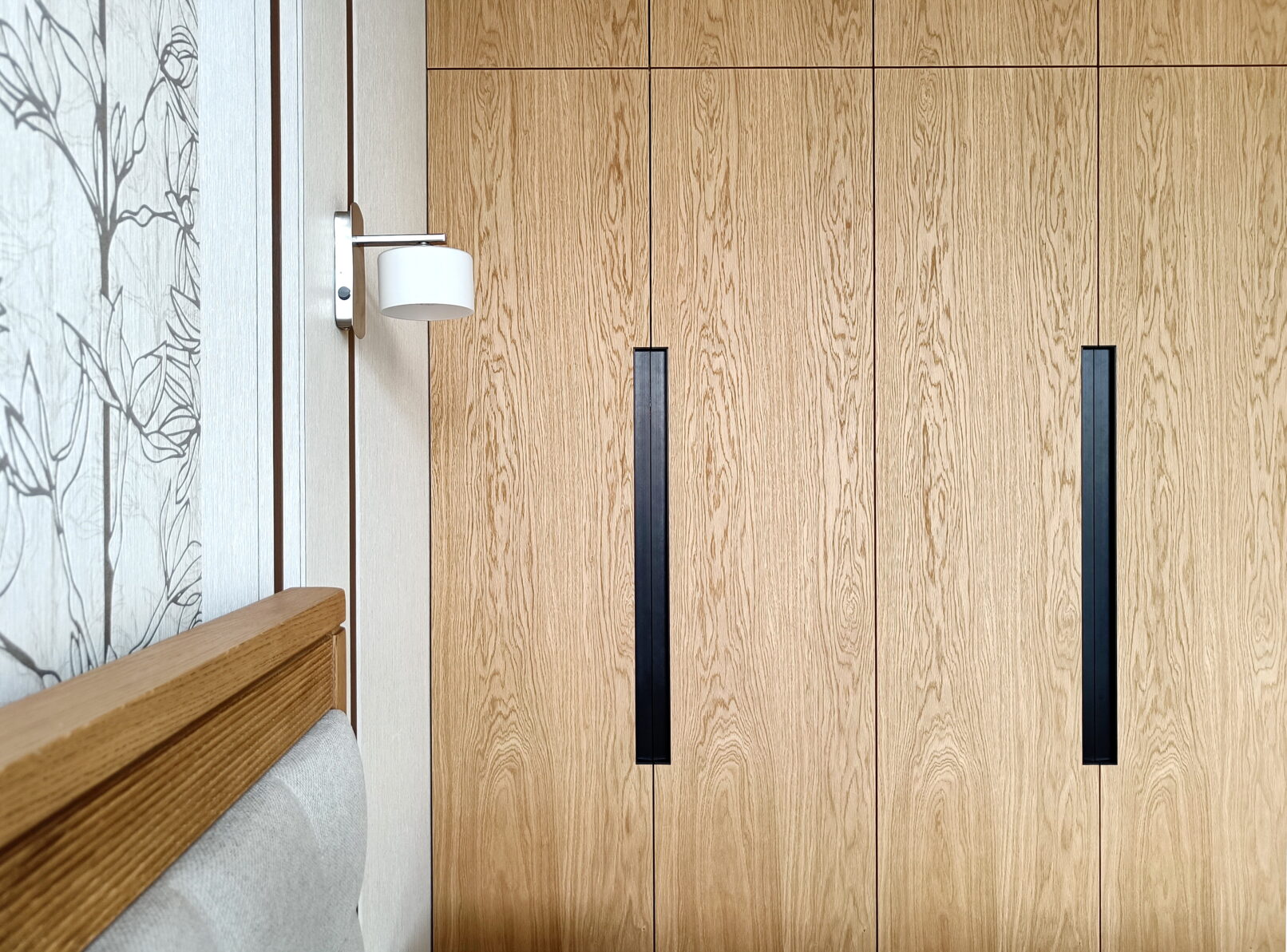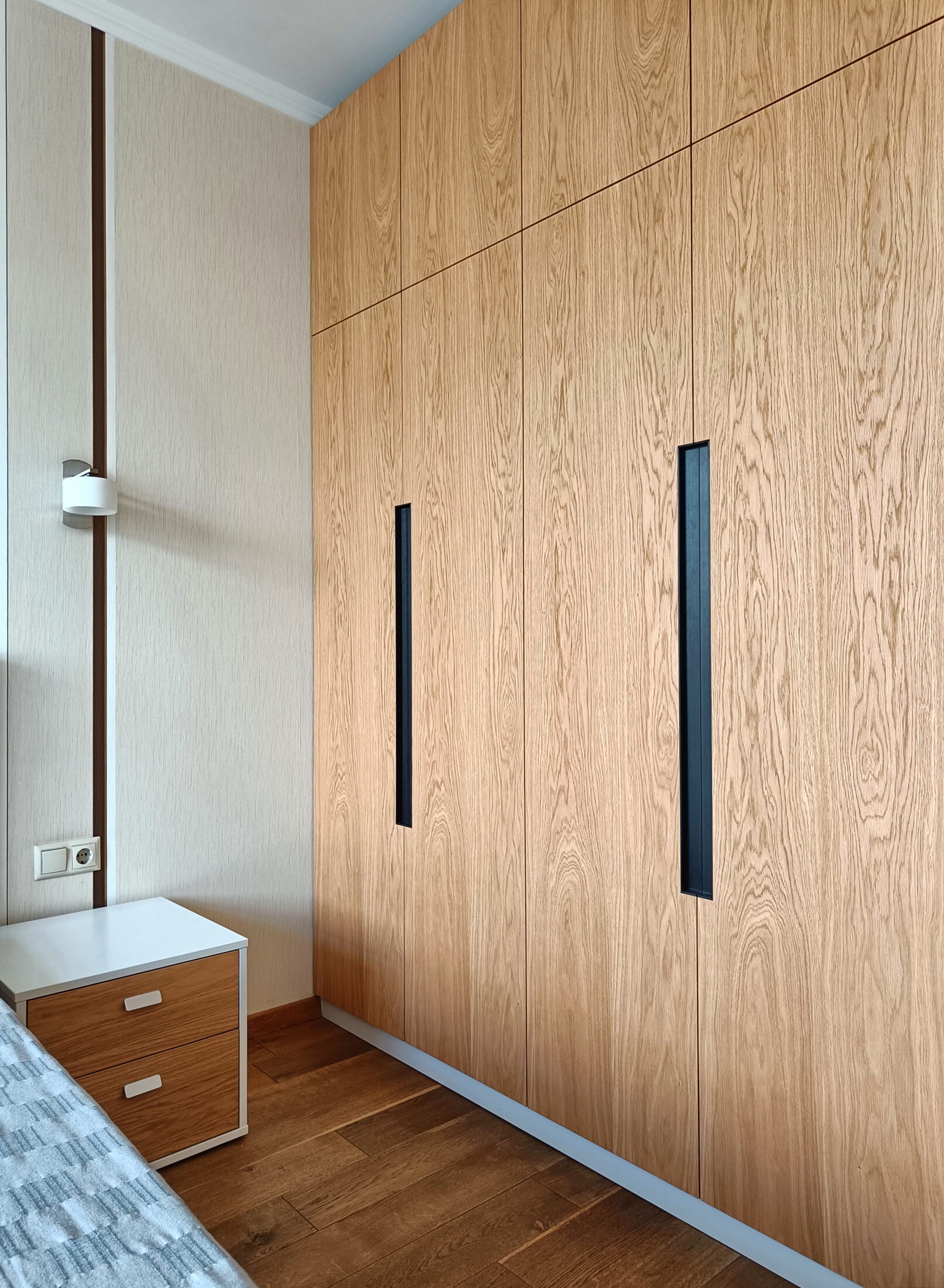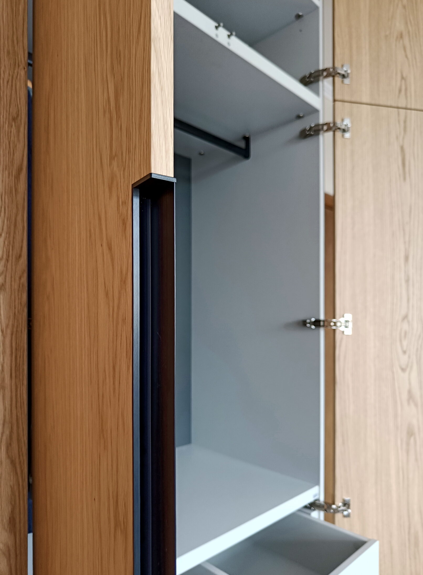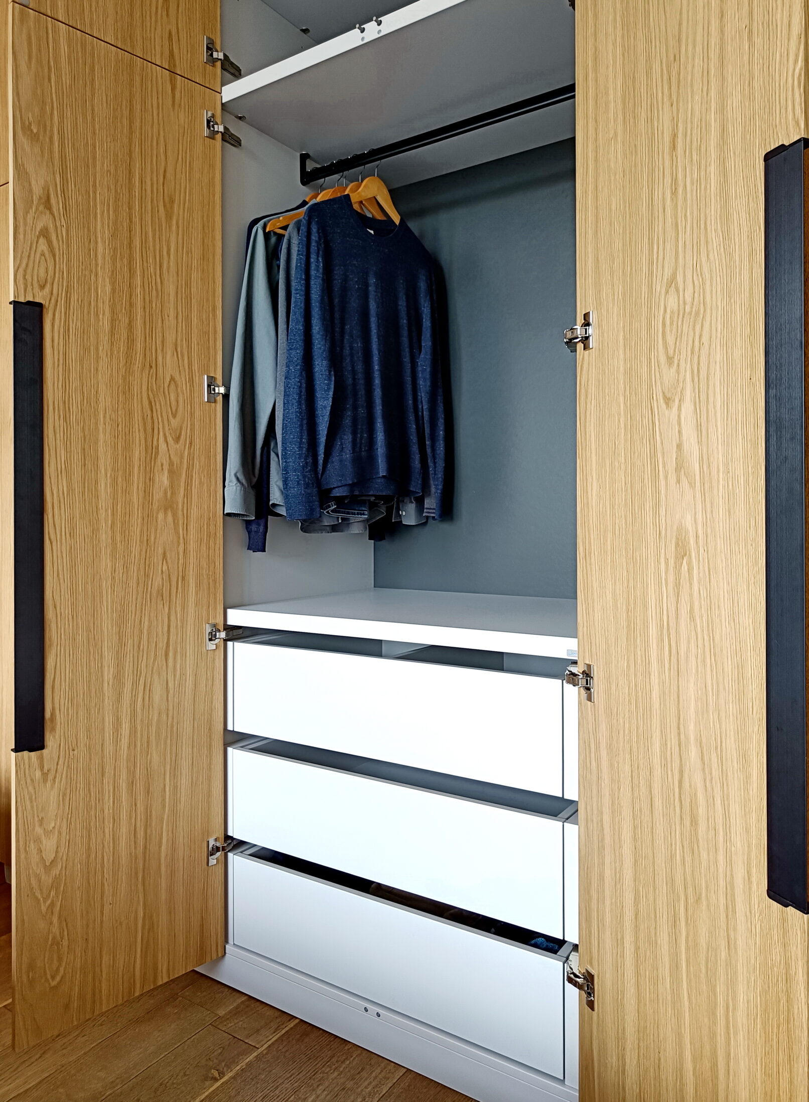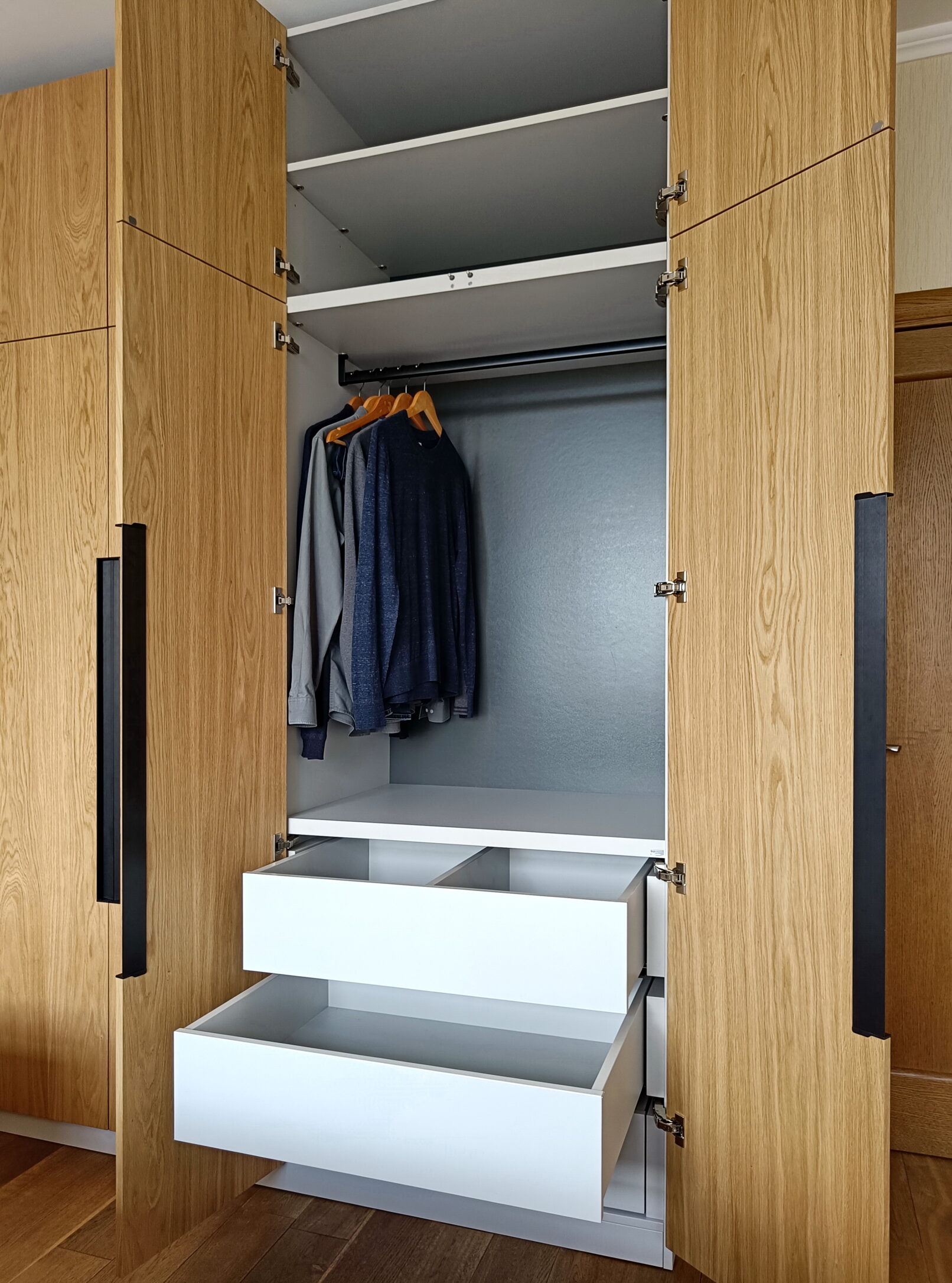 Шпоновані фасади з натурального дуба додають інтер’єру тепла та природності. Живий малюнок деревини з легкими перепадами тону створює глибину та унікальний характер кожного фасаду. Італійські ручки Cosma підкреслюють преміальний стиль, поєднуючи в собі ергономіку та естетику. Така шафа стає не просто місцем для зберігання, а частиною дизайнерського задуму – довговічною, стильною і приємною на дотик.