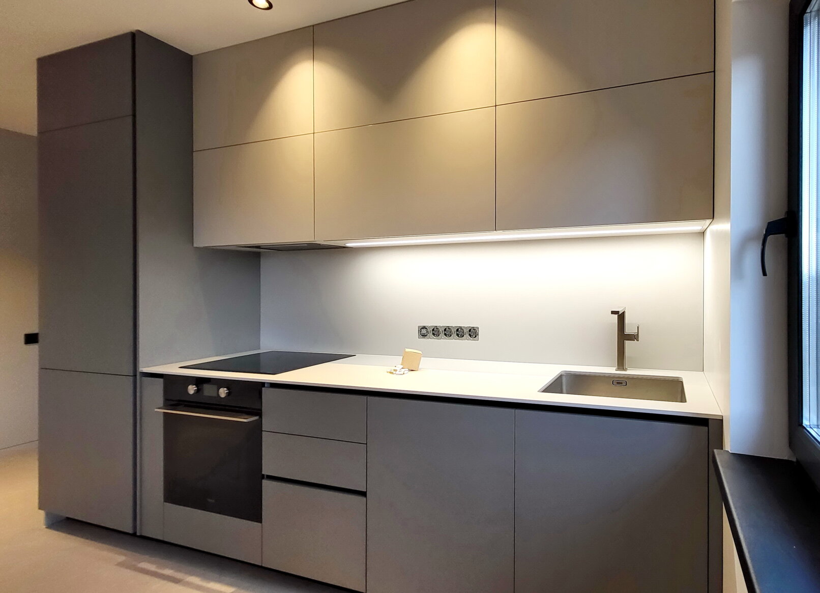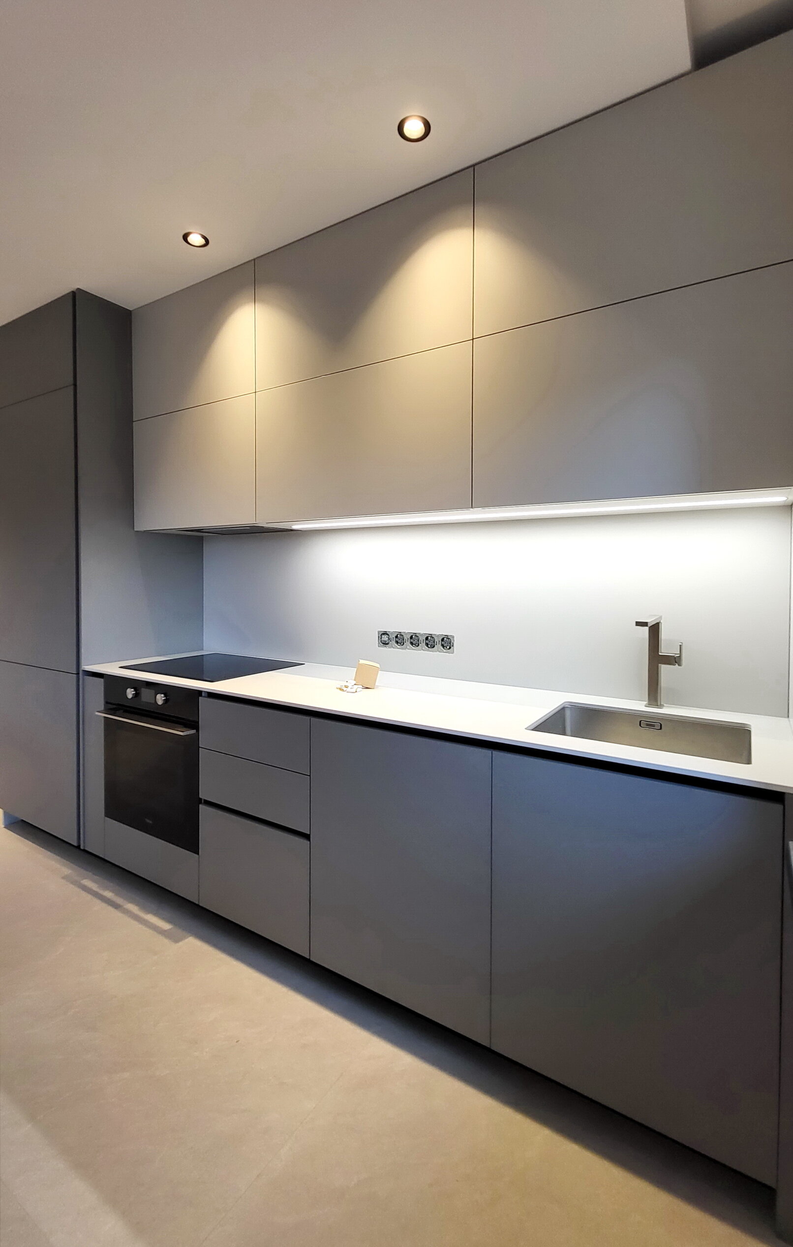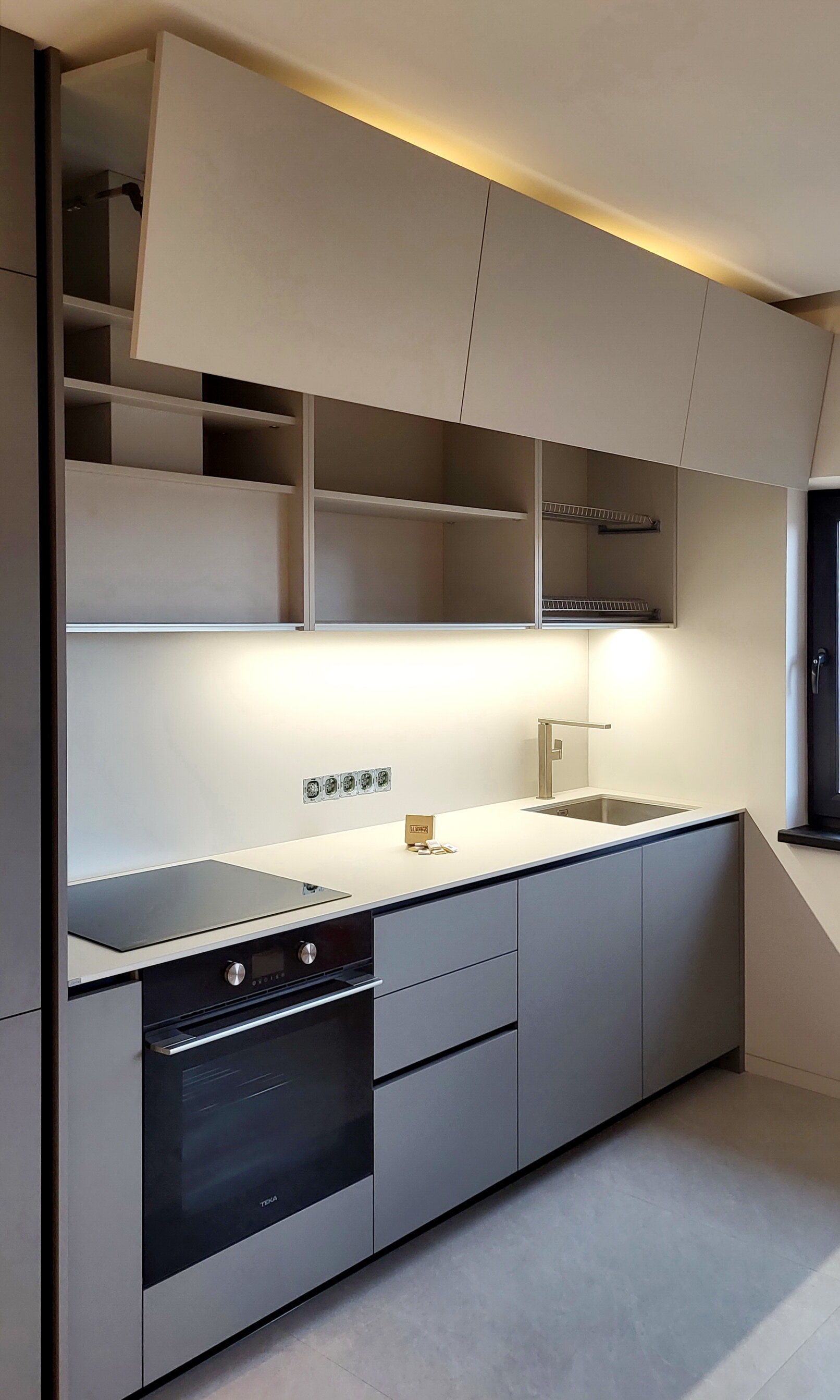 Сіра кухня з фасадами Egger та стільницею і фартухом з HPL Egger- це елегантне та практичне рішення для будь-якого сучасного інтер’єру. Сірий колір фасадів створює нейтральну та спокійну атмосферу. А також мінімізує візуальний шум, налаштовує на приготування смачних страв та сприяє приємним кухонним бесідам.