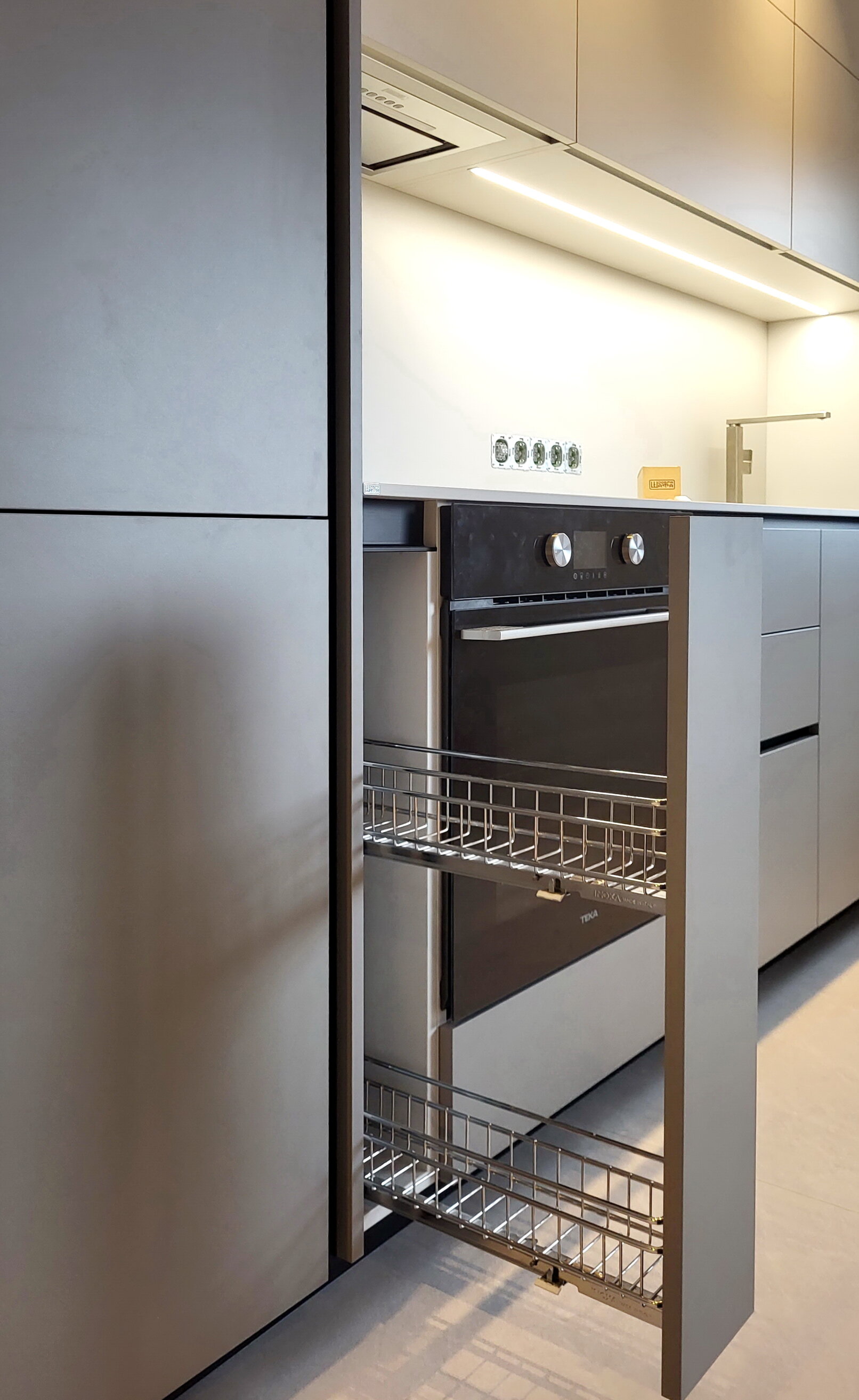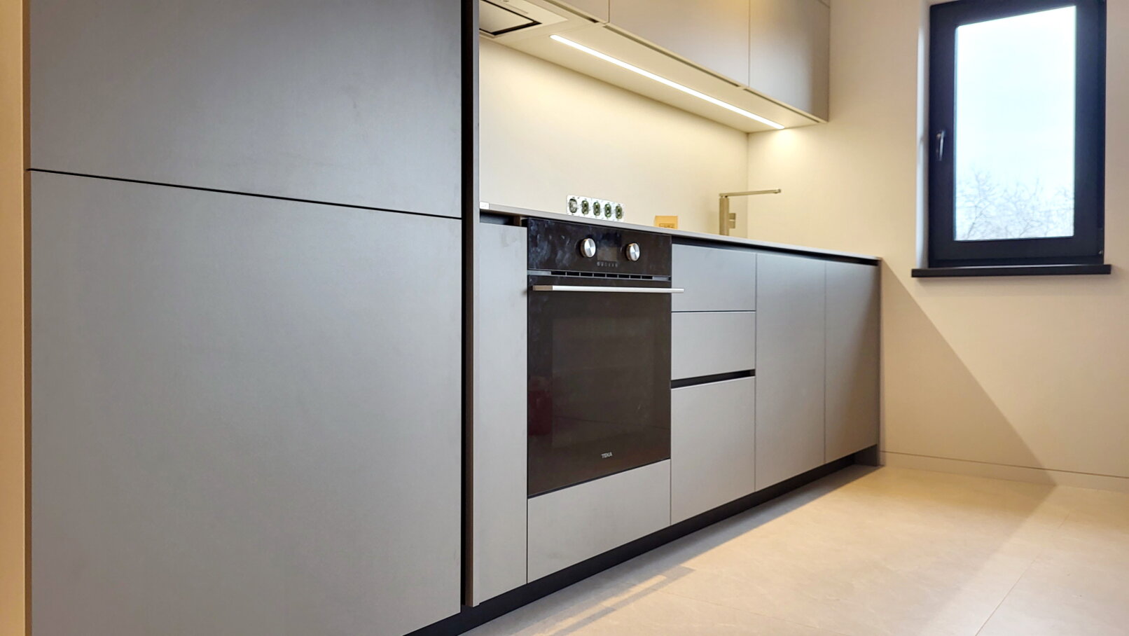 Фасади з ЛДСП Egger, оброблені крайкою ABS із використанням ПУР клею – це дуже міцний та стійкий матеріал. HPL мало деформується під впливом вологи, температури та механічних пошкоджень. Вони легко чистяться та довго зберігають свій первозданний вигляд, тому ви зможете насолоджуватися красою вашої сірої кухні протягом багатьох років.