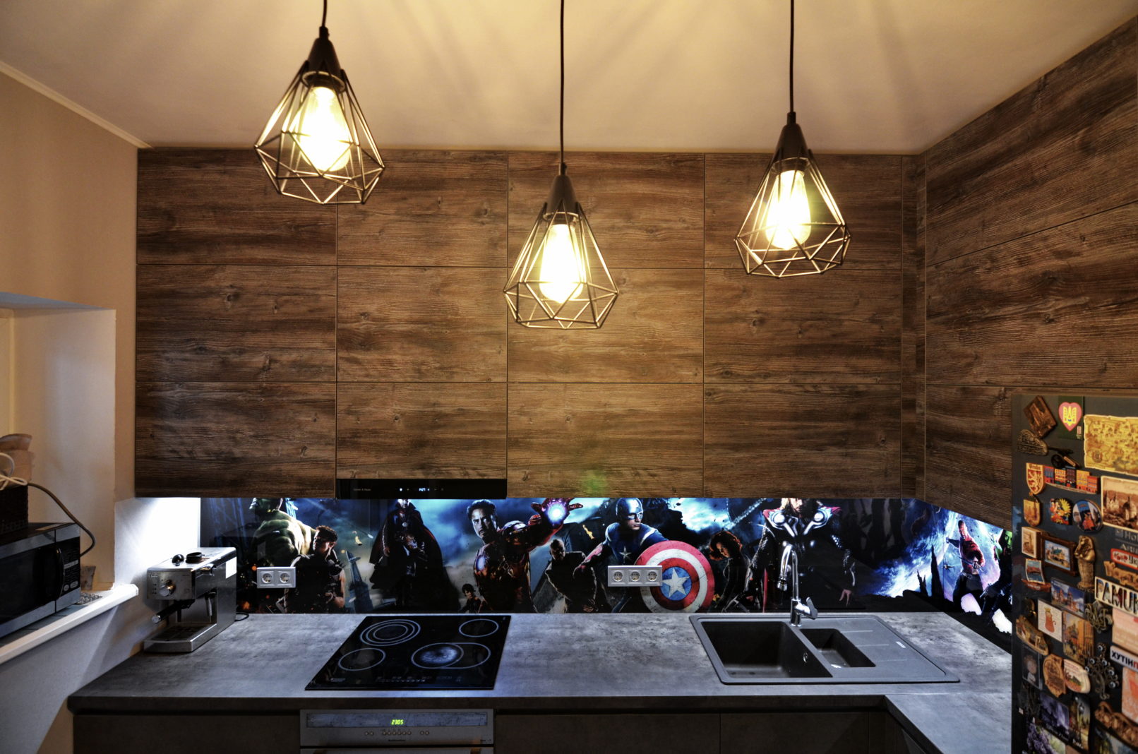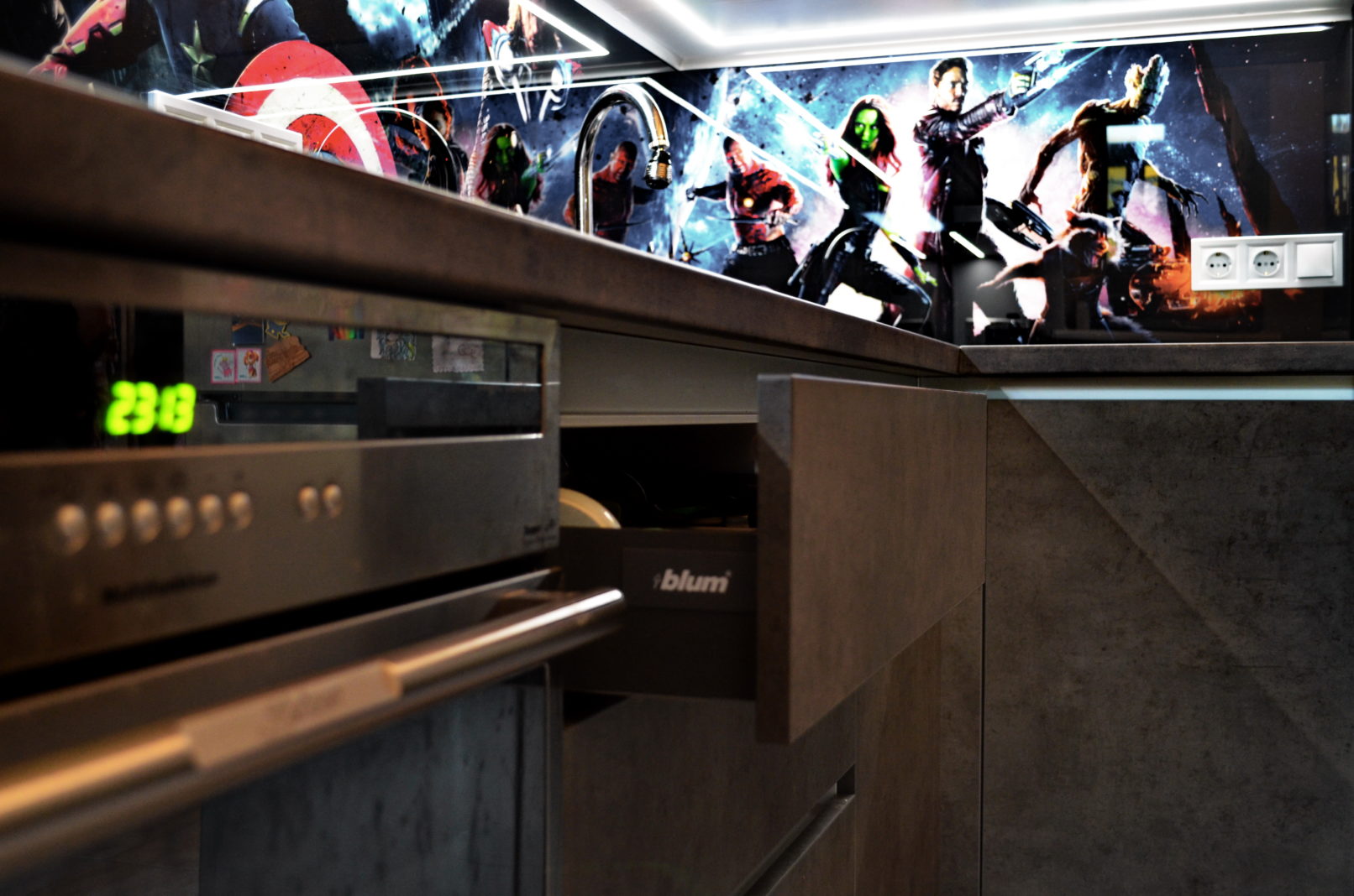 У цій кухні від меблевої майстерні Добра Шафа головна роль належить… супергероям. Скіналі з героями Marvel не просто декорують простір, а створюють настрій і додають драйву щоденним рутинним справам. Основа дизайну – поєднання графітових фасадів, текстури дерева і яскравого глянцю скіналі. Скляна панель стійка до вологи, високих температур і легко миється – це ідеальне рішення для активної сім’ї з дітьми або фанів Marvel. Підйомні механізми Blum, інтегроване LED-підсвічування і продумана ергономіка роблять кухню не лише ефектною, а й функціональною.