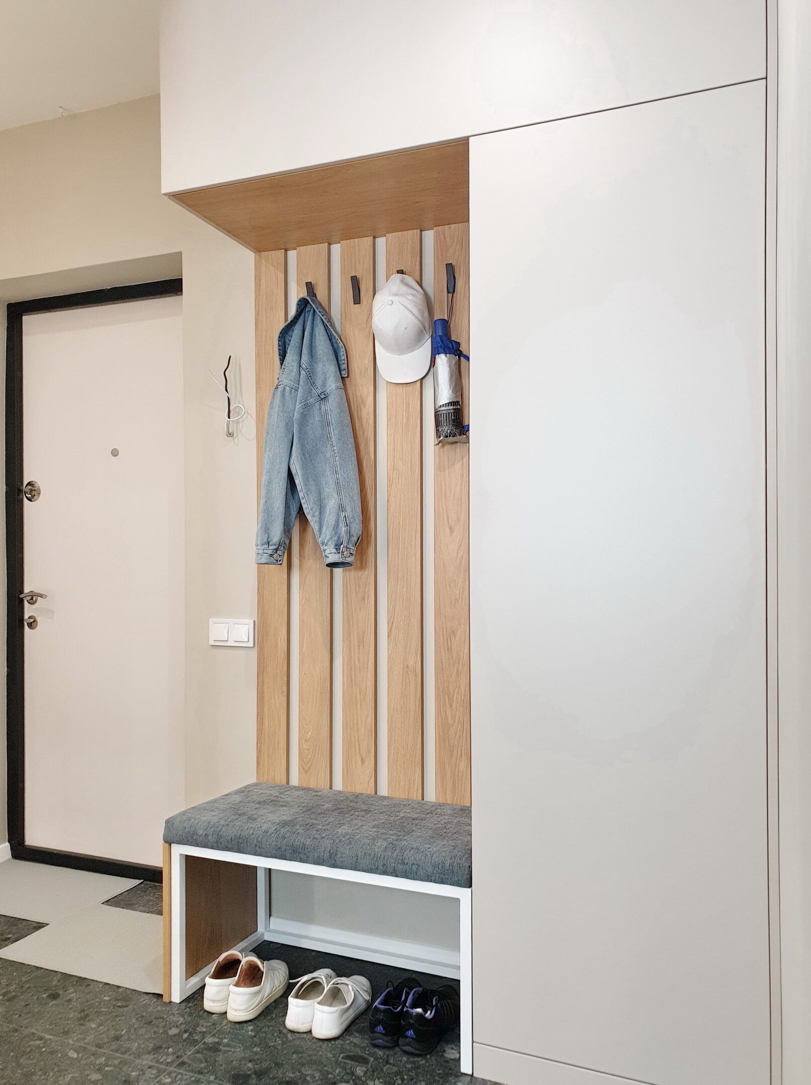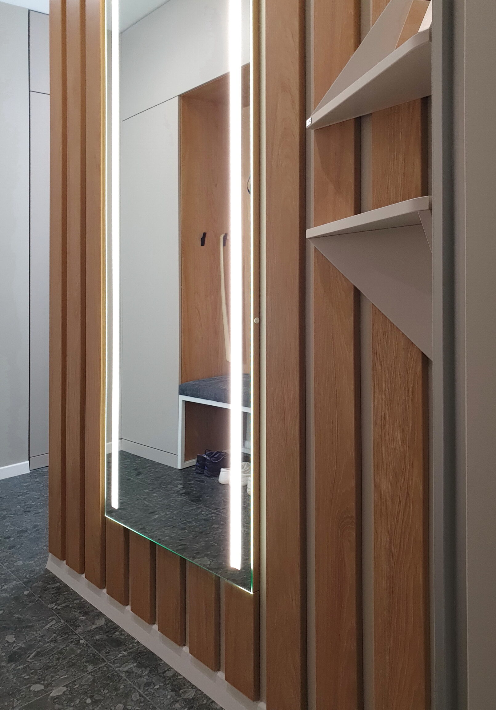Сучасний передпокій на замовлення – це не просто шафа й вішалка, а продумане рішення для щоденного комфорту. Декоративні вертикальні планки з дерева створюють стильний акцент, а м’яке сидіння робить перевзування зручним. Дзеркало з підсвіткою додає світла та візуально розширює простір. Вбудована шафа приховує навіть електрощиток, завдяки чому інтер’єр виглядає акуратно. Такий передпокій приклад поєднання сучасного дизайну й функціональності.