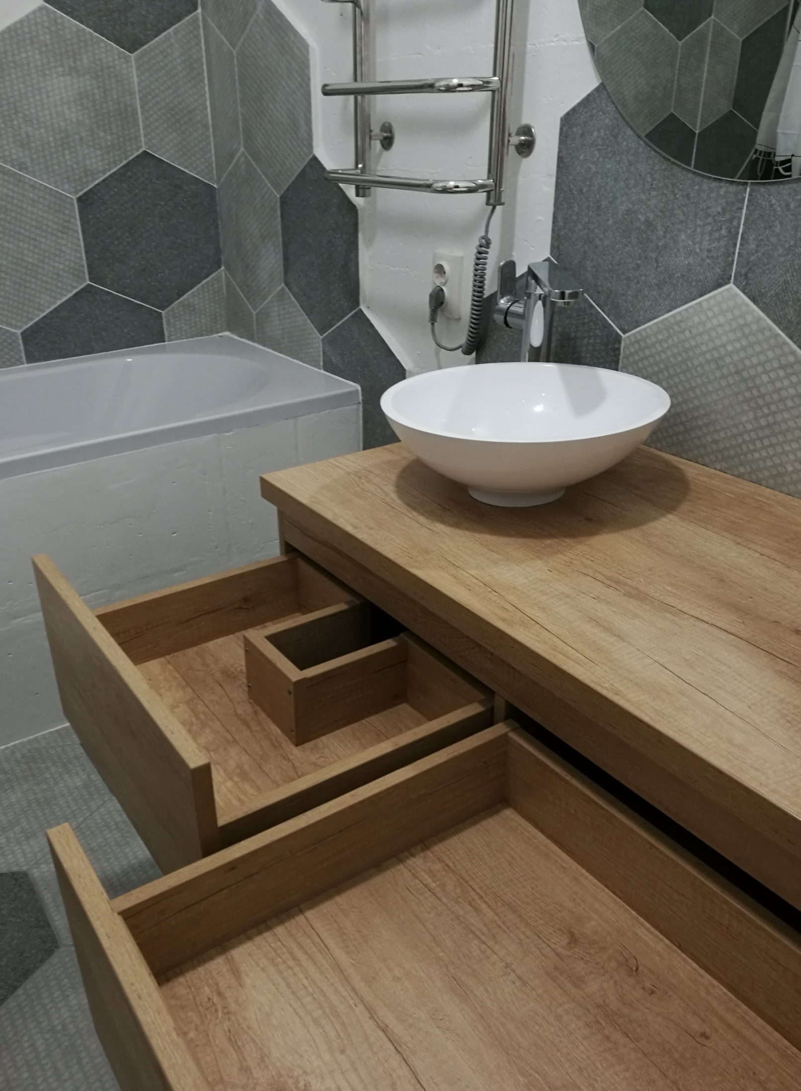 У ванній важливо не просто сховати речі, а зробити це з комфортом і без зайвих нервів. Саме тому ми спроєктували цю тумбу з максимально практичним розміщенням шухляд і продуманим доступом до сифона.