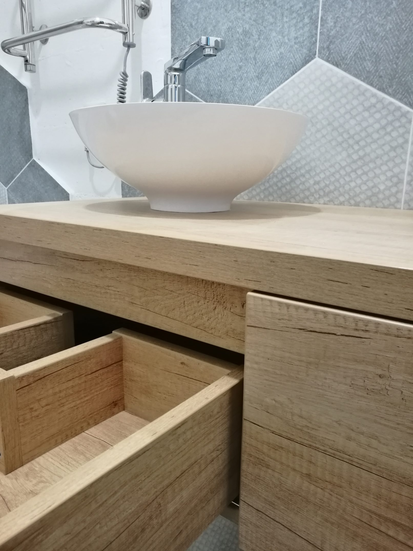 Жодних компромісів: висувні механізми працюють м’яко й точно, а внутрішні перегородки дозволяють зберігати все – від фену до аптечки – без хаосу. Матова поверхня під дерево додає тепла, а волога їй не страшна. Ви не просто купуєте меблі в ванну – ви отримуєте спокій і порядок щоранку.