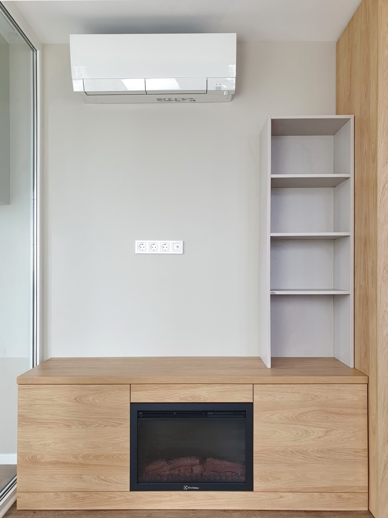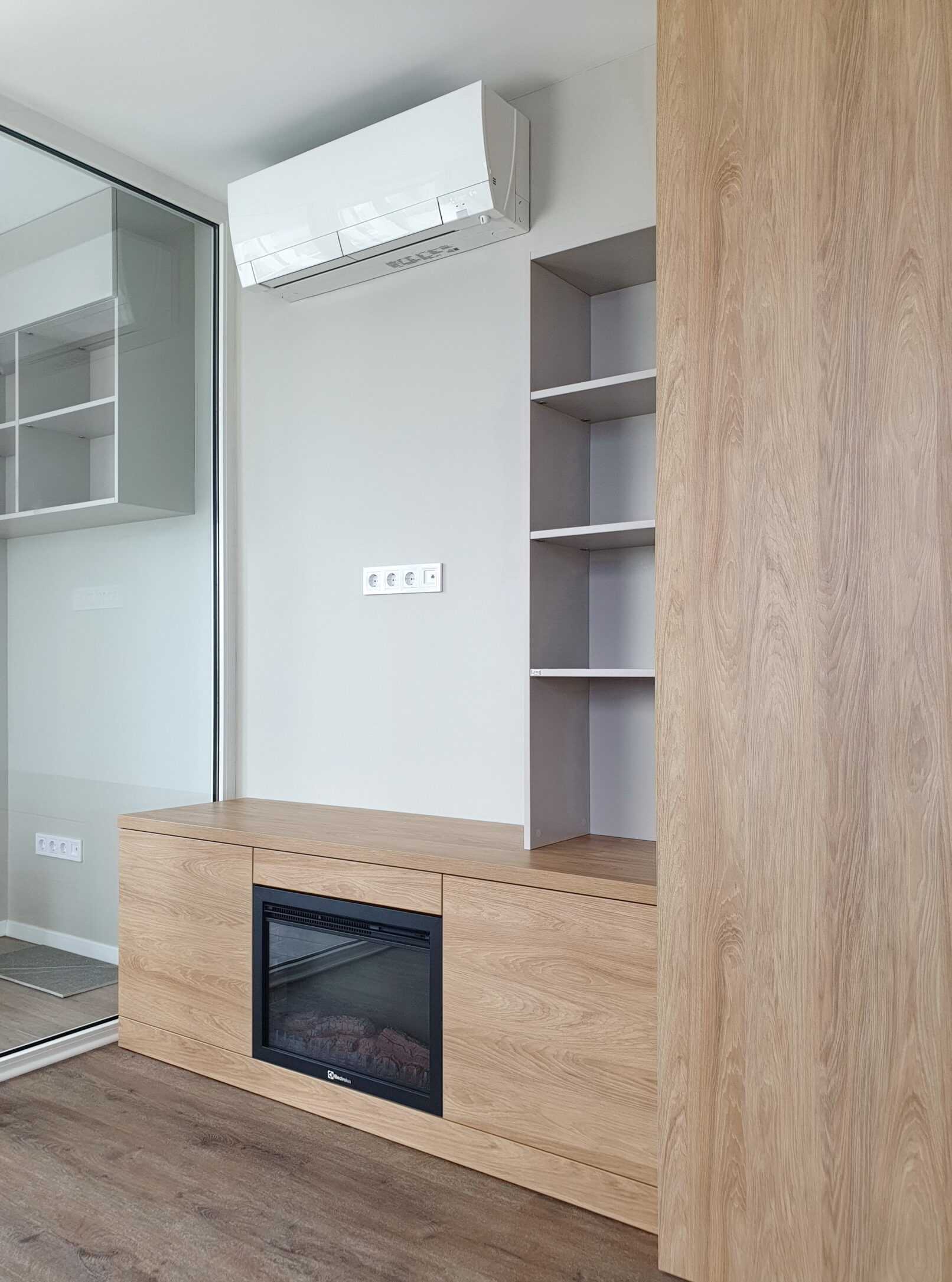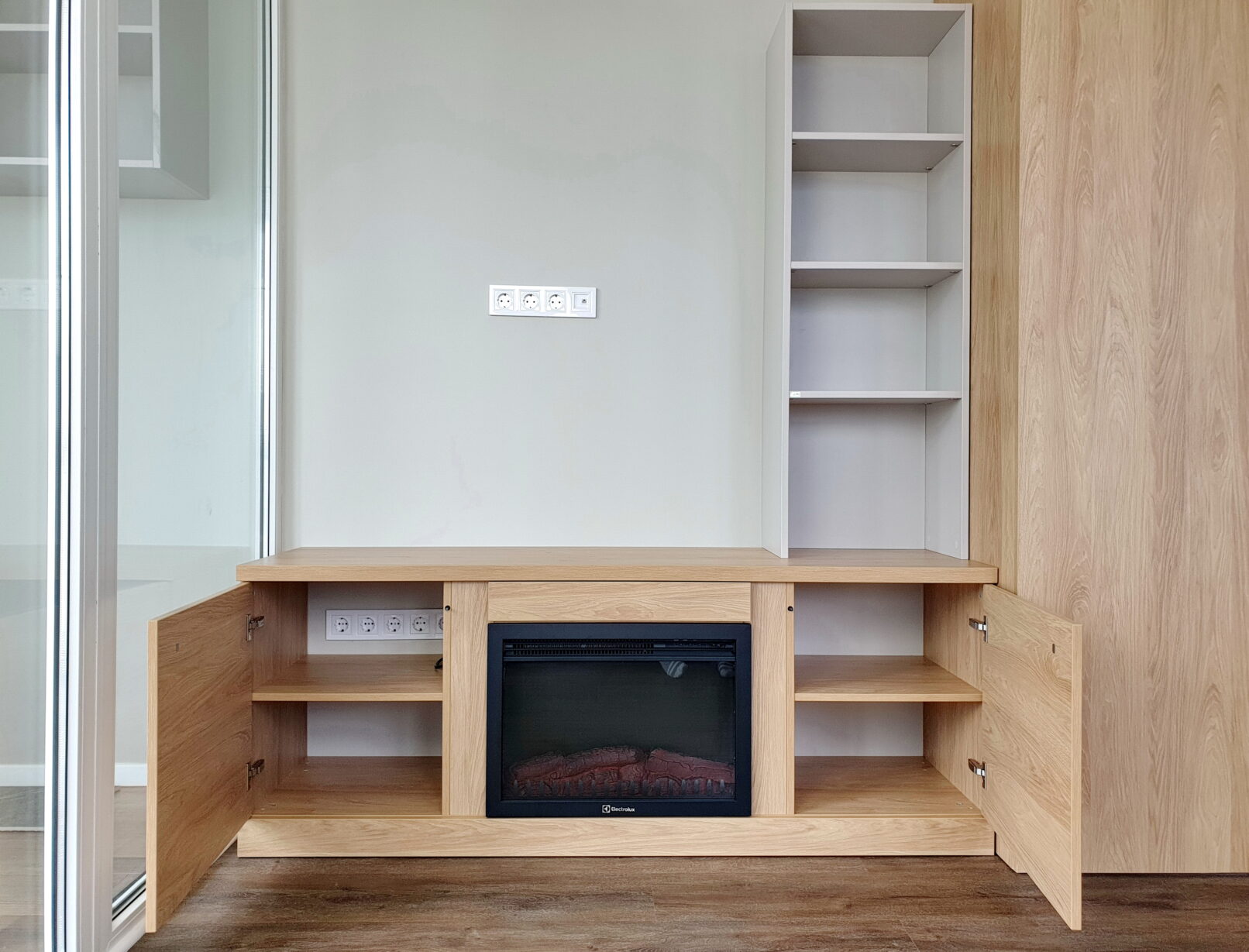 Сучасна вітальня з каміном і телевізором стає не лише функціональною, а й атмосферною. Вбудований електричний камін інтегрований у меблеву конструкцію – це рішення, яке економить простір та додає тепла інтер’єру. Завдяки мінімалістичному дизайну тумба виглядає стильно, а натуральна текстура дерева підкреслює затишок кімнати. Камін працює безпечніше за класичний варіант, його можна вмикати у будь-який час, насолоджуючись імітацією живого полум’я. Поєднання з телевізором робить композицію центром вітальні місцем для відпочинку та сімейних вечорів.