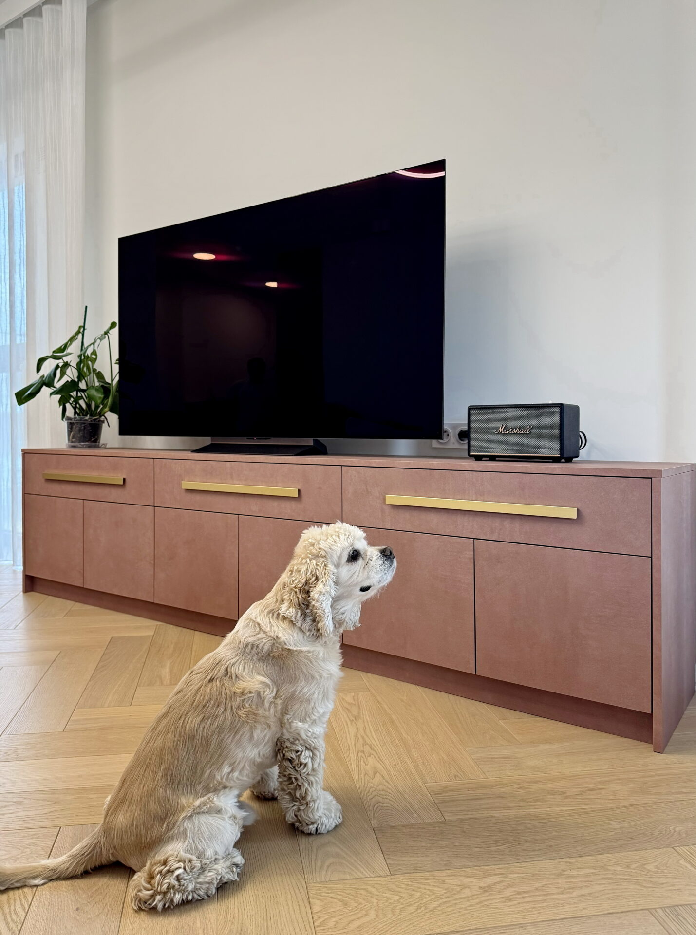 Тумби під телевізор бувають різними – усе залежить від простору. Для цього замовника ми створили два рішення. Перше, це вузька підвісна консольна тумба, інтегрована в шафу. Її зробили для кімнати, де бракувало місця: конструкція не торкається підлоги, виглядає легко та охайно. Натуральна текстура дерева додає тепла, а довгі золоті ручки оживляють спокійну гаму інтер’єру.