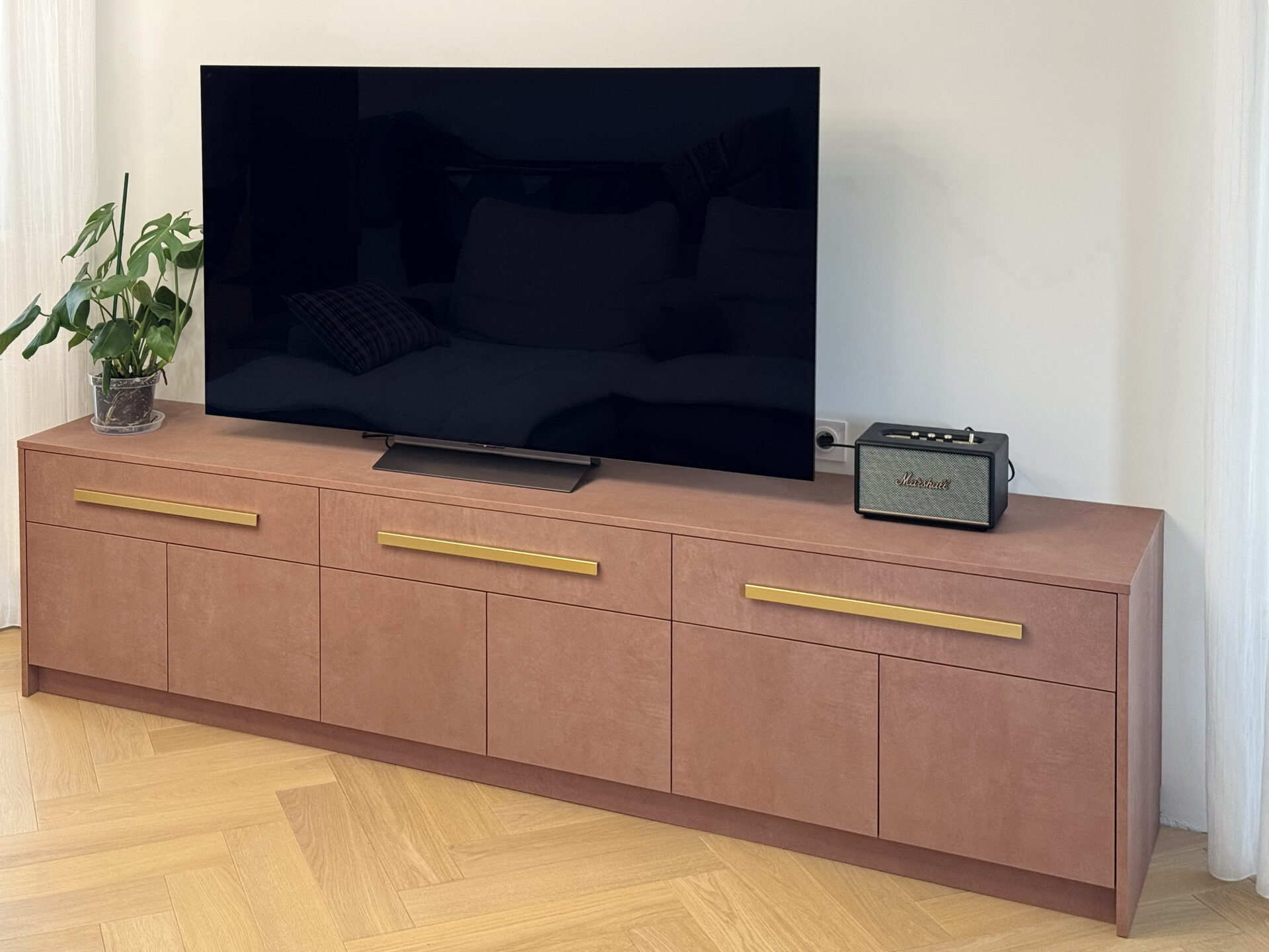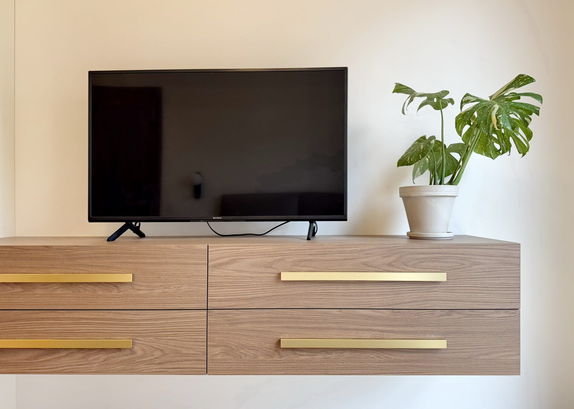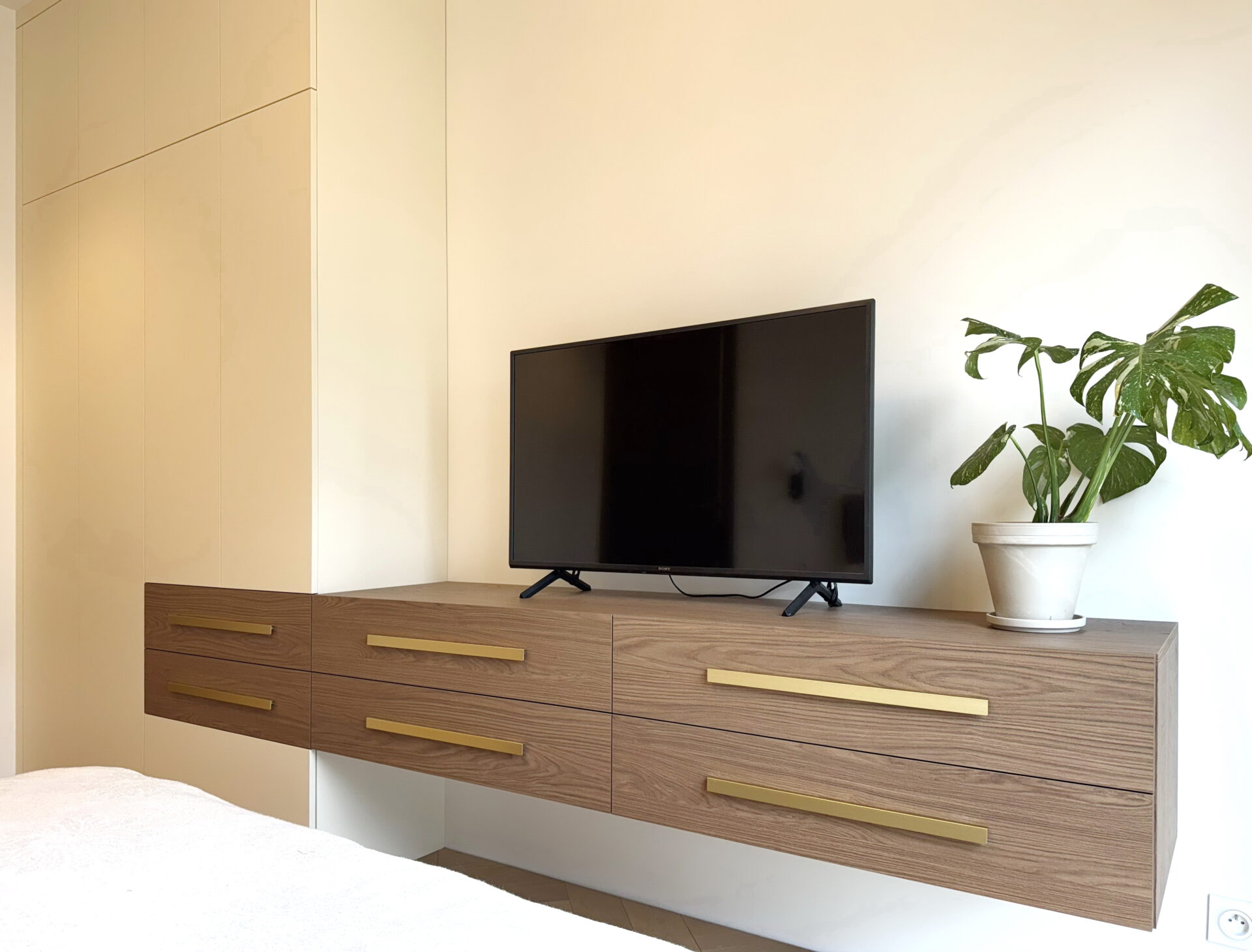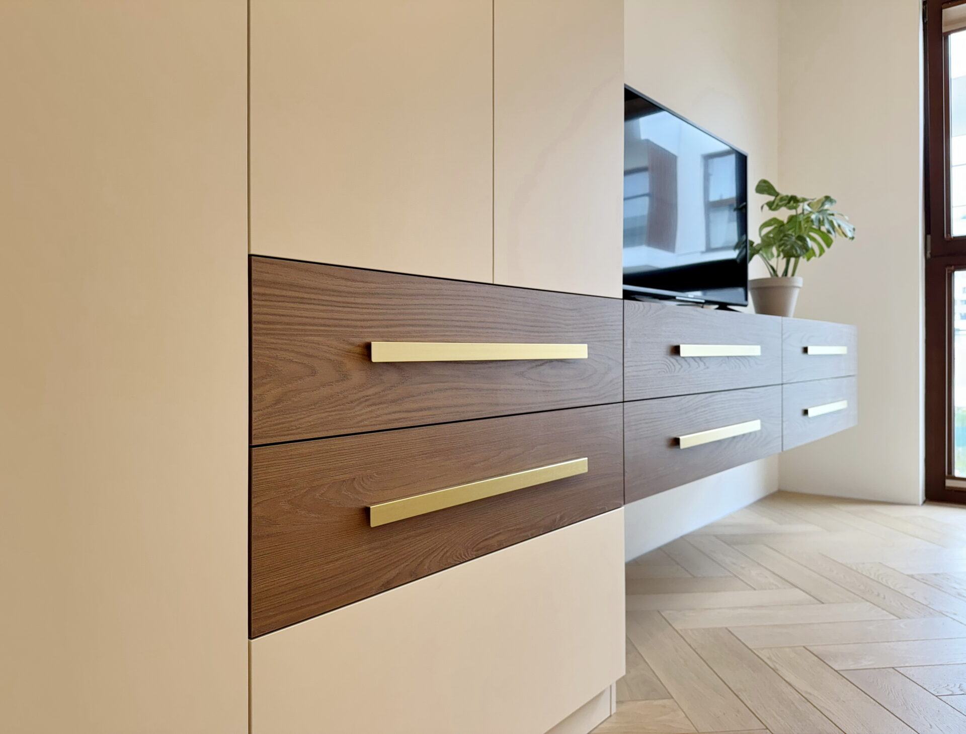 Тумби під телевізор бувають різними – усе залежить від простору. Для цього замовника ми створили два рішення. Перше, це вузька підвісна консольна тумба, інтегрована в шафу. Її зробили для кімнати, де бракувало місця: конструкція не торкається підлоги, виглядає легко та охайно. Натуральна текстура дерева додає тепла, а довгі золоті ручки оживляють спокійну гаму інтер’єру.