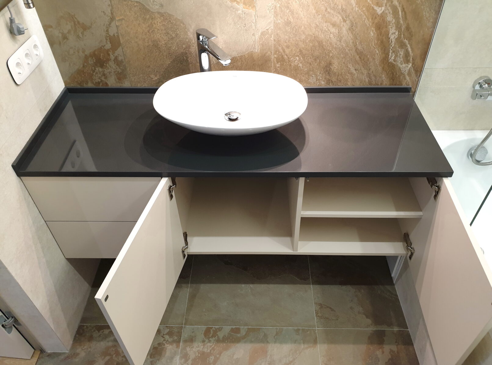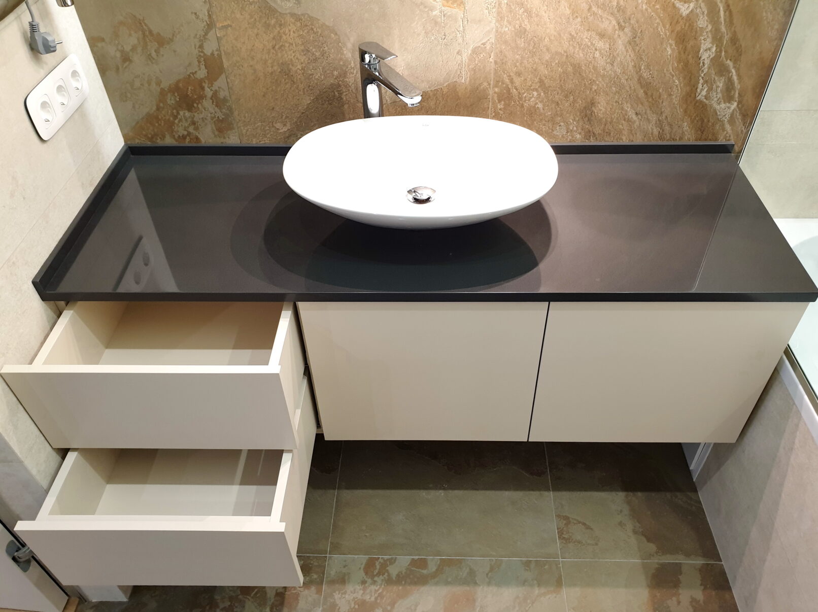 Тумба виготовлена на замовлення за точними розмірами, щоб максимально зберегти простір у ванній.