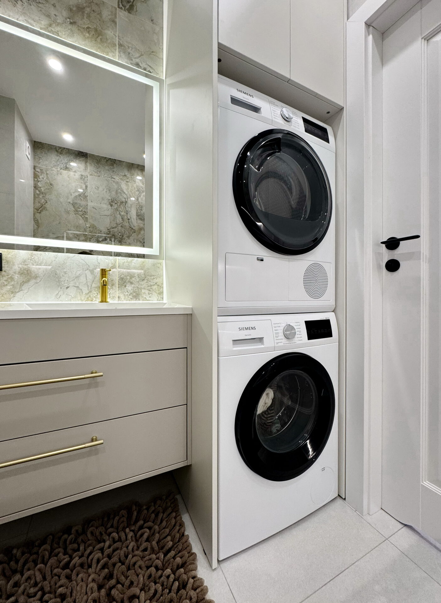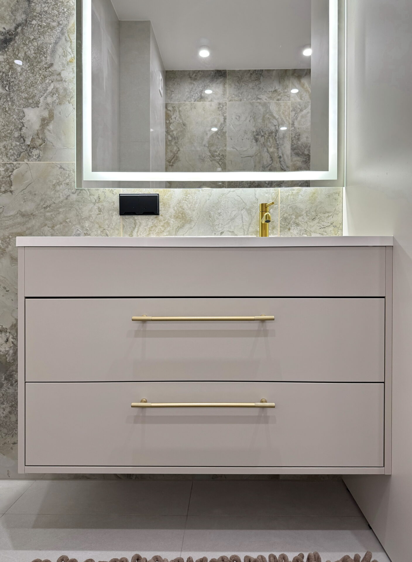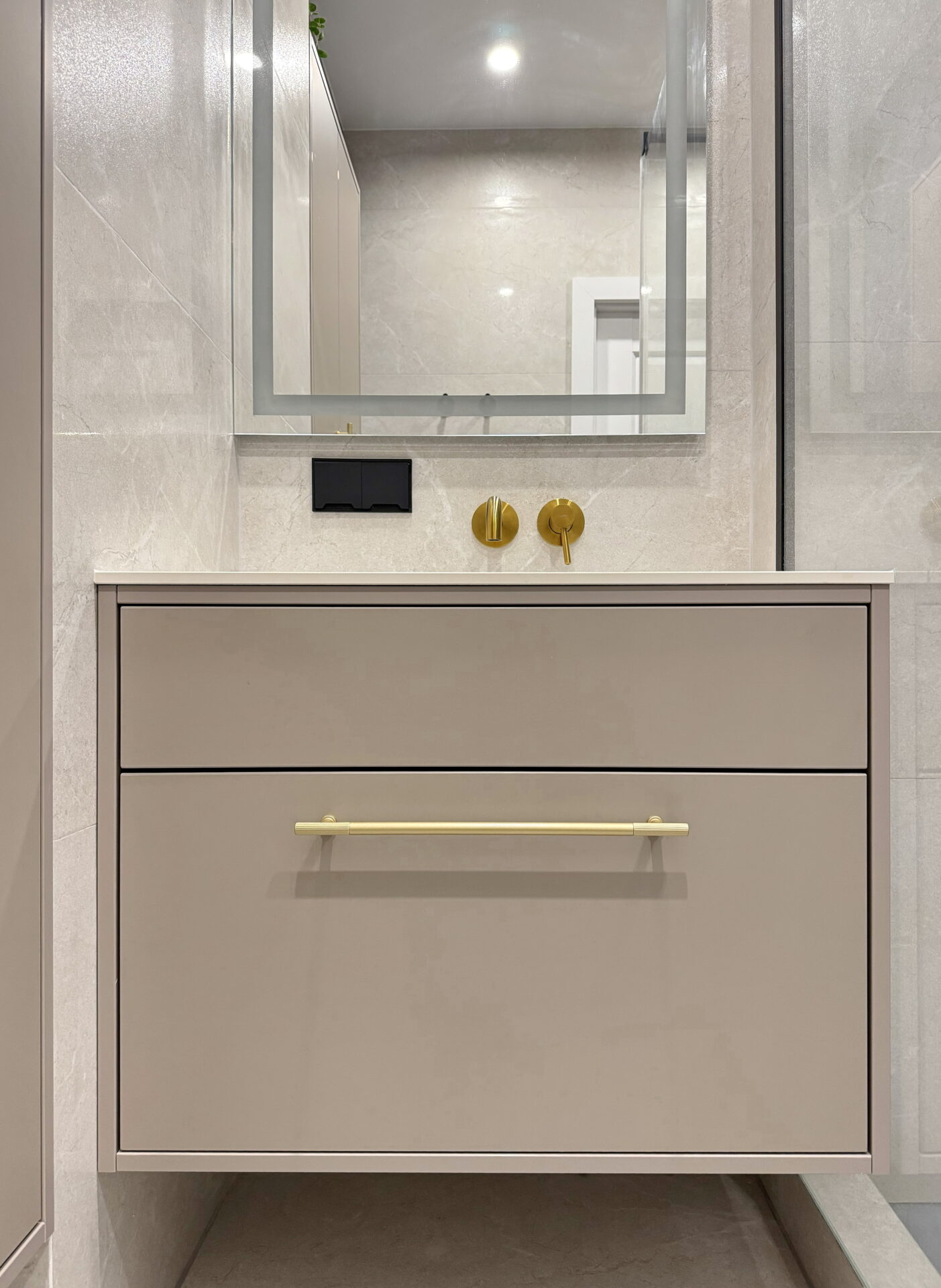 Фурнітура Blum забезпечує плавний хід шухляд, надійну фіксацію та безшумне закриття, що критично важливо для ванної, де меблі працюють щодня під навантаженням. Підвісне кріплення тумб дозволяє підтримувати чистоту під ними та візуально «полегшує» простір.