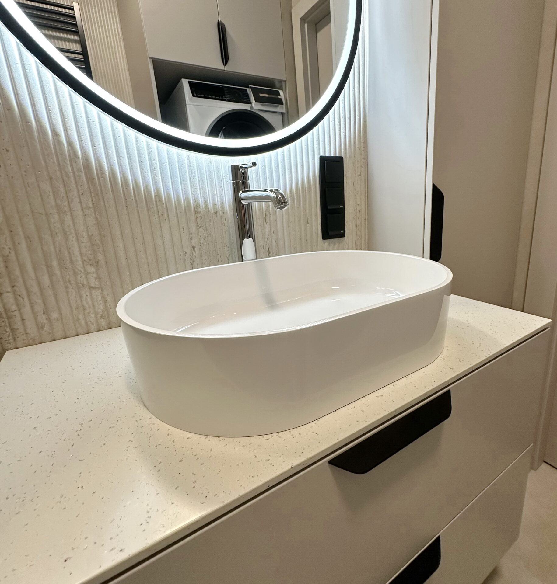 Фурнітура Blum забезпечує плавний хід шухляд, надійну фіксацію та безшумне закриття, що критично важливо для ванної, де меблі працюють щодня під навантаженням. Підвісне кріплення тумб дозволяє підтримувати чистоту під ними та візуально «полегшує» простір.